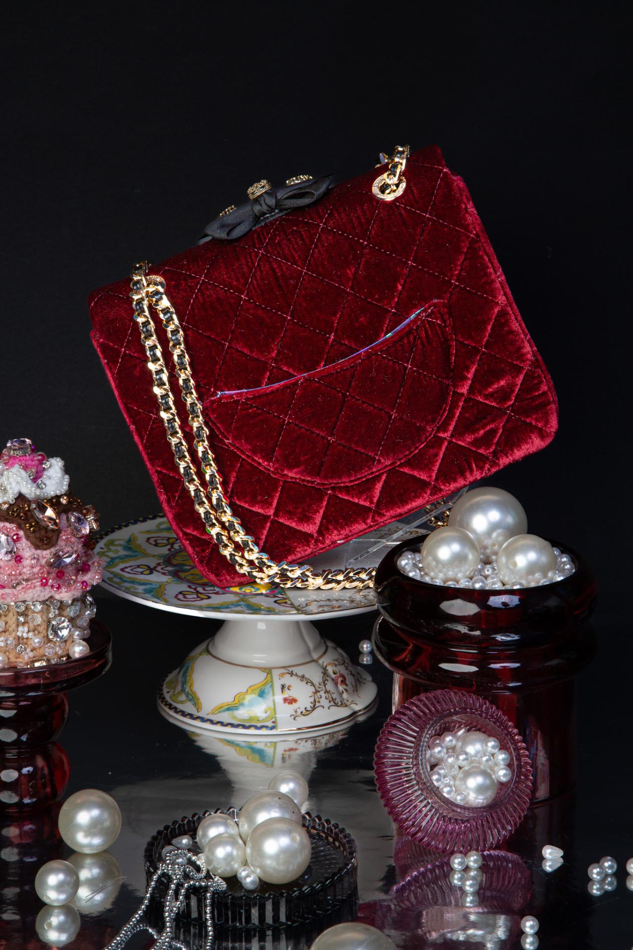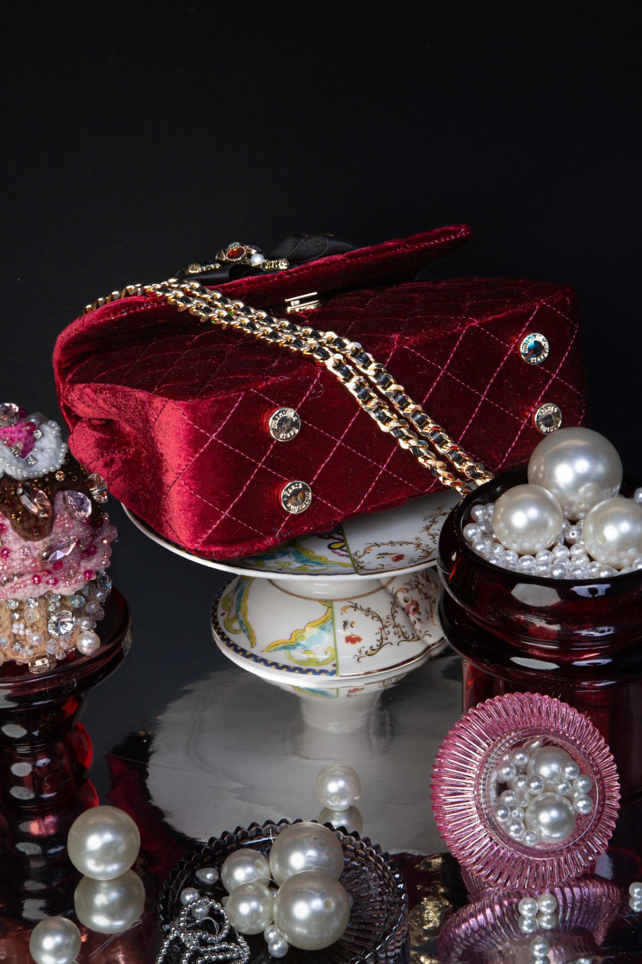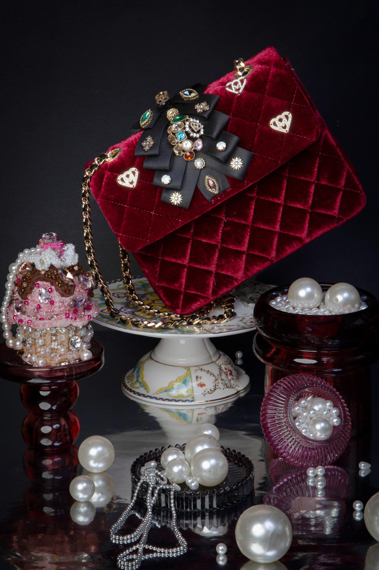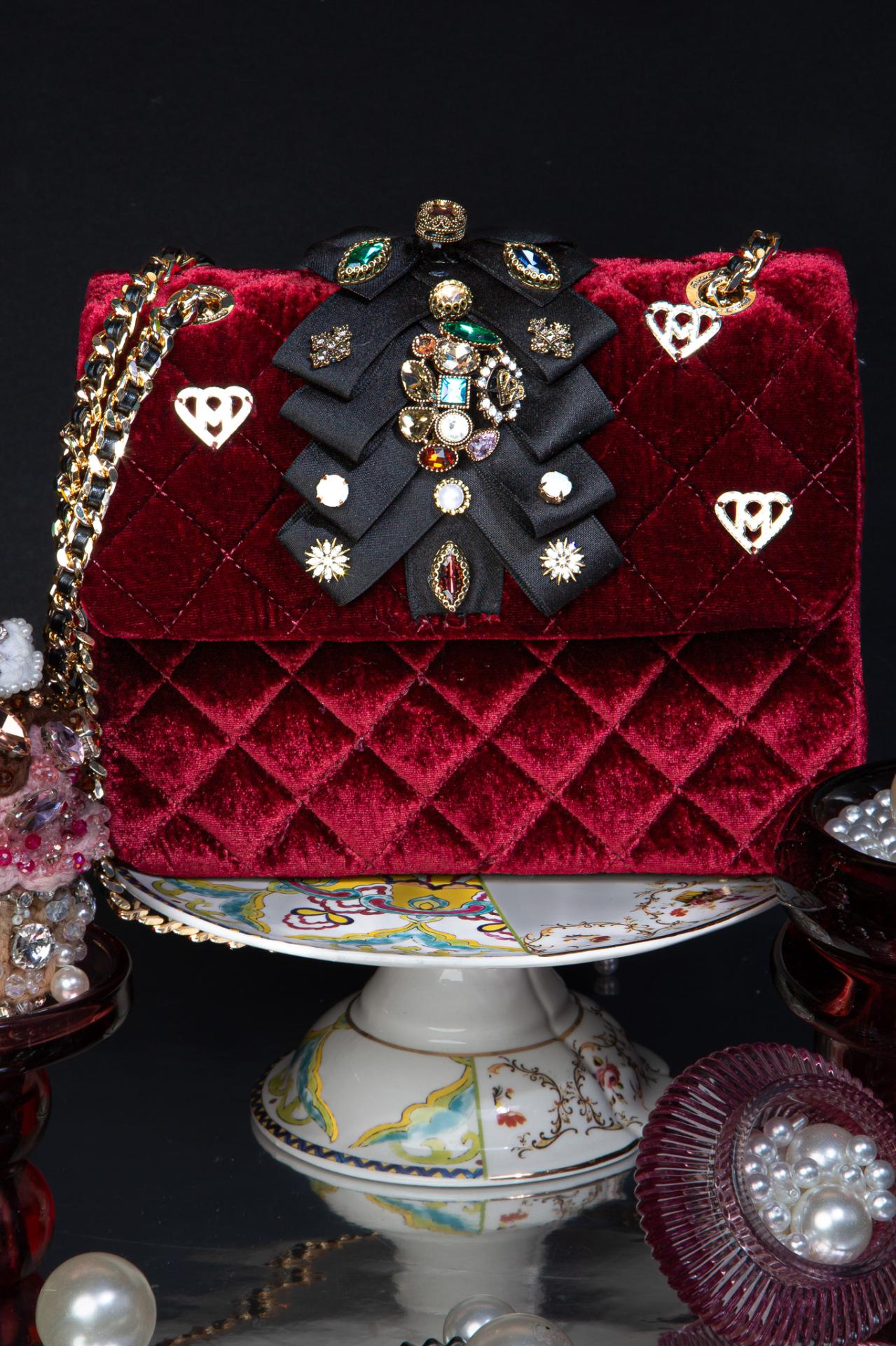 Quilted velvet mini bag with a jeweled bow and gold heart emblems.