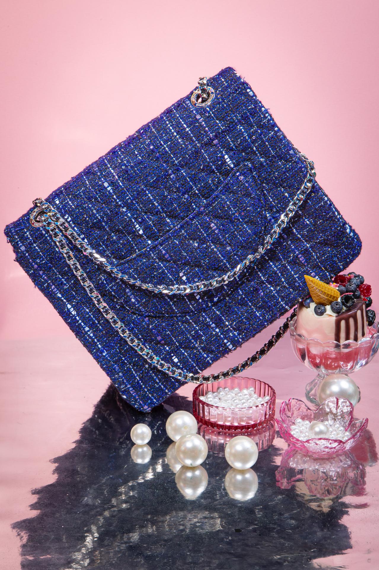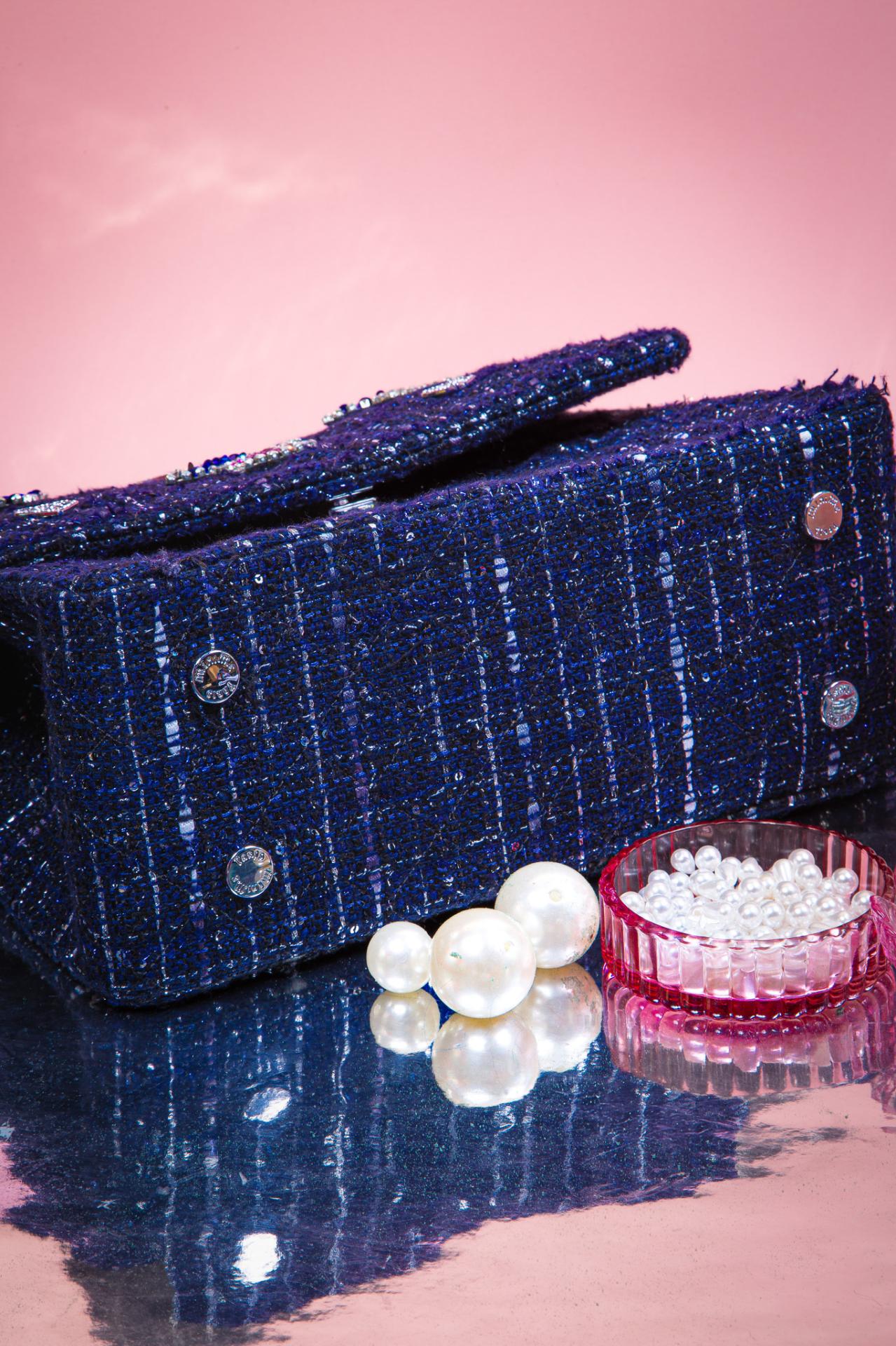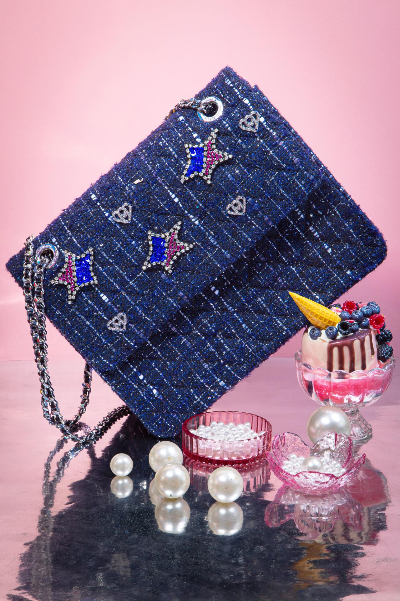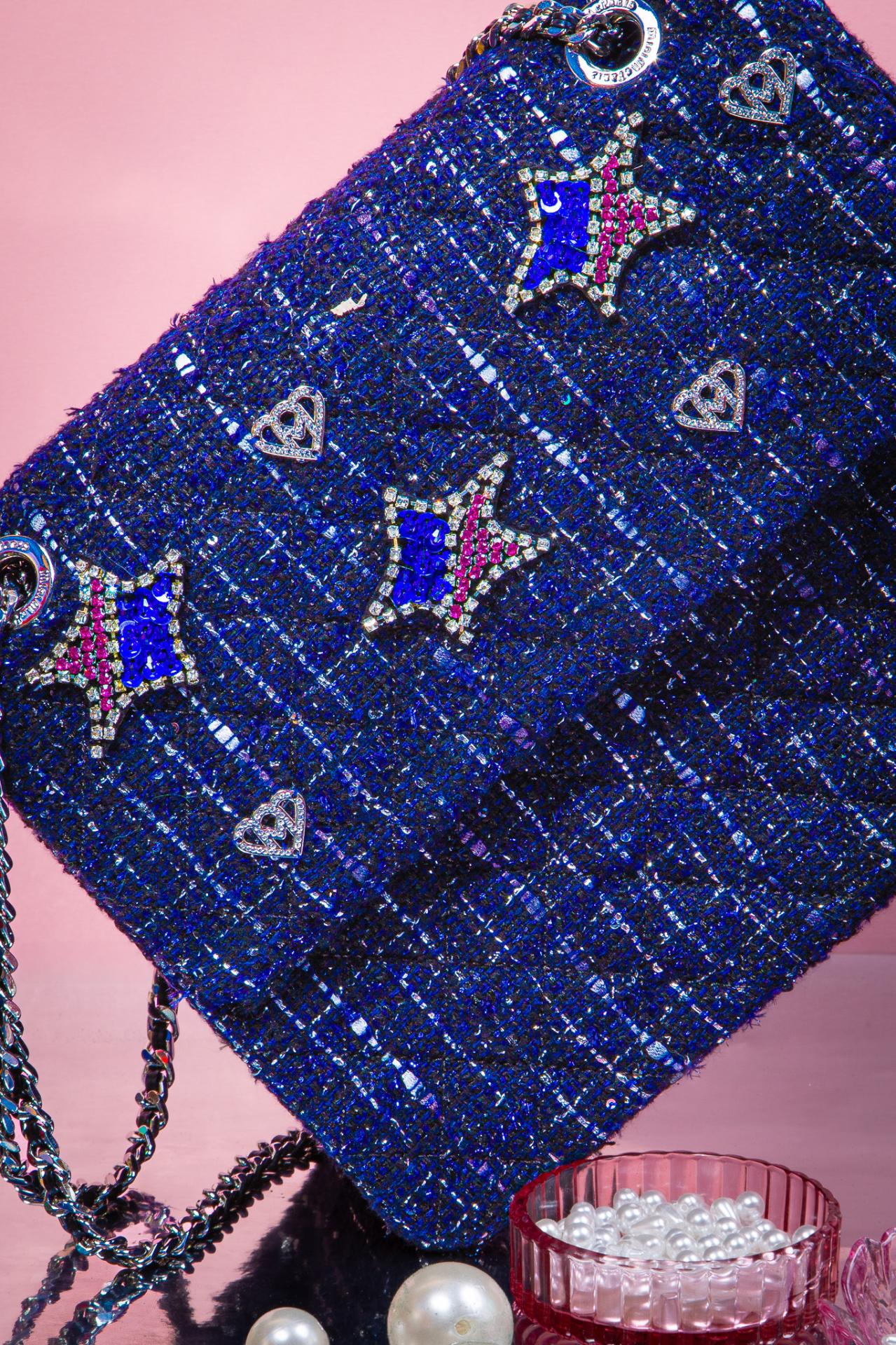 Glitter tweed, galaxy sparkle, rhinestone stars, a cosmic crush in bag form.
