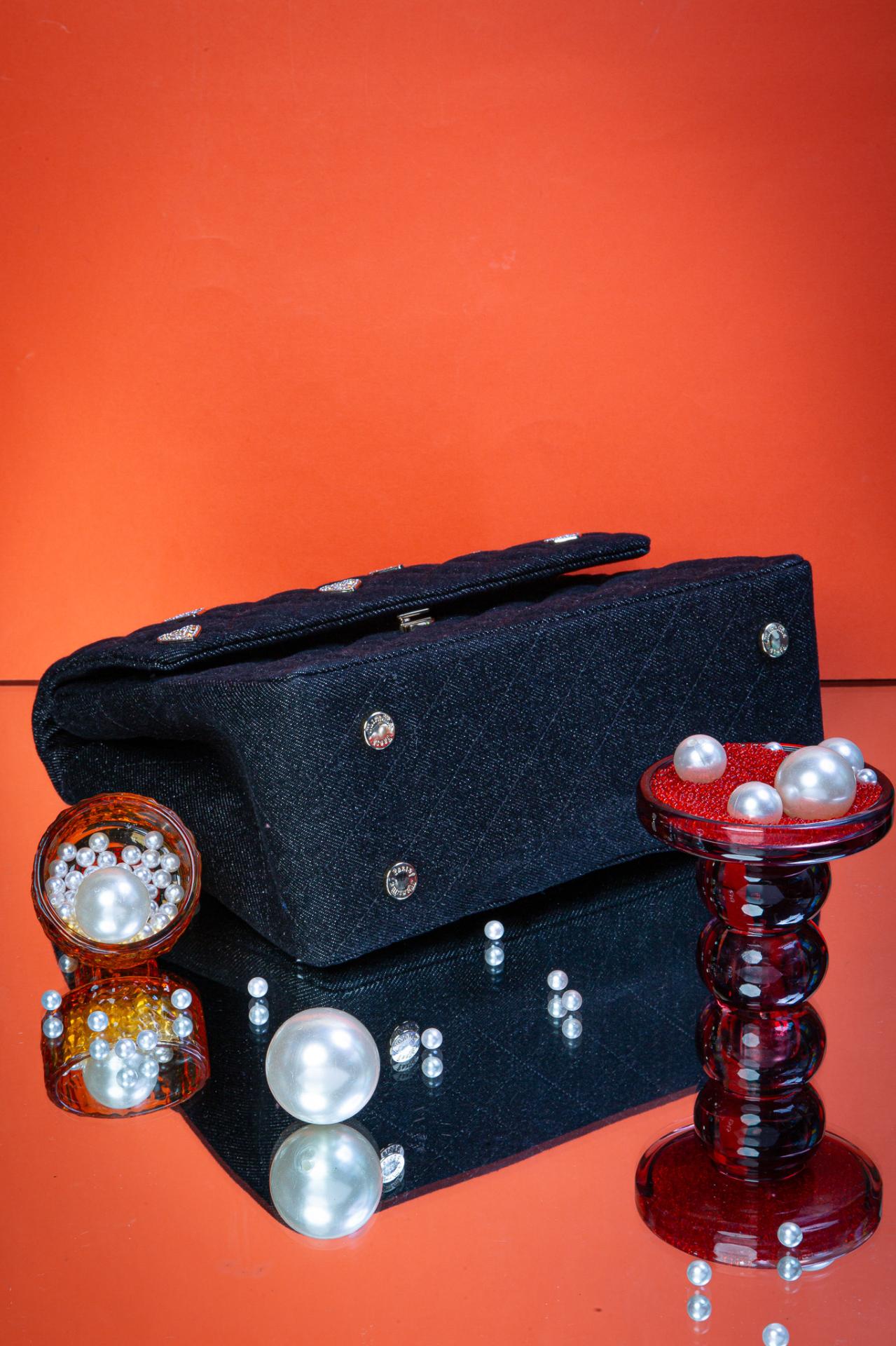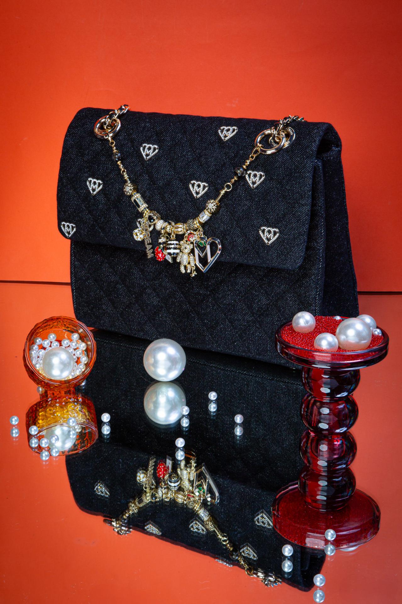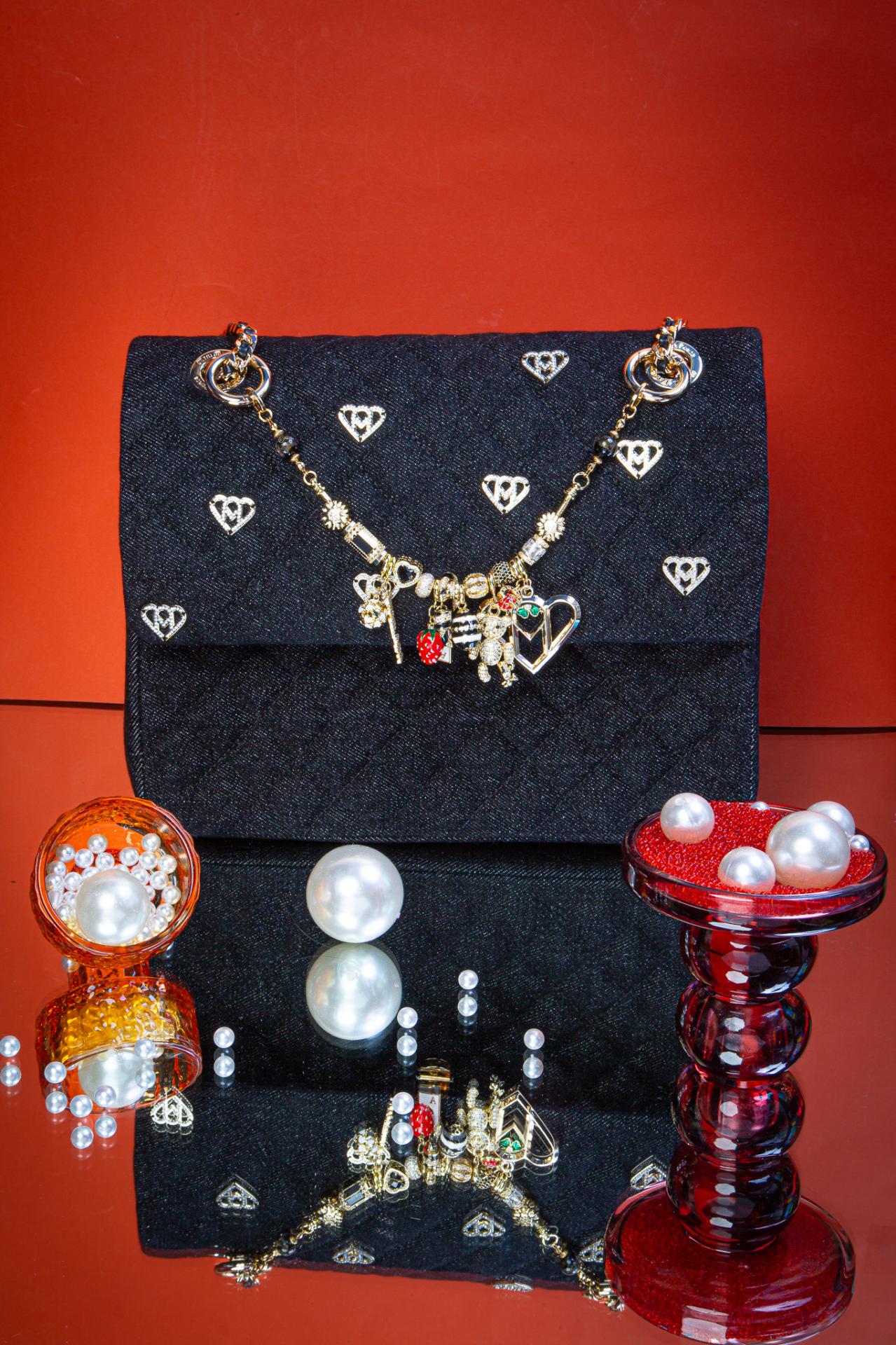 M-sized quilted bag with crystal heart embroidery and charm-loaded chain. Sweet, bold, and full of magic.