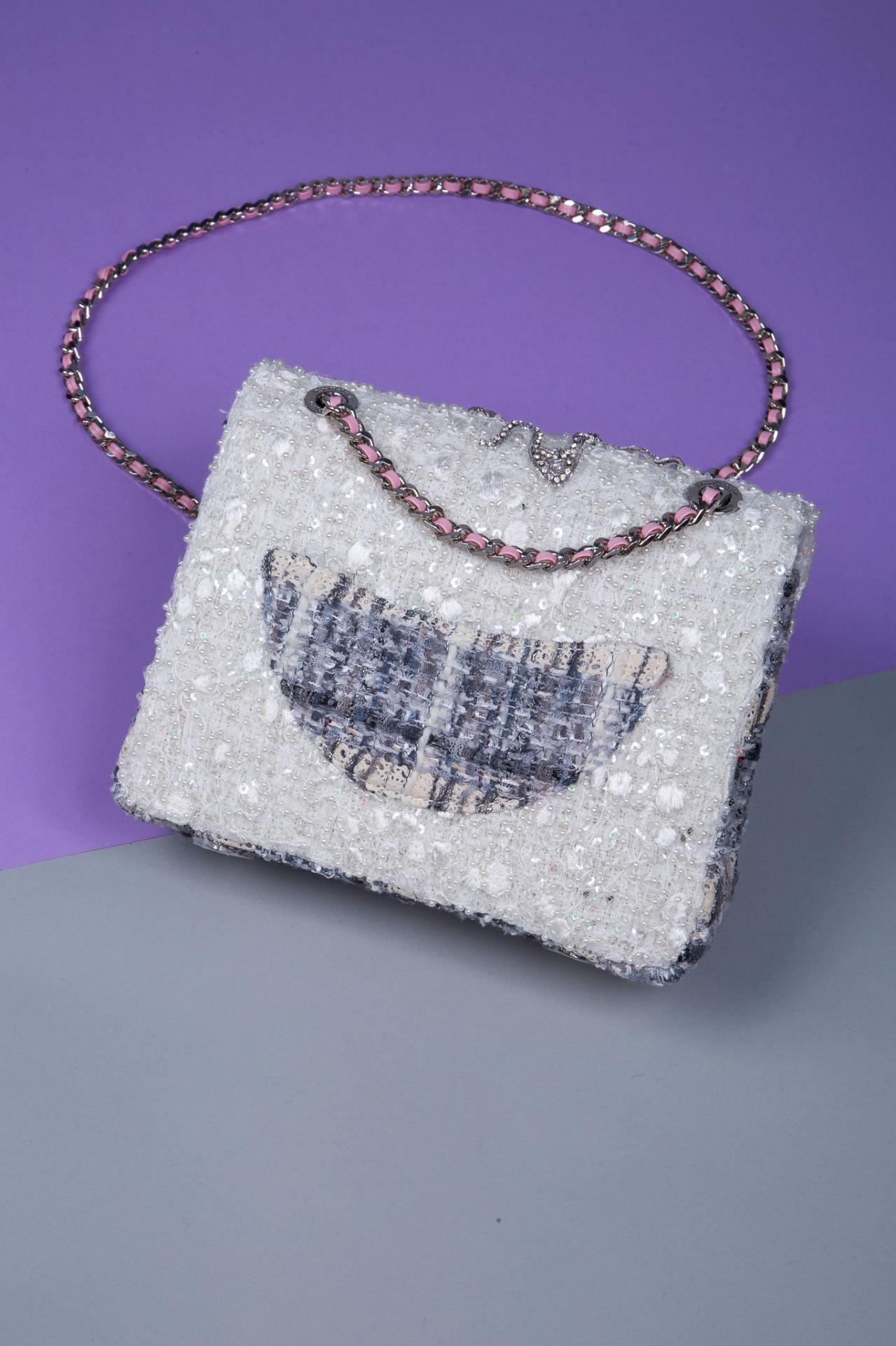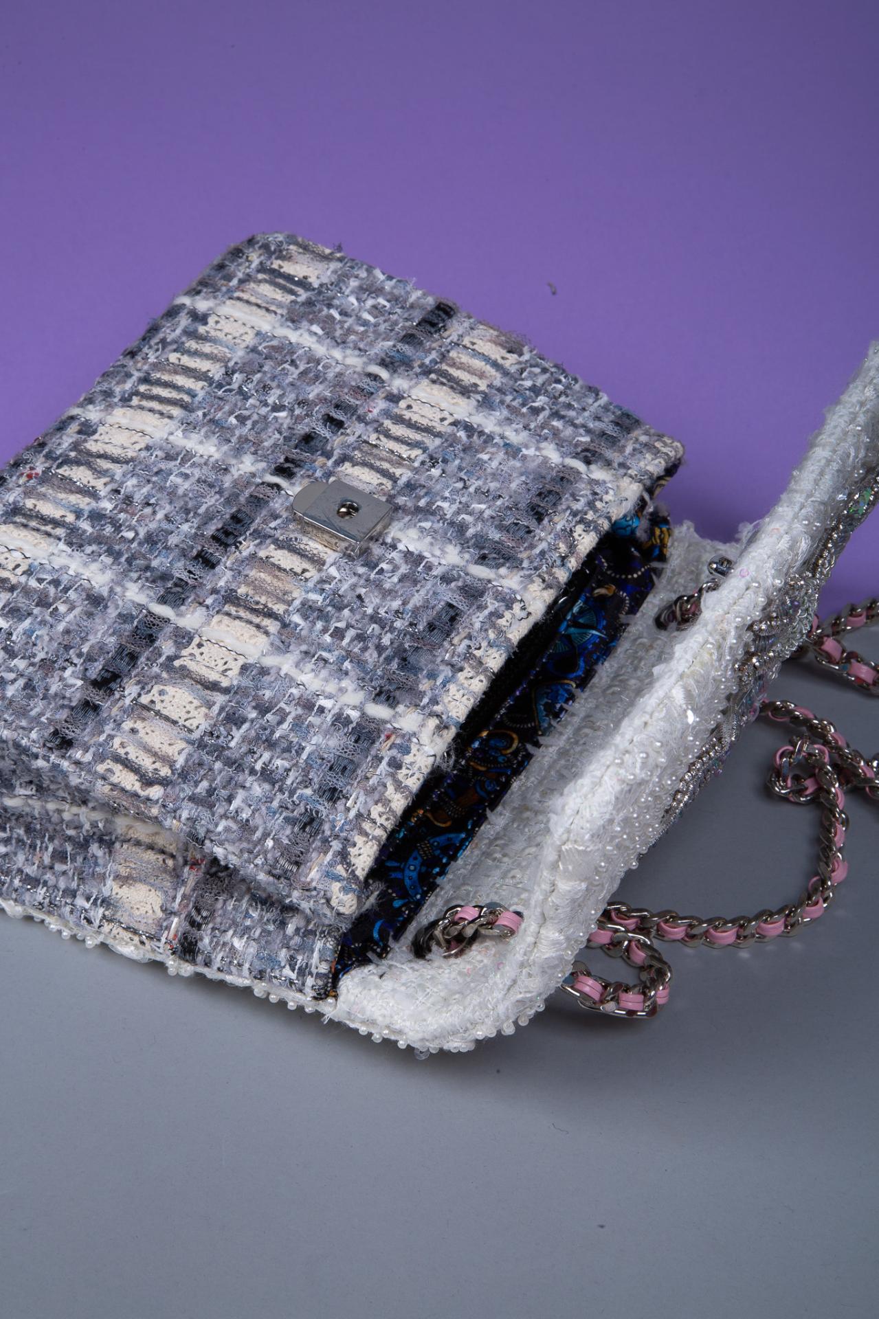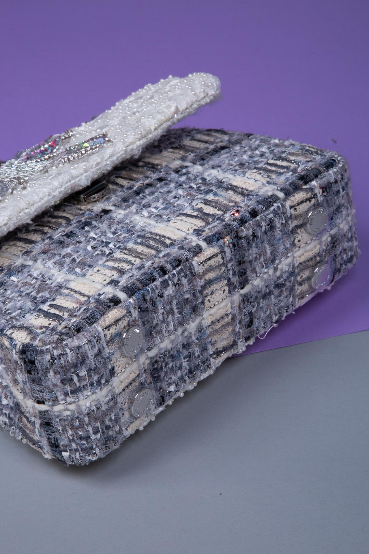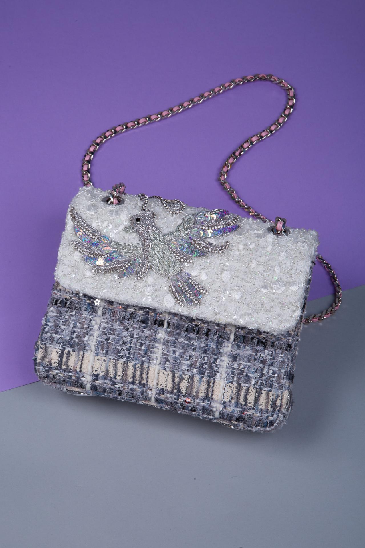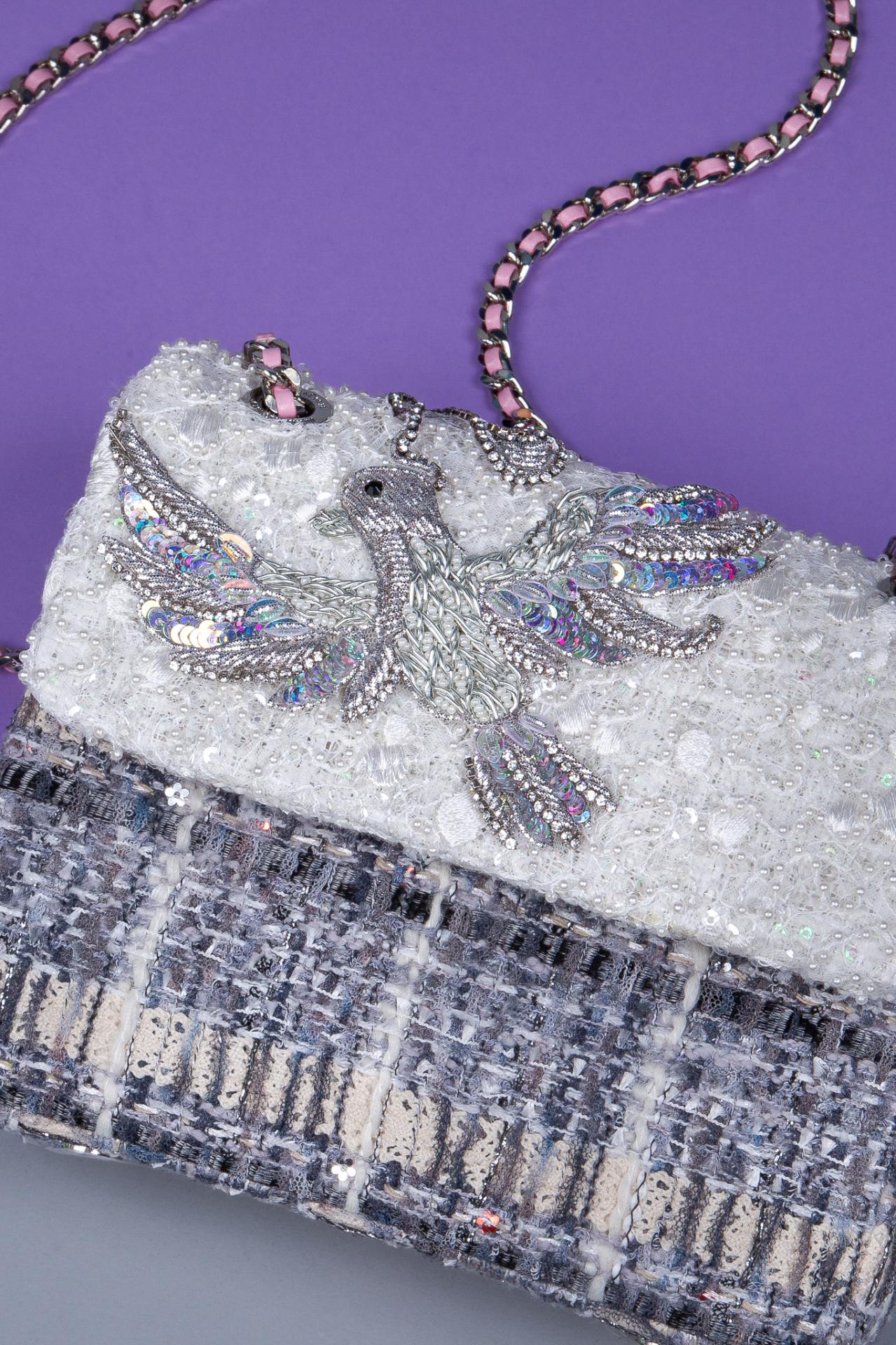 Rigid Tweed Fantasy Bag, with crystal bird embroidery and pearl-studded flap.