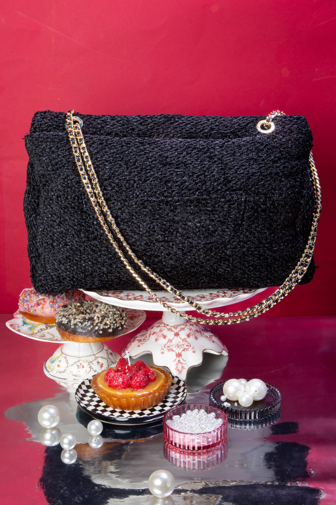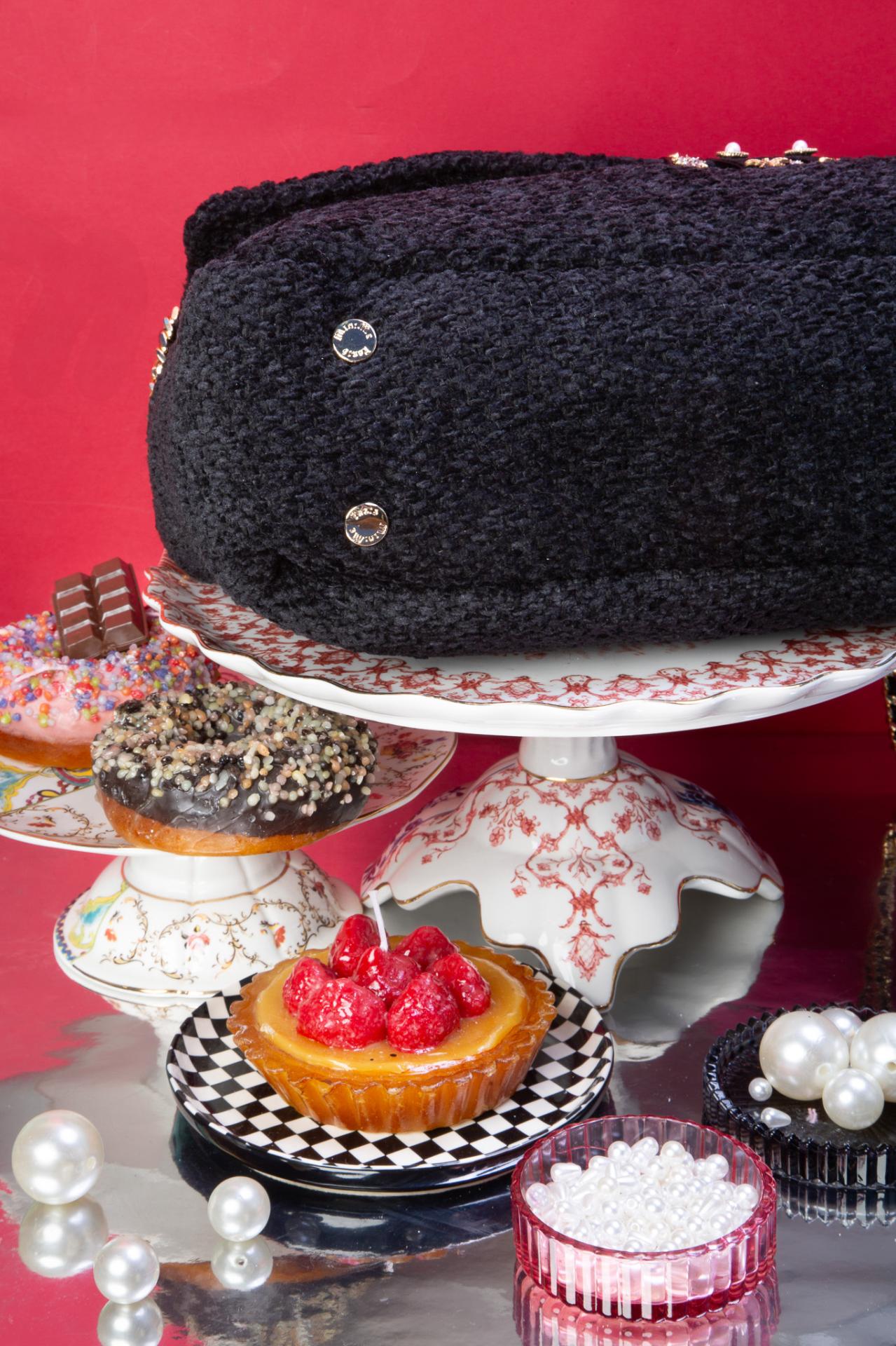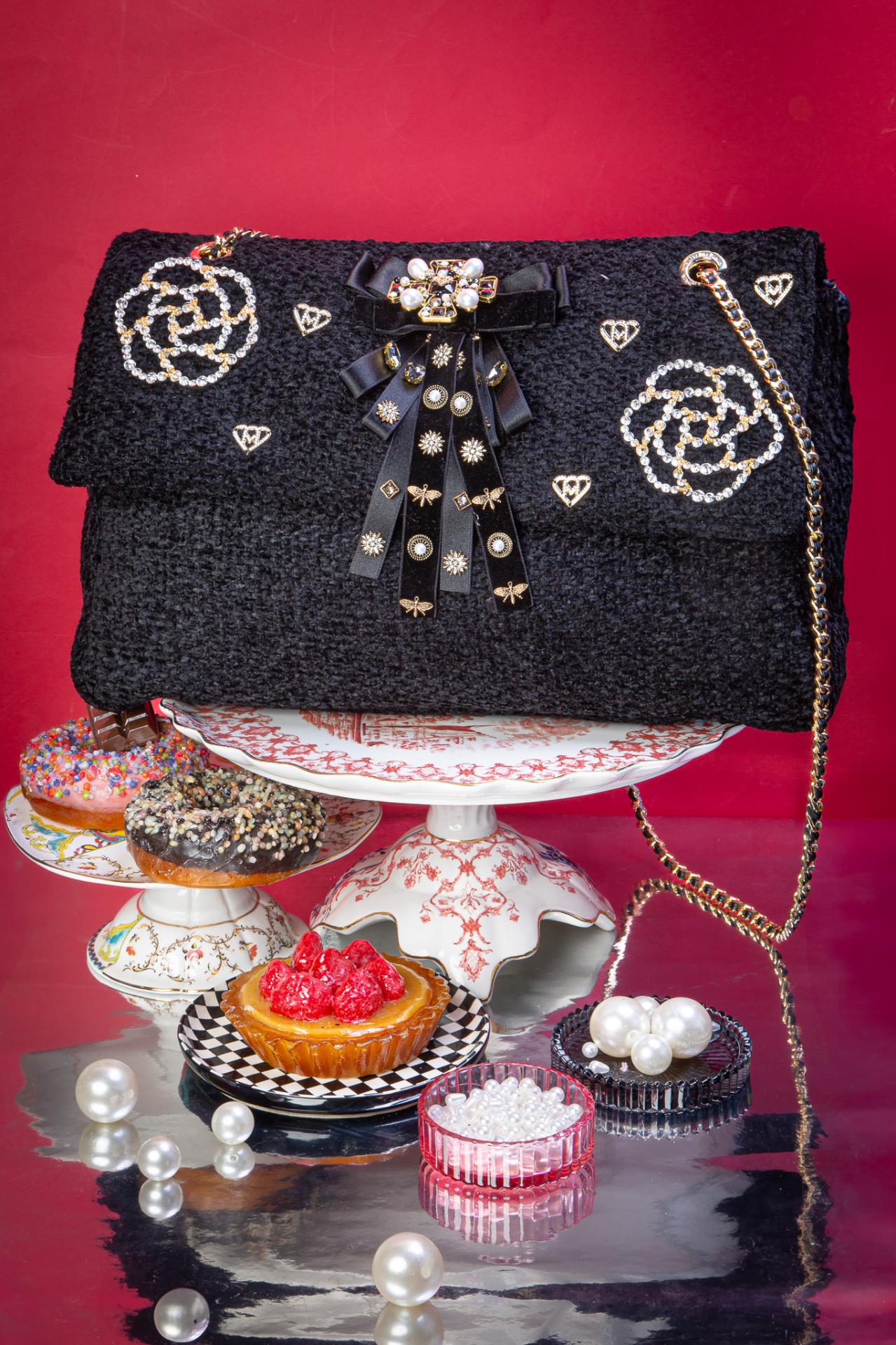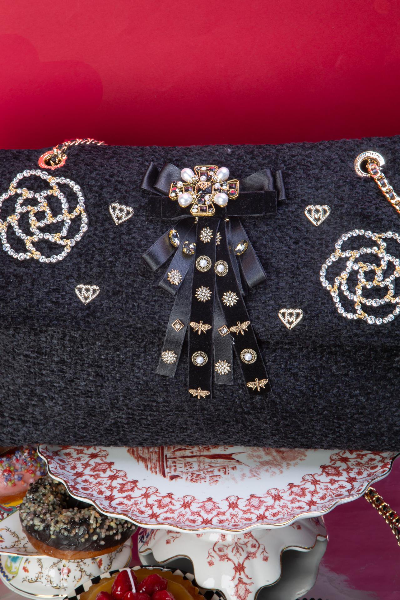 Soft black tweed, jeweled ribbons, and crystal roses, this L-sized bag is gothic glamour with a royal twist.