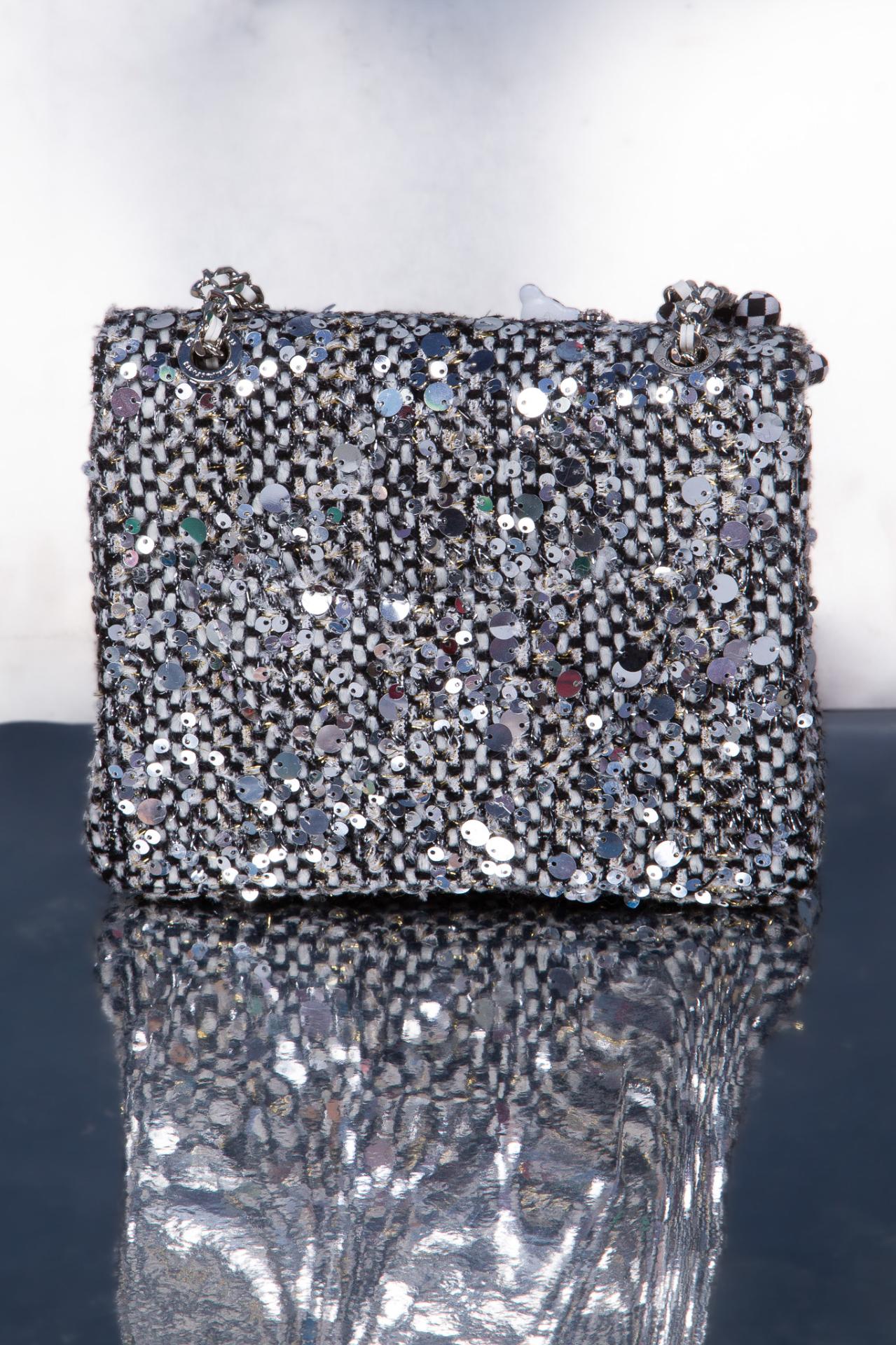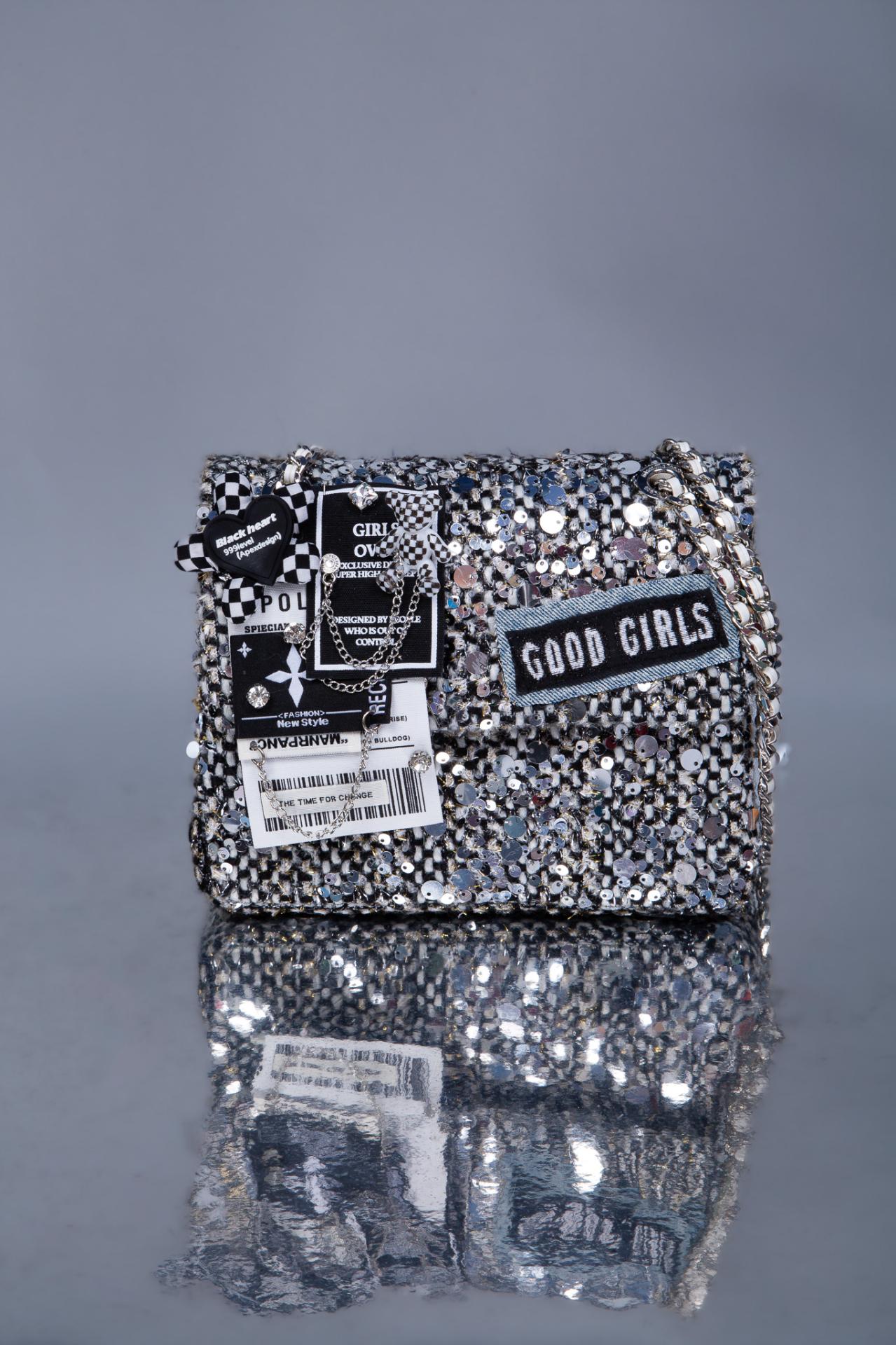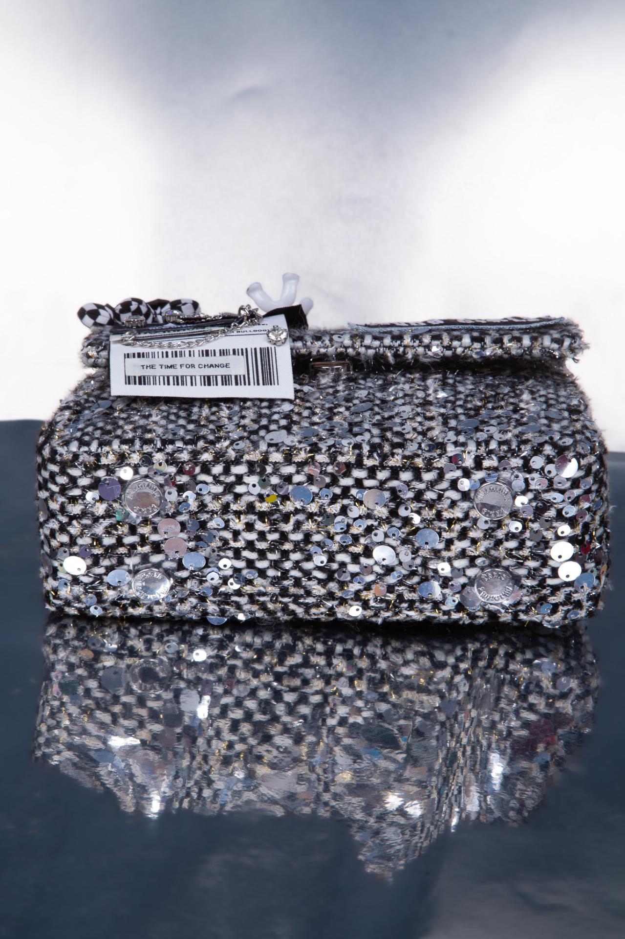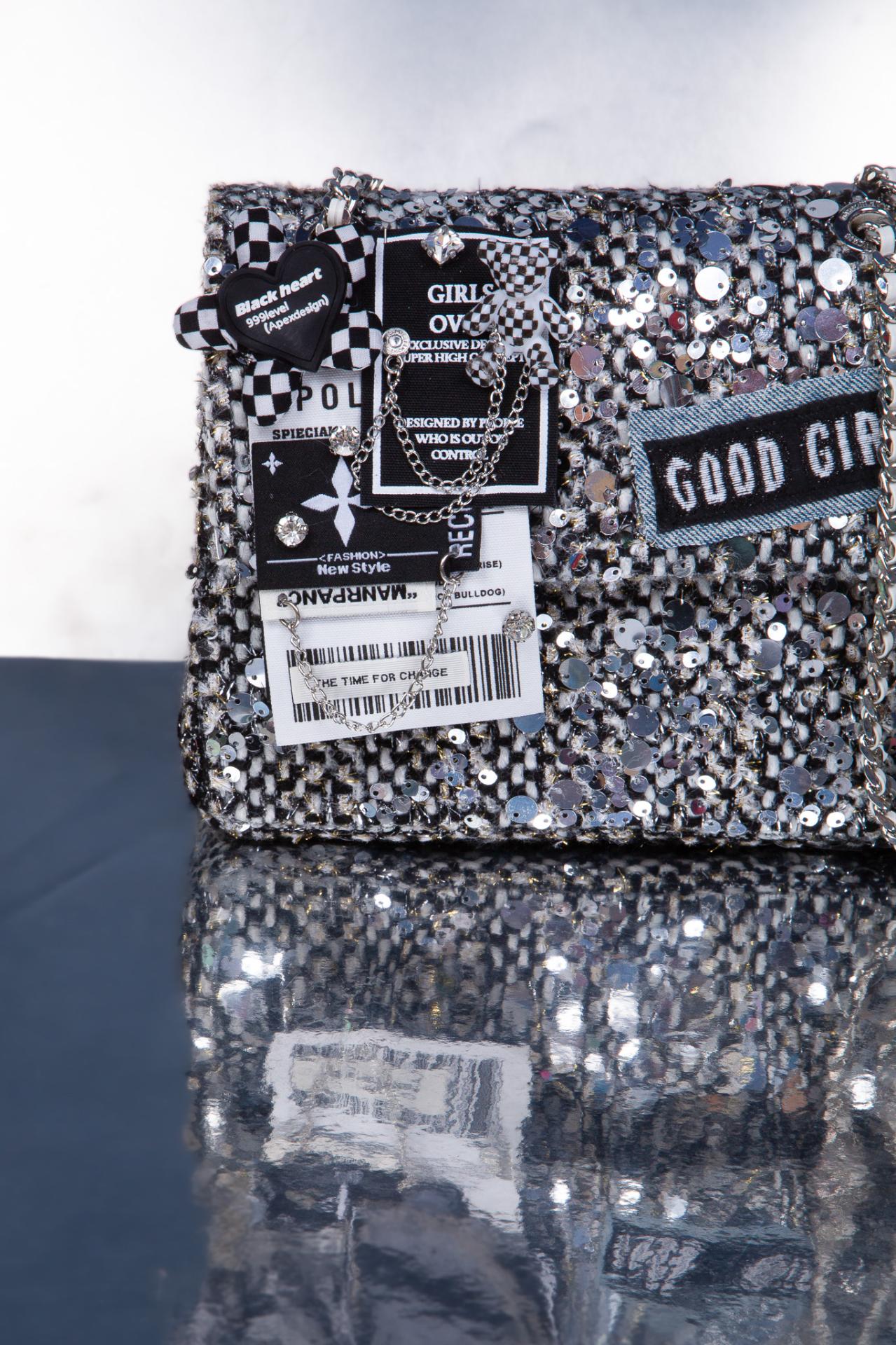 Glitched Tweed Sequin Bag, with barcode tags and mirror sparkle.