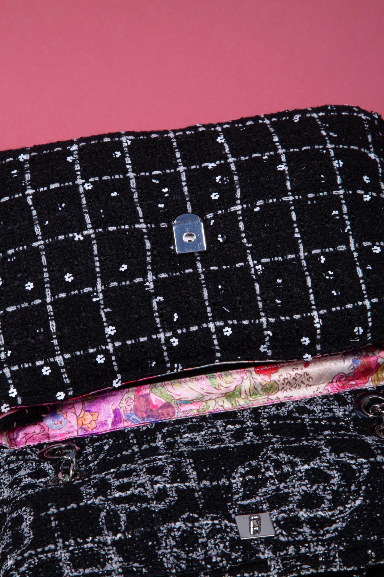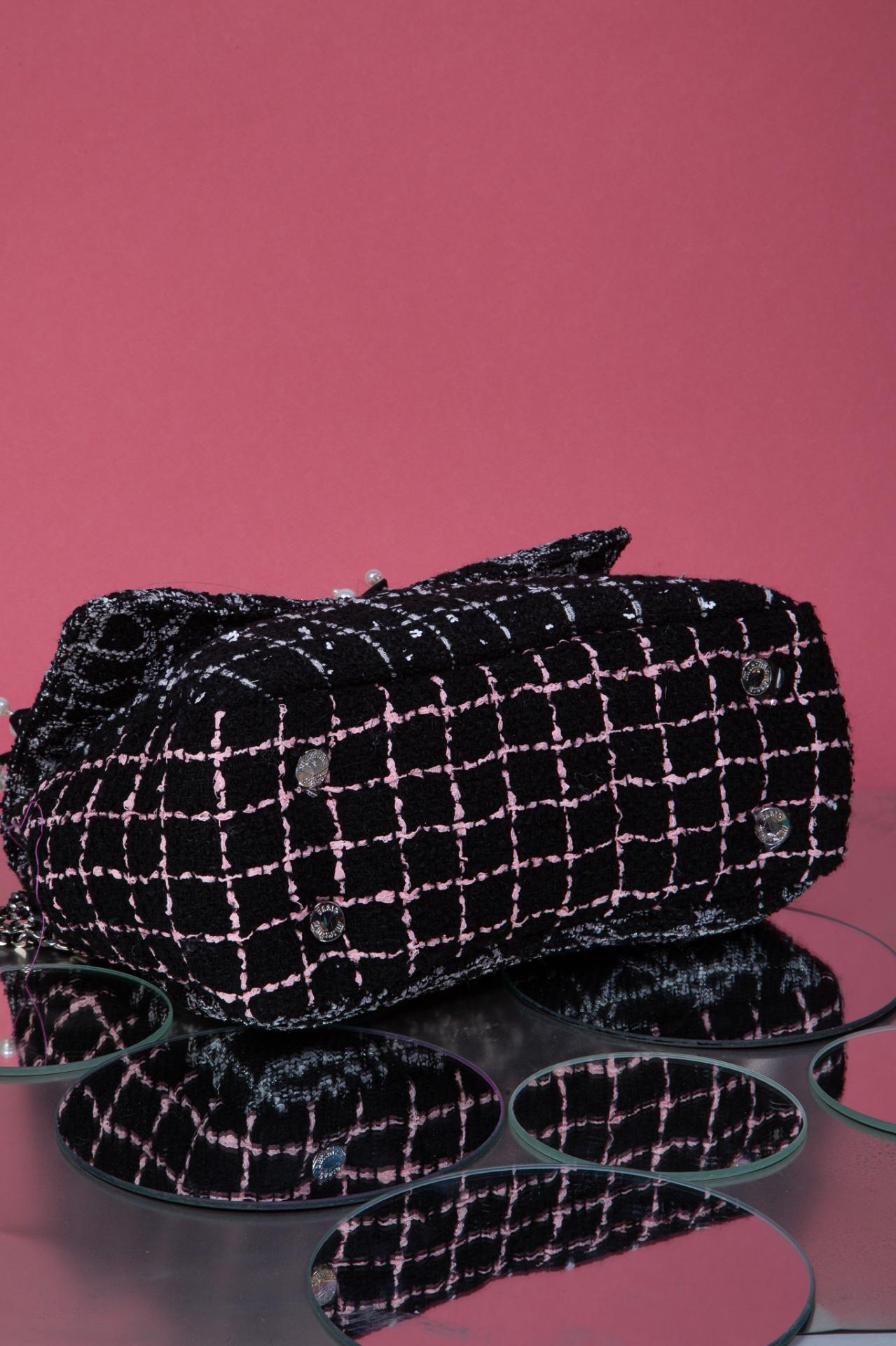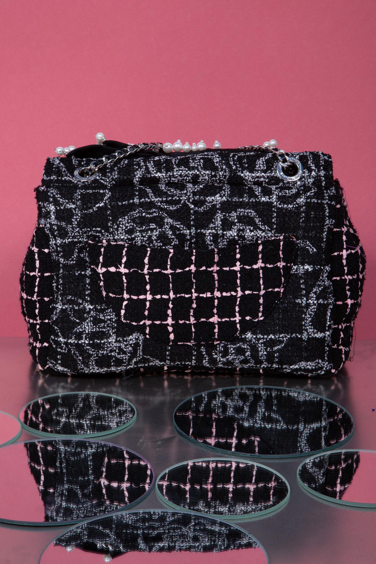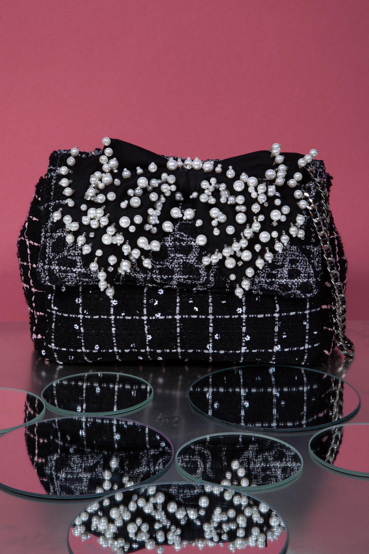 Soft Tweed M Bag, with pearl bow and mirrored attitude.