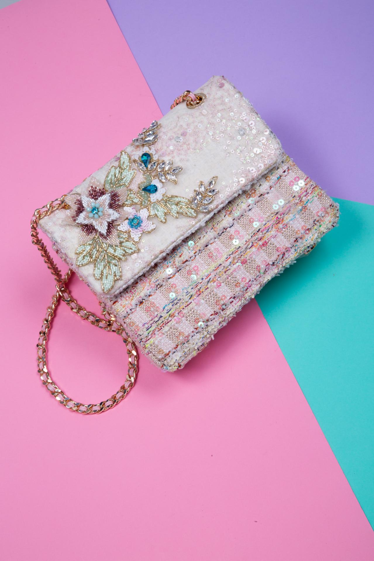 XS Rigid Floral Tweed Bag, with hand-beaded blooms and pastel shimmer.