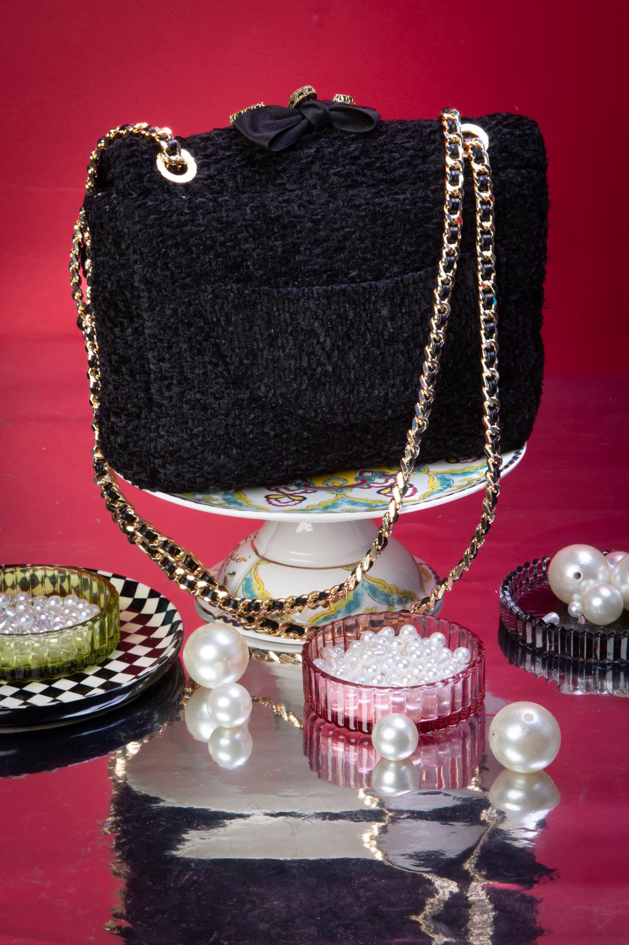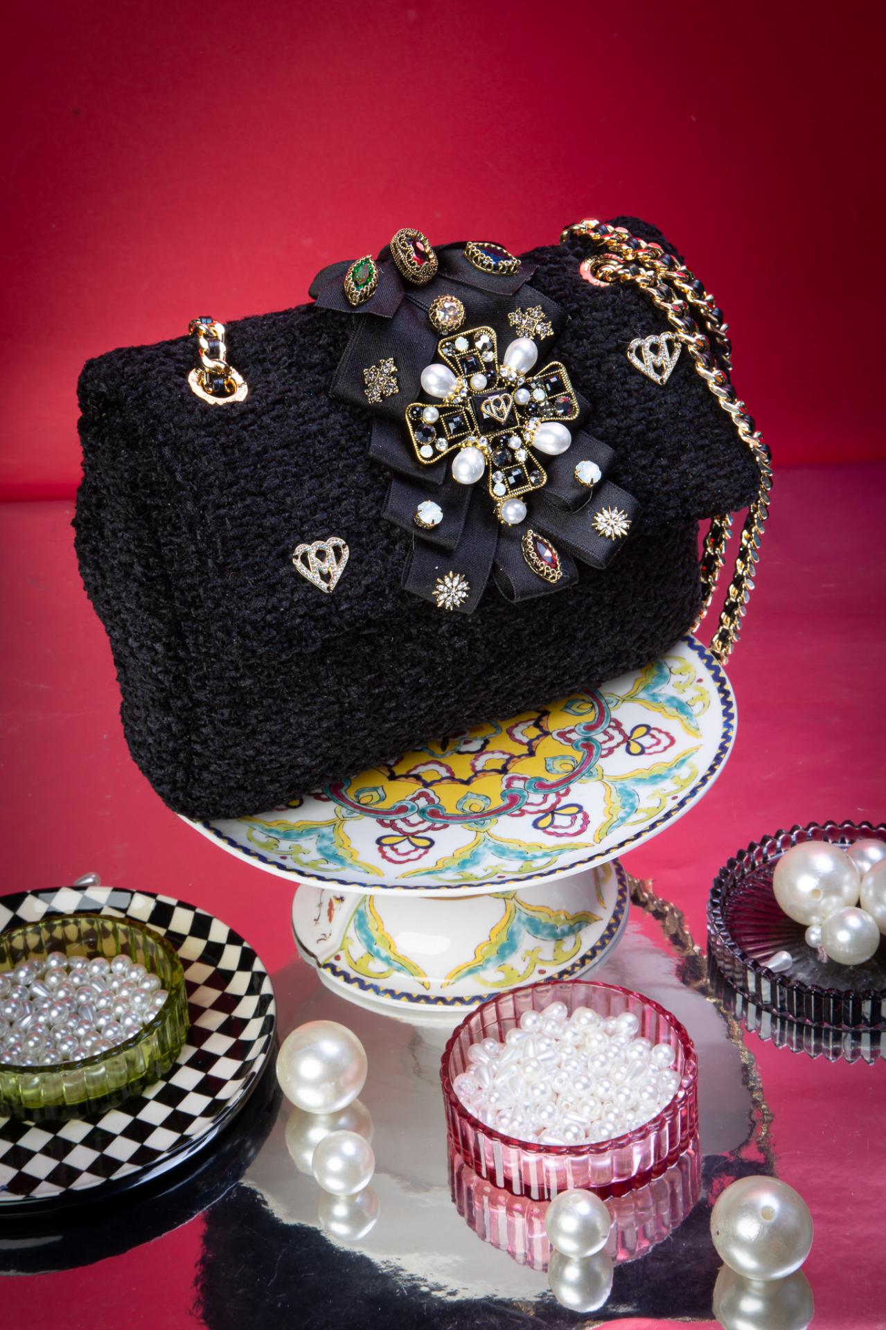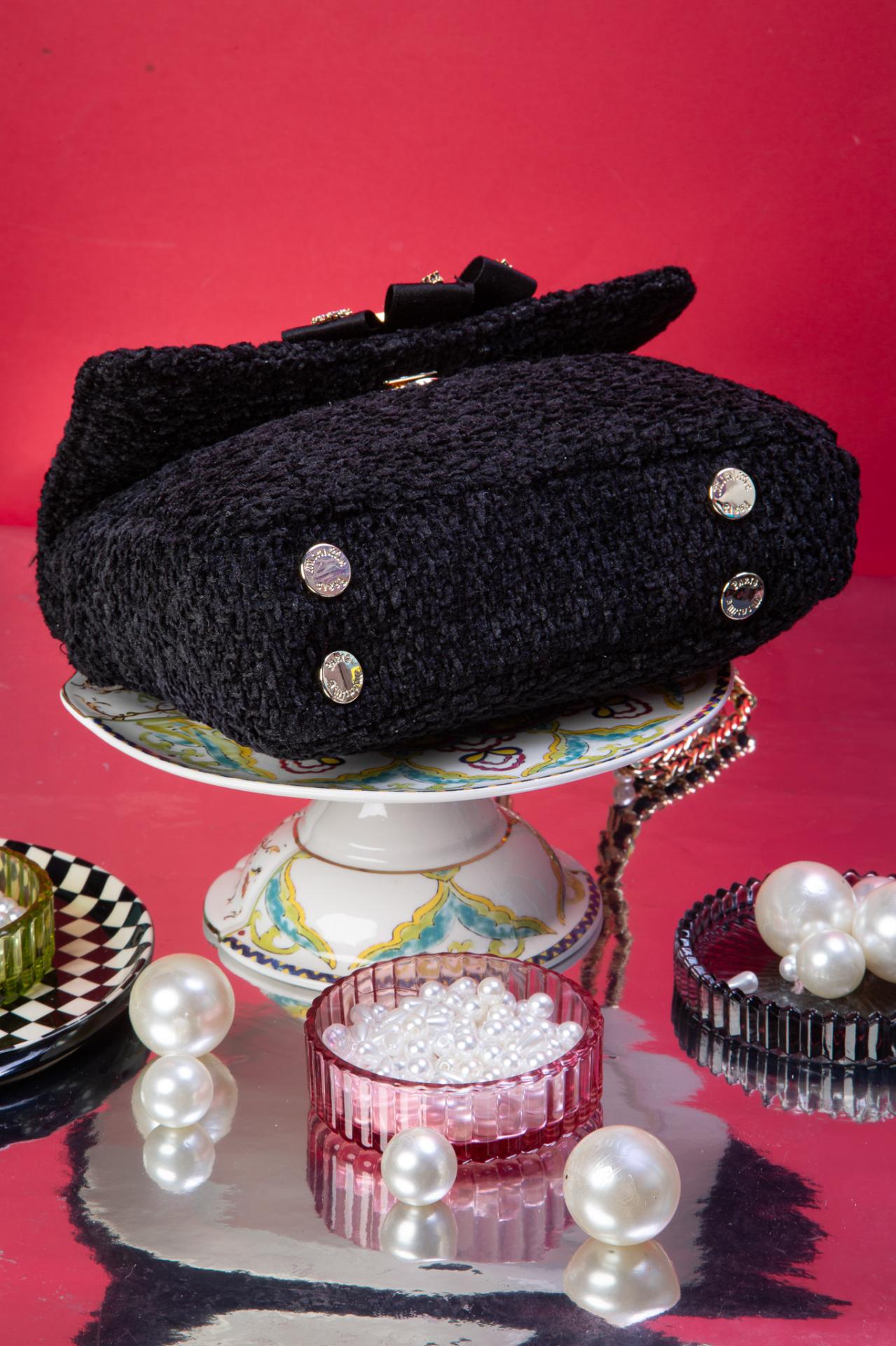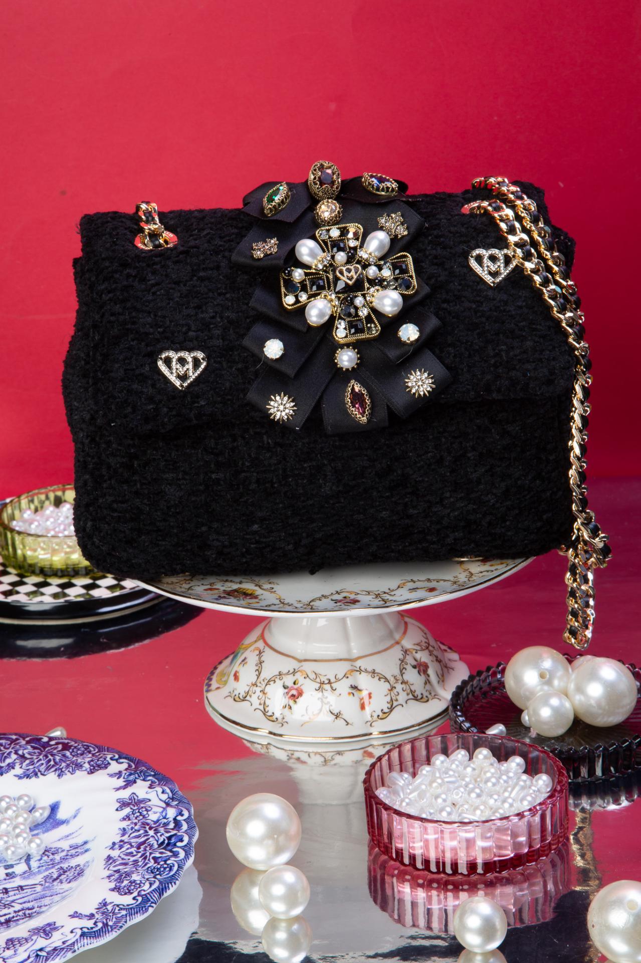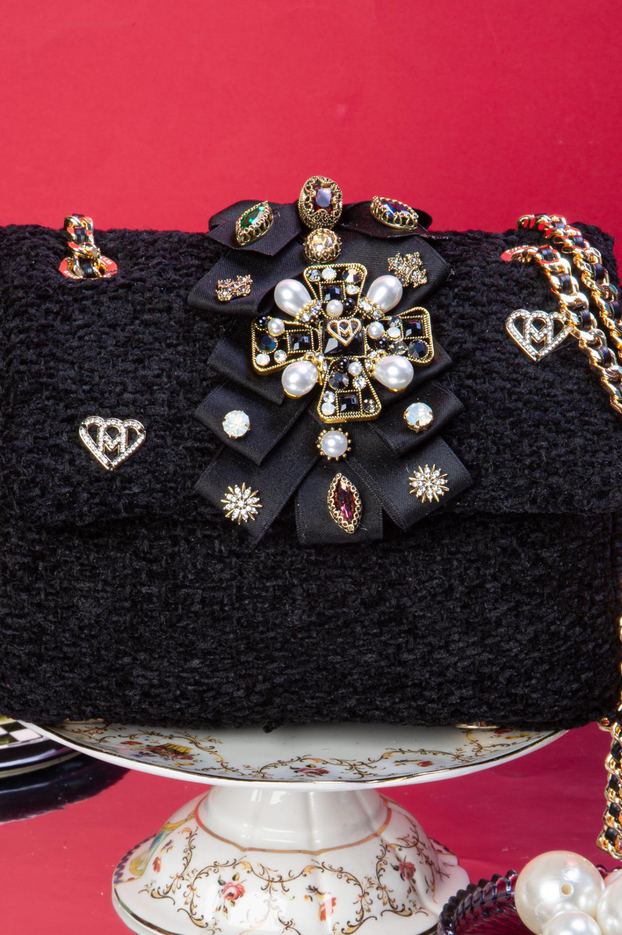 Black tweed, gothic jewels, and a velvet bow, this XS bag is a miniature throne for your essentials.