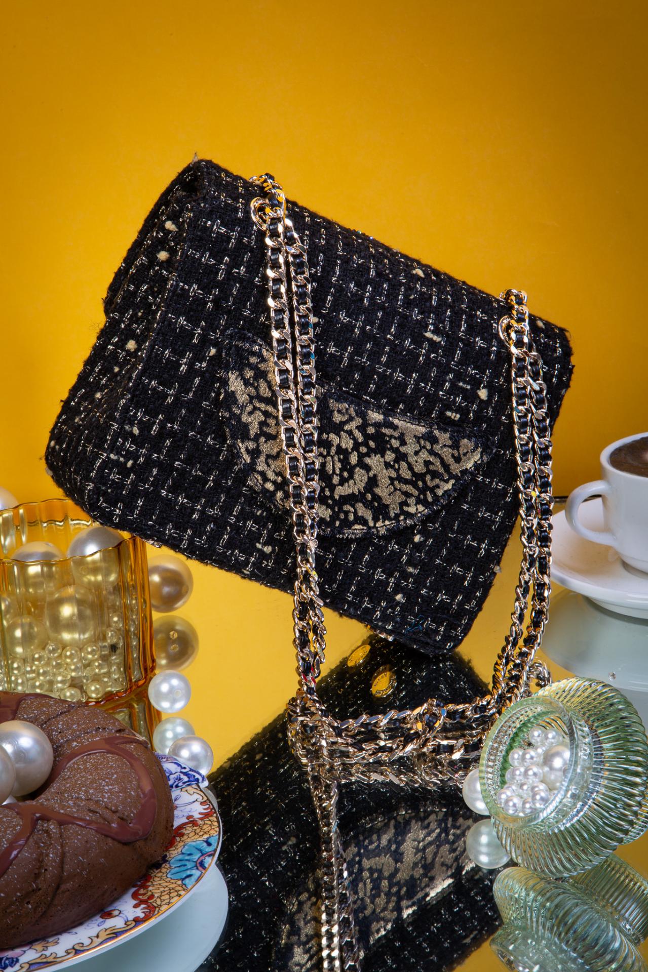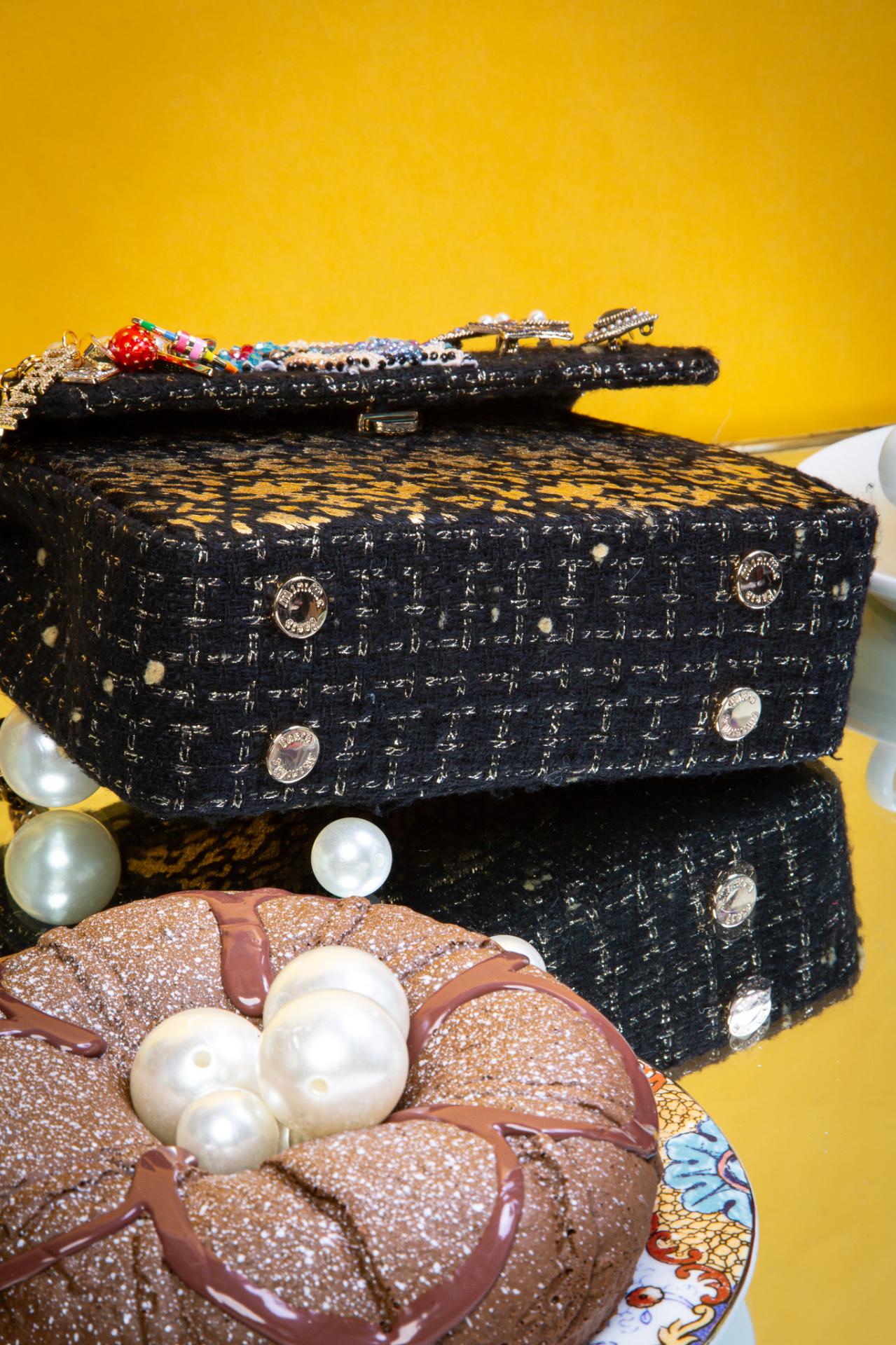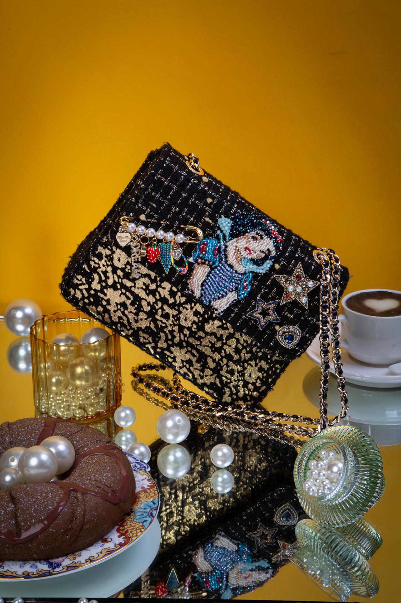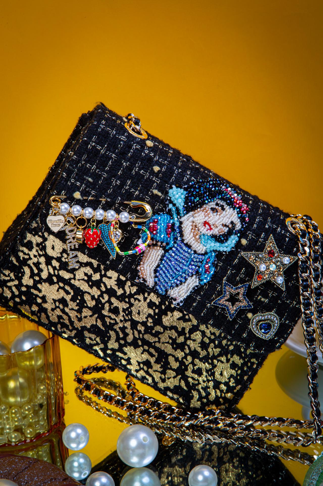 XS tweed & leather bag with gold leopard pattern, doll embroidery and dreamy charms. A mini statement for maximalist hearts.
