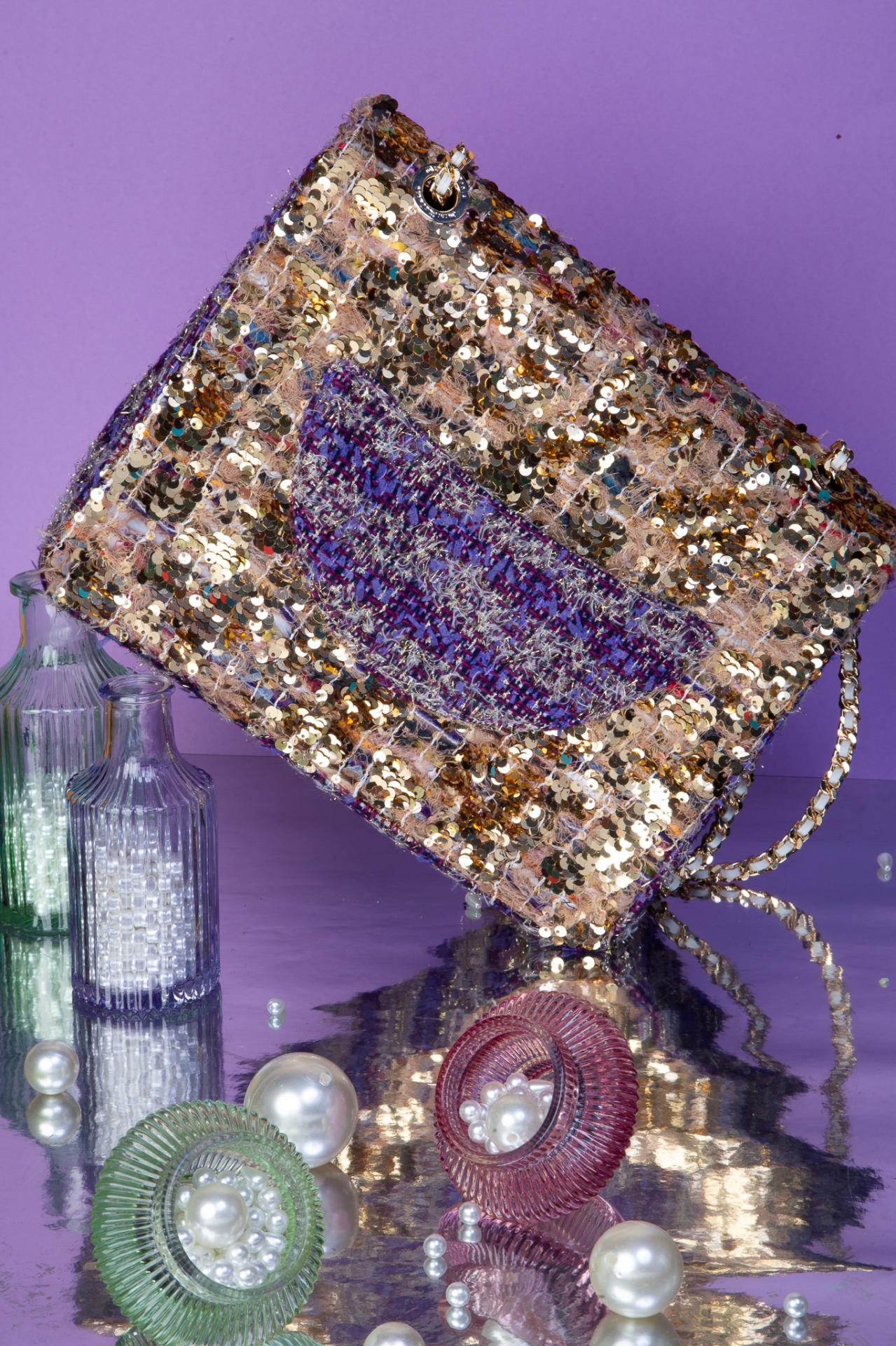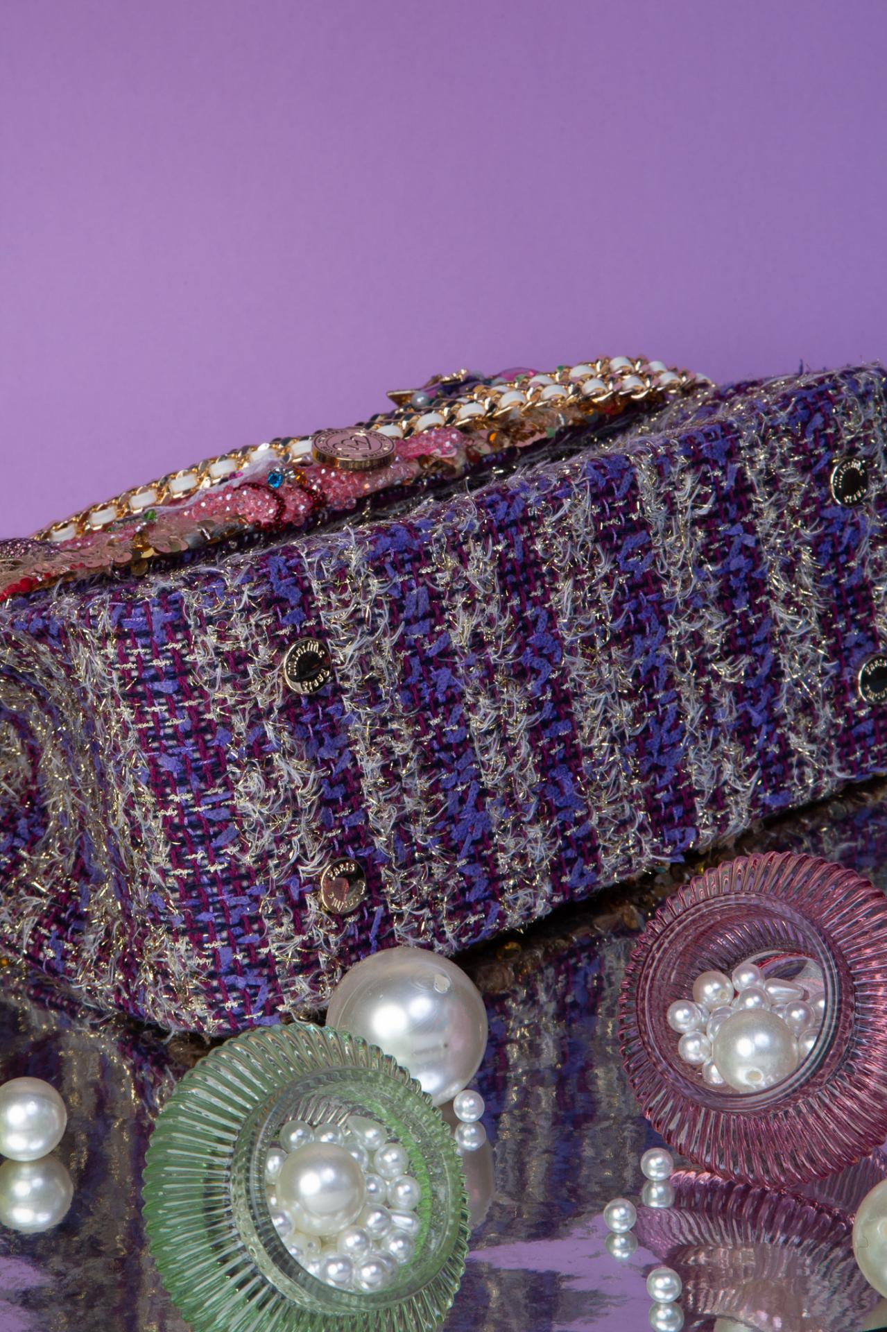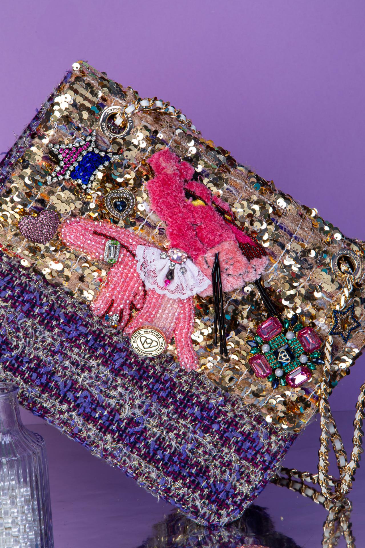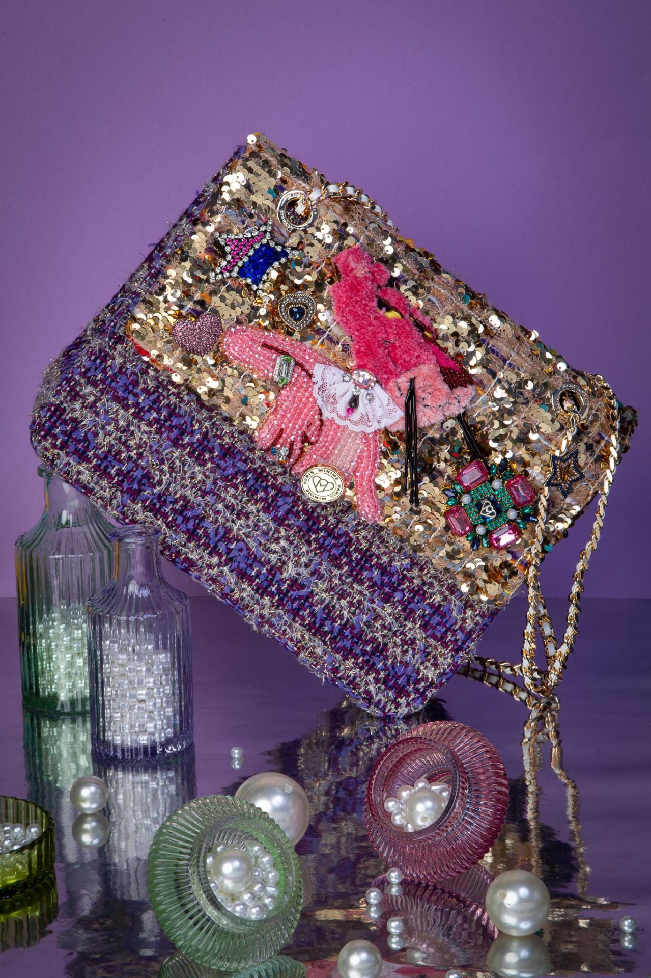 Structured M-sized bag in gold sequins and violet tweed, featuring a glam Pink Panther patch with crystal charms and vintage brooches. Bold, playful, iconic.