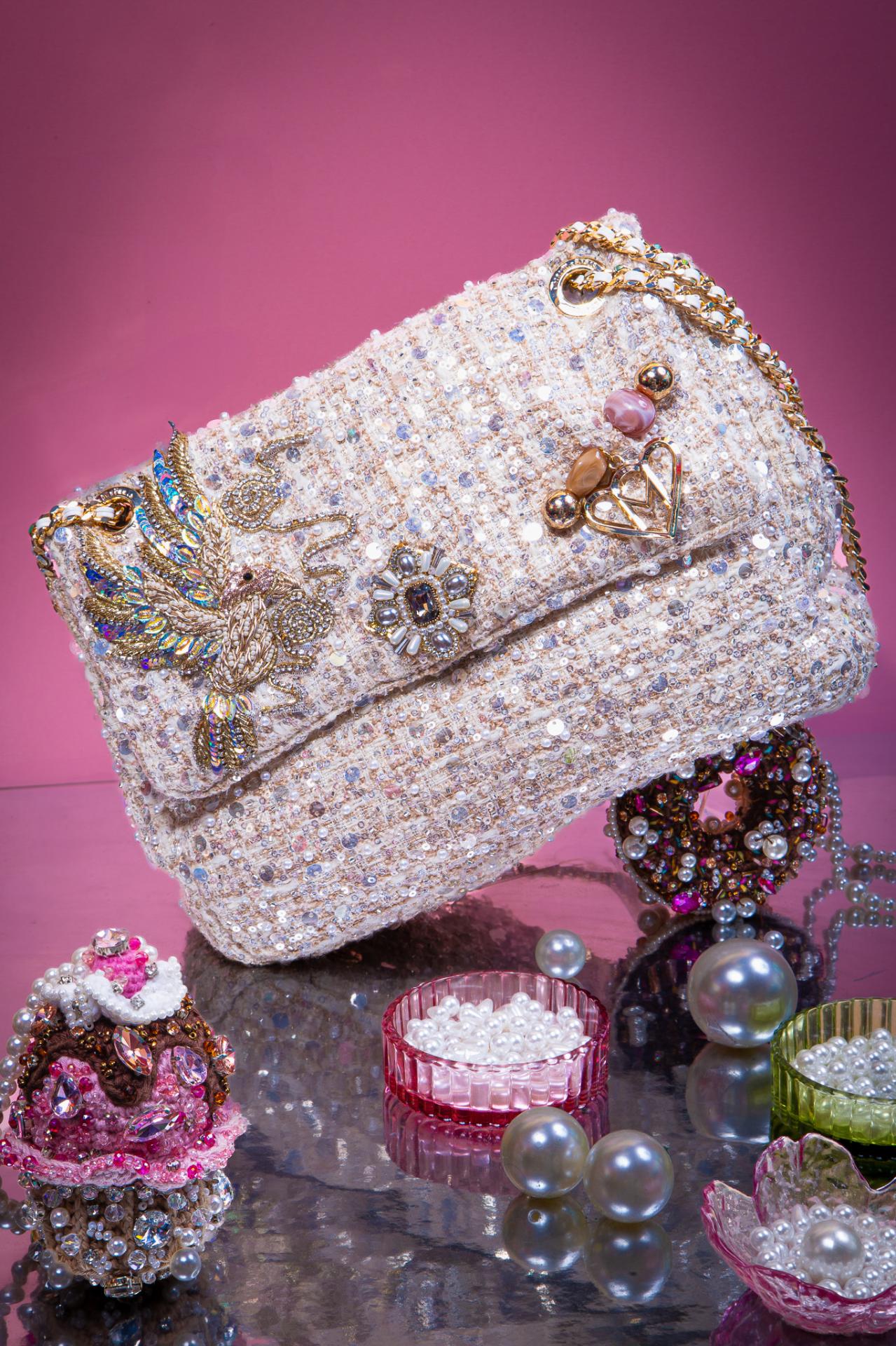 Golden phoenix dreams stitched in sequins and pearl-lit tweed.