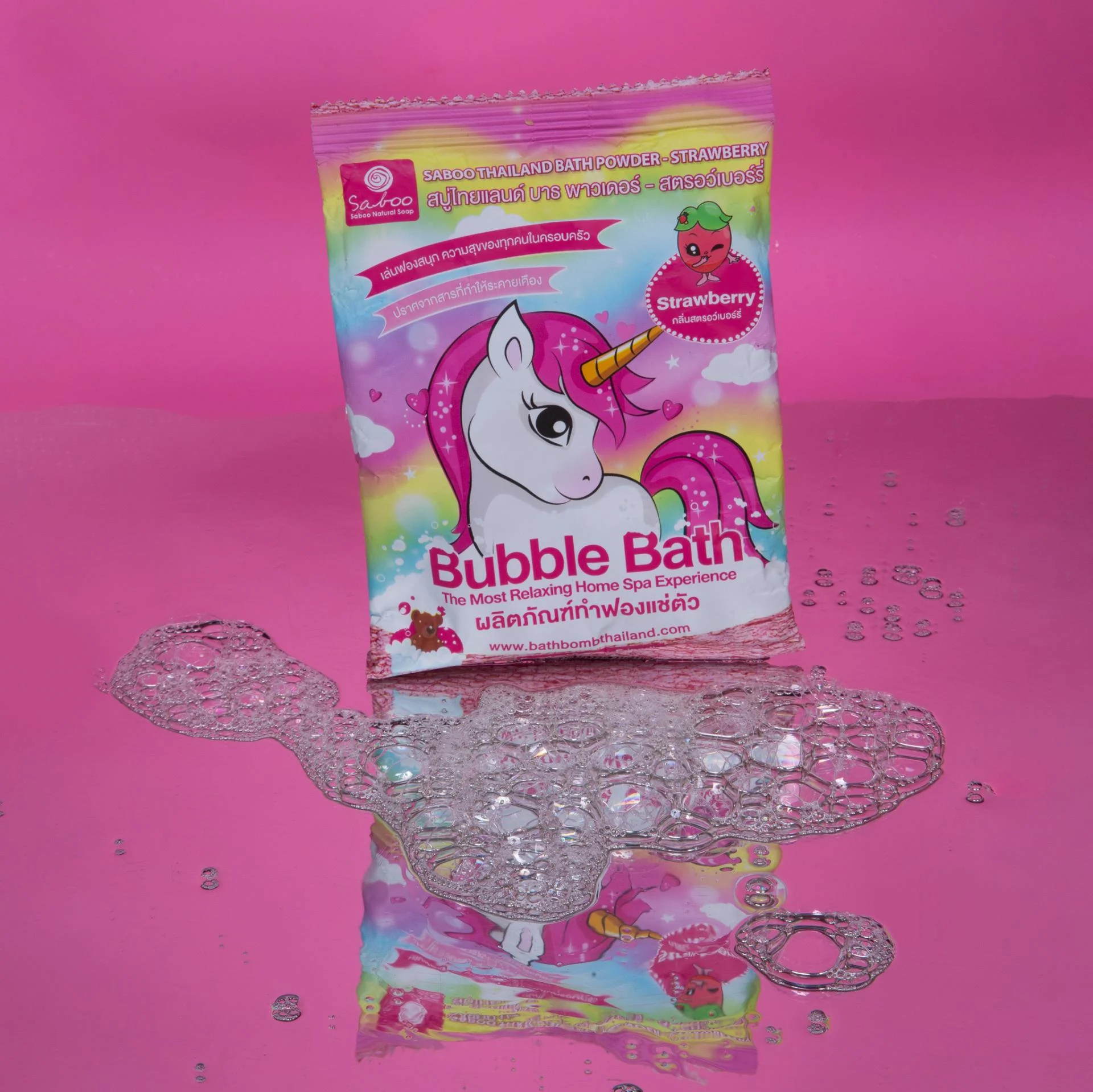 A fruity Unicorn Strawberry bath bomb powder that transforms your tub into a bubble-filled, candy-pink spa. Sweet, sparkly, and magical, perfect for kids and unicorn lovers.
