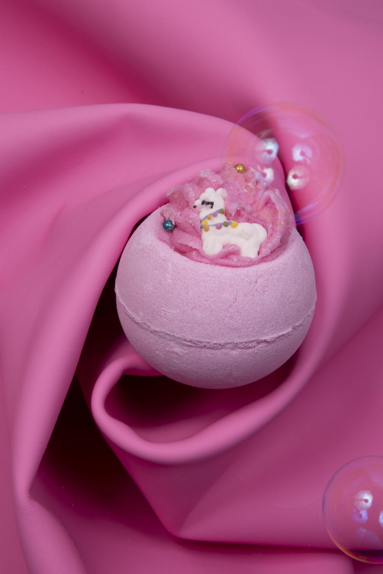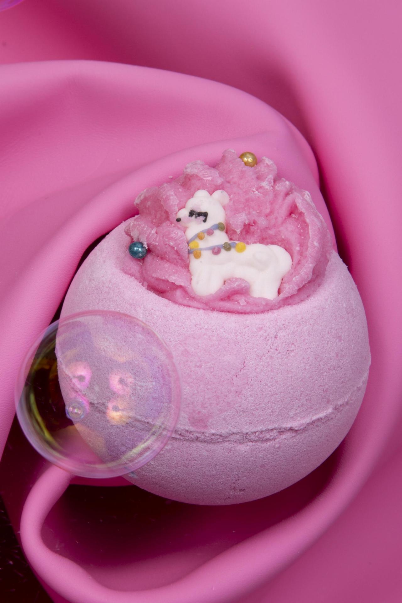 Turn your bath into a unicorn-inspired wonderland with the Bubble Pink Pony Bath Bomb, a bubbly escape into relaxation.