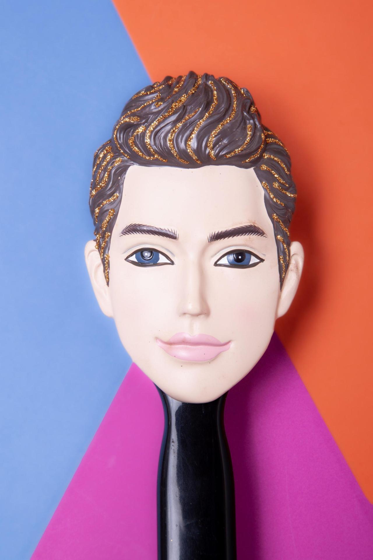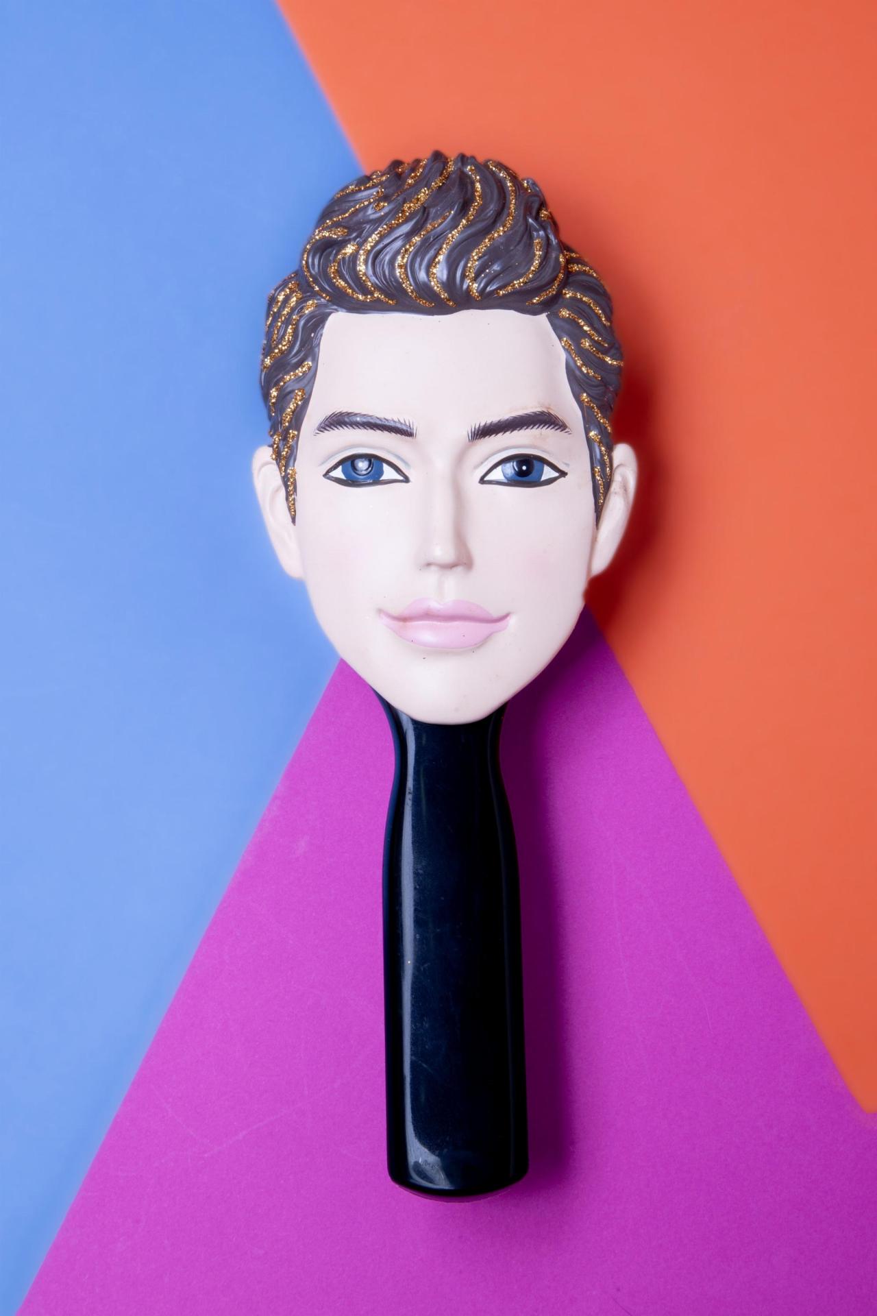 A stylish hair comb with a glossy handle and a chic illustrated face design.