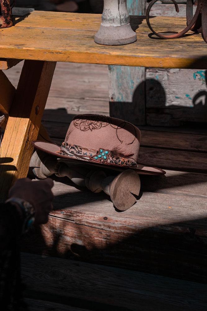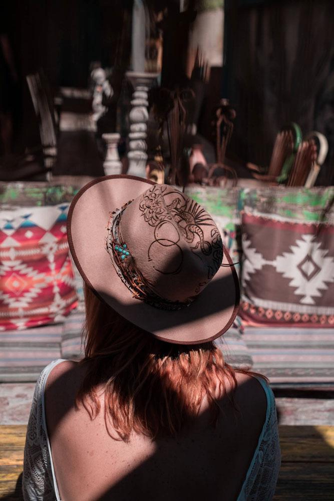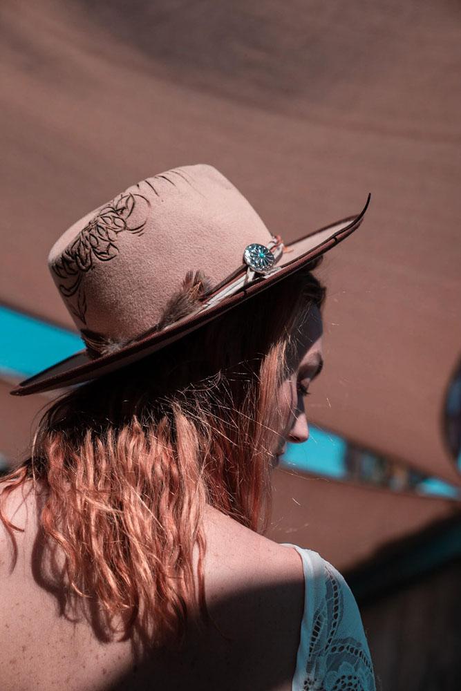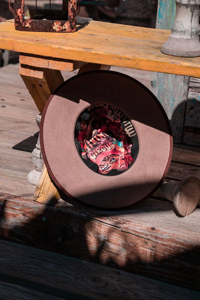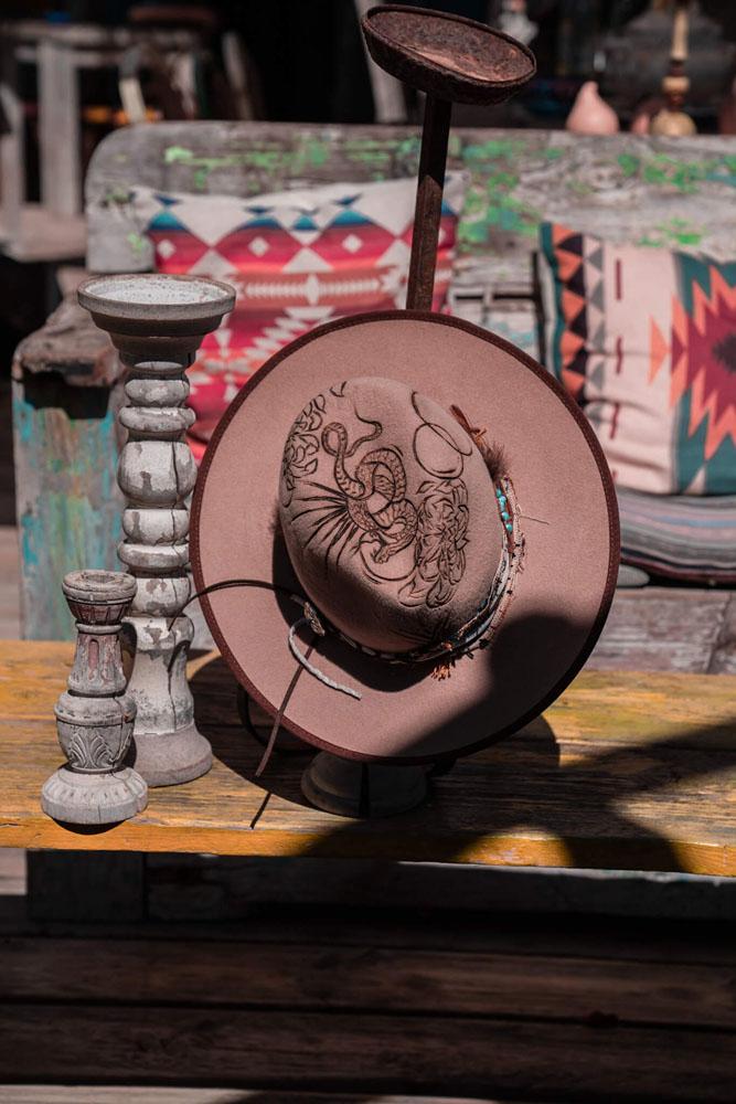 An elegant hazelnut-coloured hat with a snake engraved on the crown.