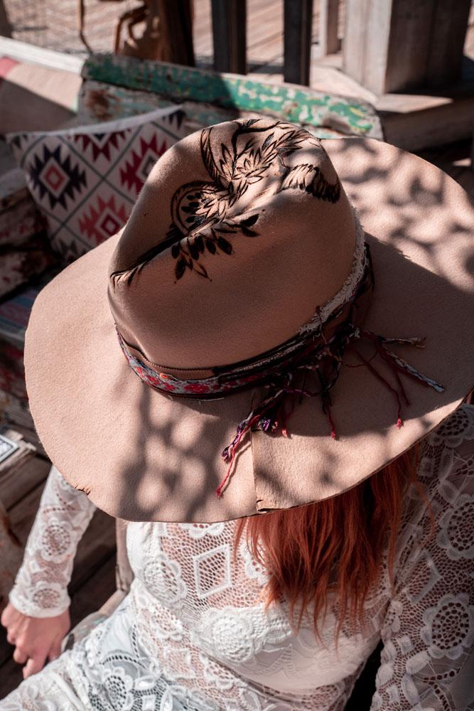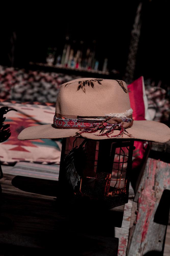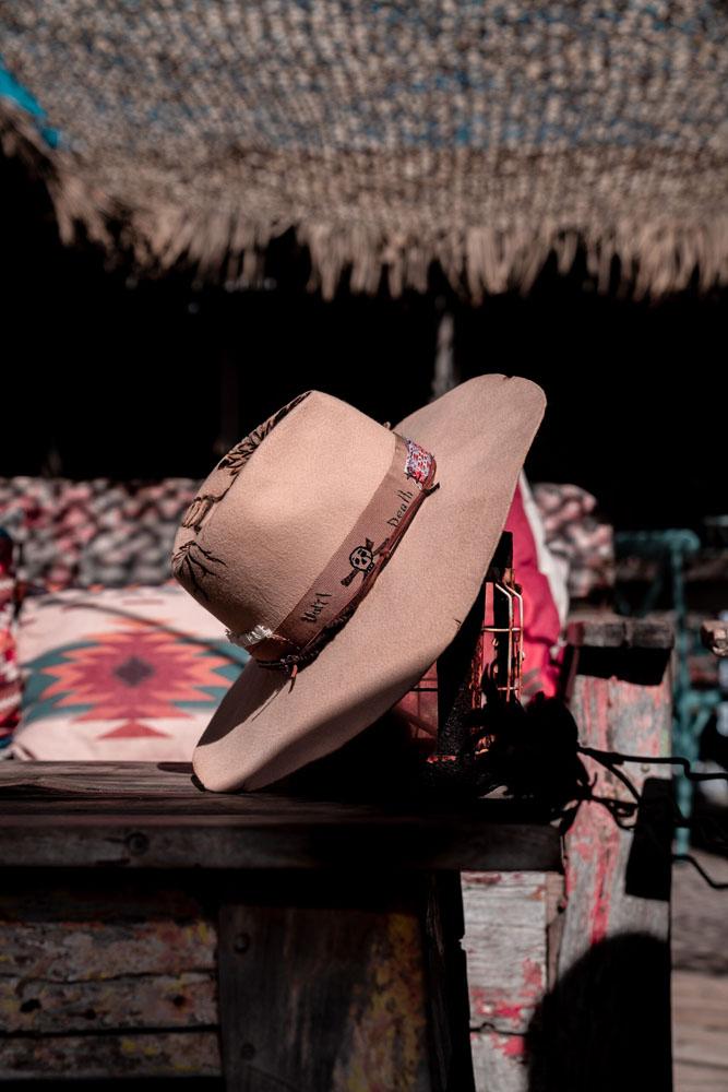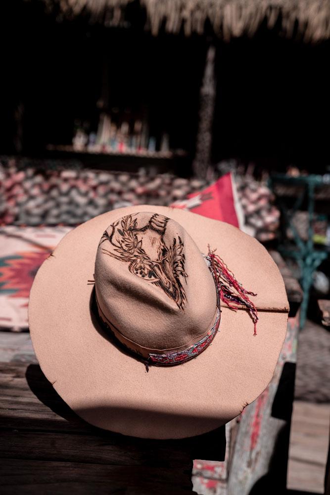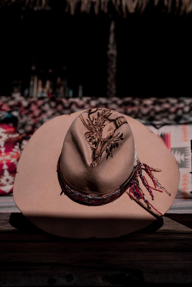 A stylish camel hat with a buffalo skull