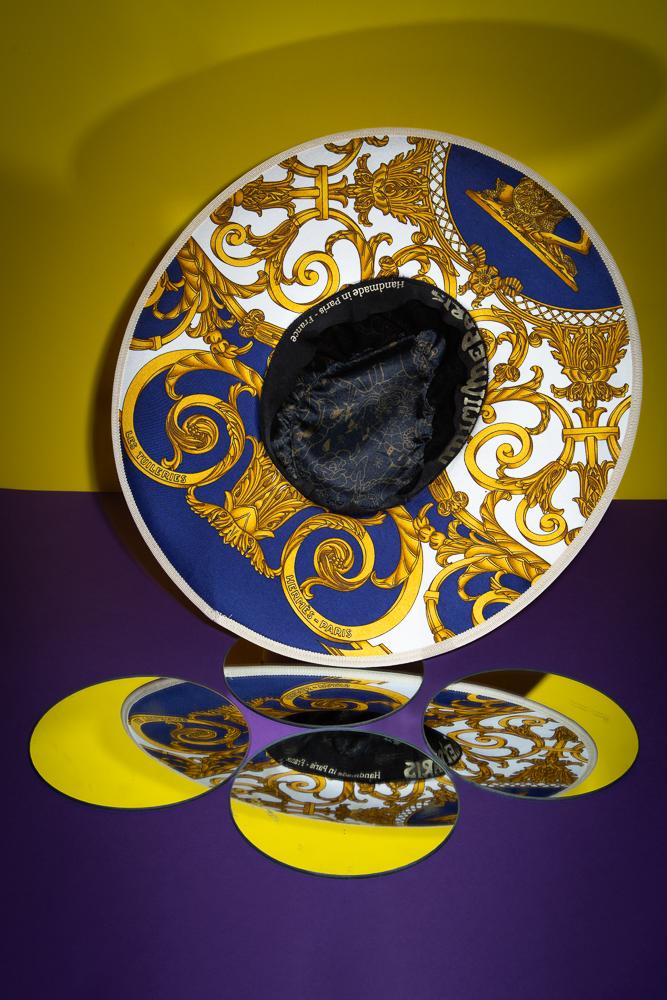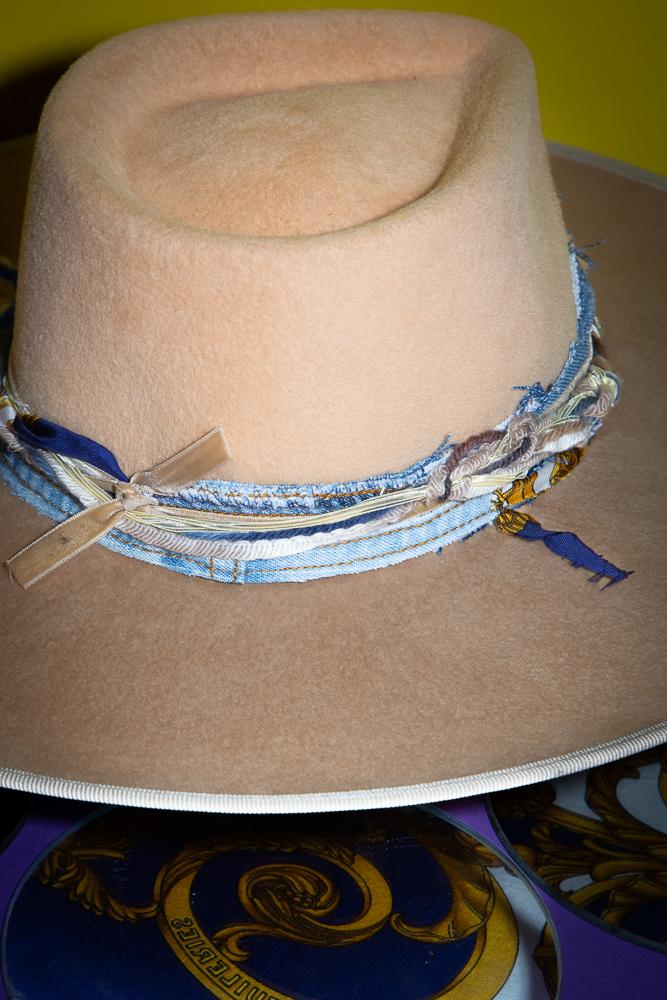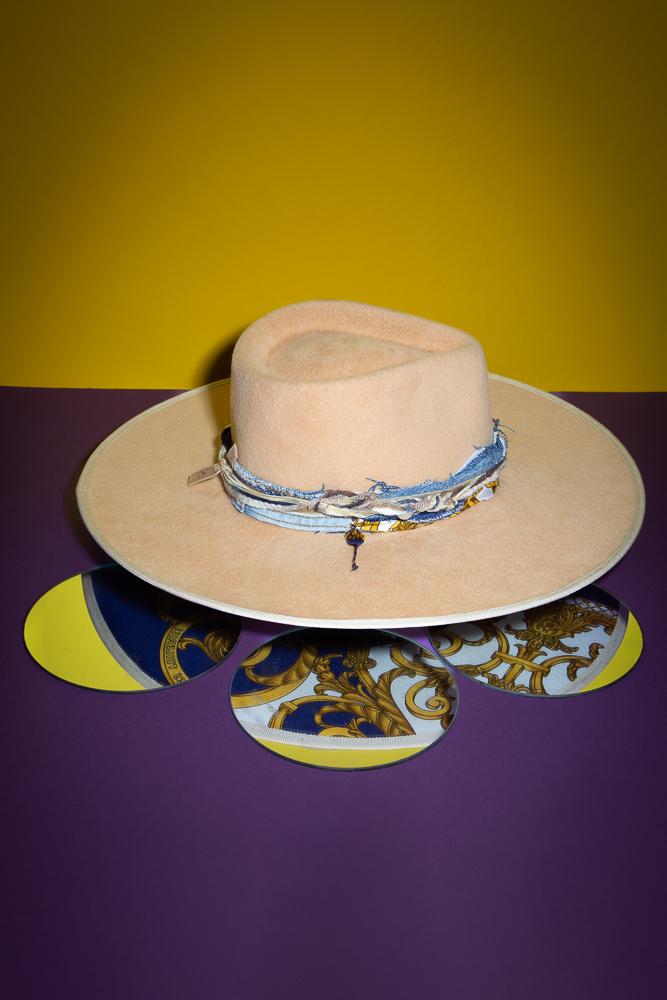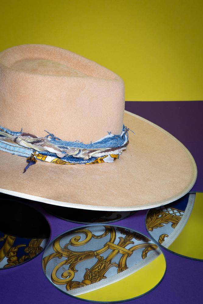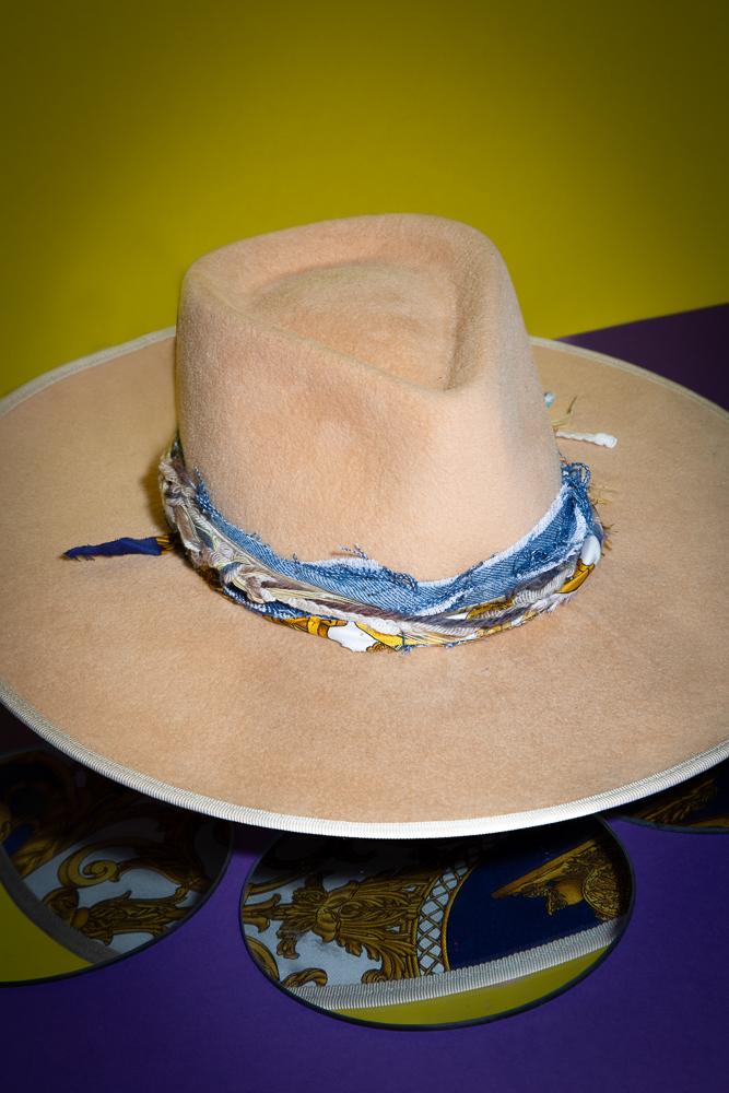 Beige Hat with Denim & Colorful Hermes Scarf Detail