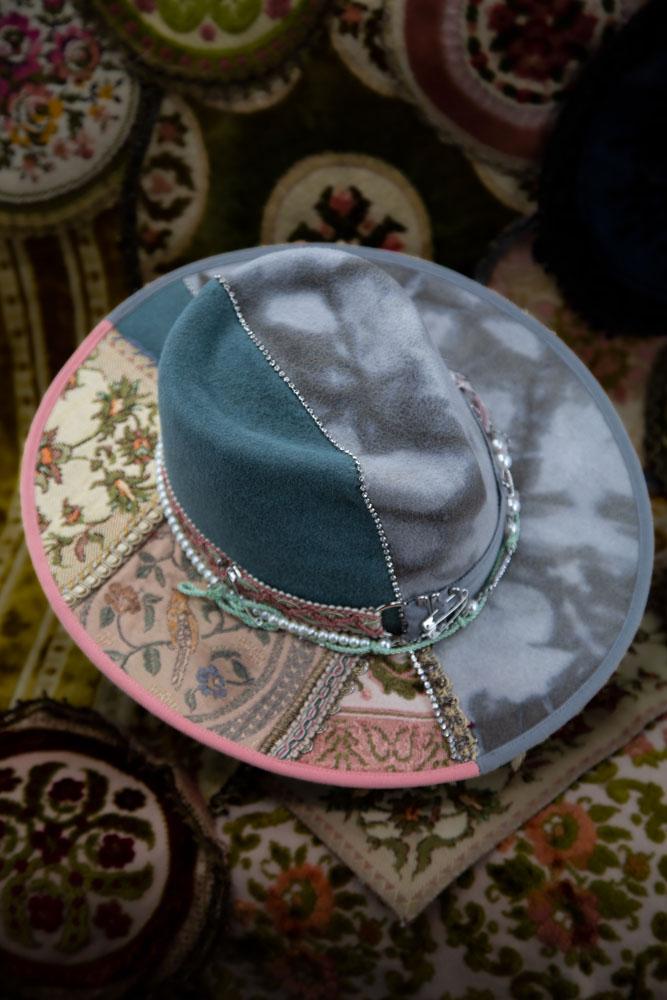 This one-of-a-kind textile creation is a true statement piece, handcrafted with meticulous attention to detail and artistic expression. Featuring a striking tie & dye effect, the hat showcases a rich collage of vintage fabric panels, skillfully combined to create depth, texture, and visual intrigue.