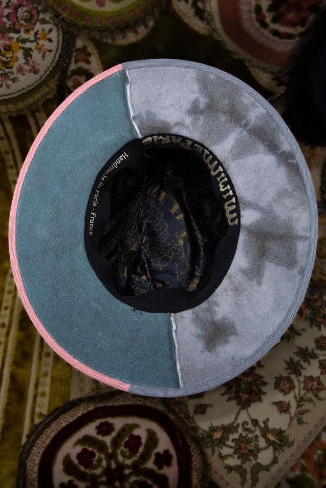 The interior is fully lined with the exclusive "Tatoo" design by Minime Paris, offering not only comfort but a hidden layer of artistic identity. The hat’s rigid brim is structured with grosgrain-trimmed brass, blending rose and grey tones for a subtle yet refined contrast.