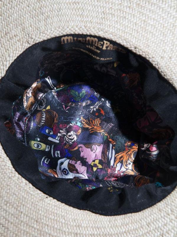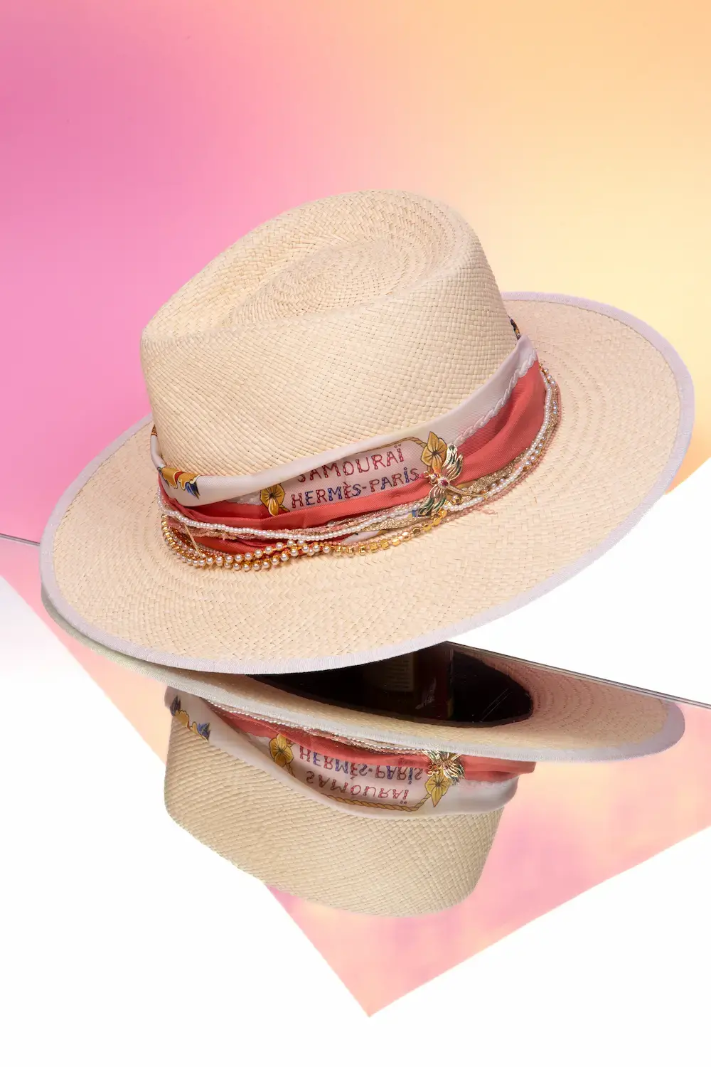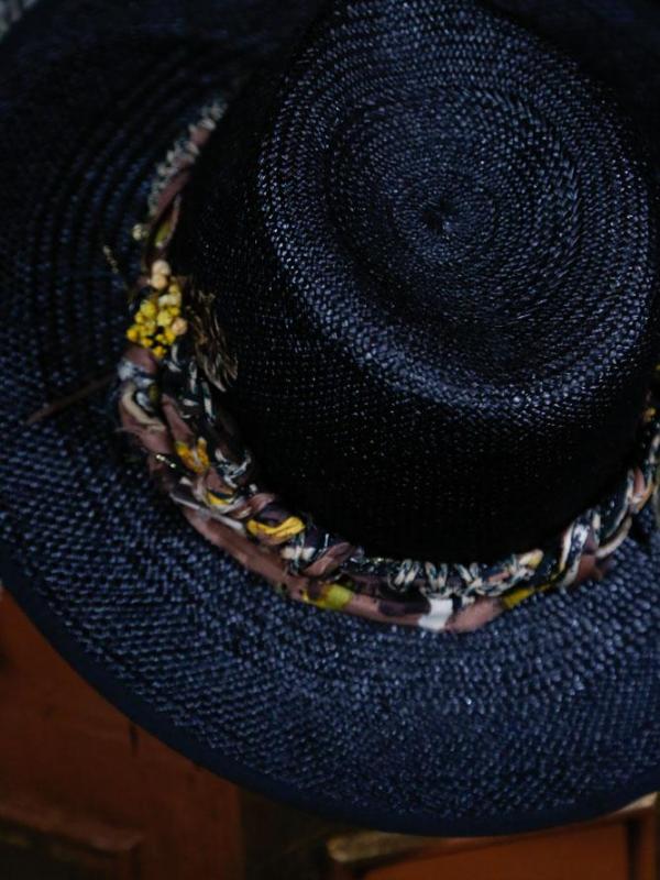 A panama straw hat with twisted fabric and yellow twigs, featuring a rigid brim with brass piping and...