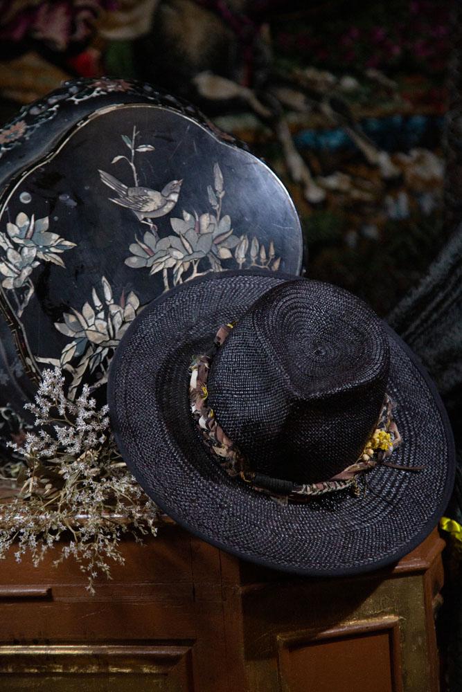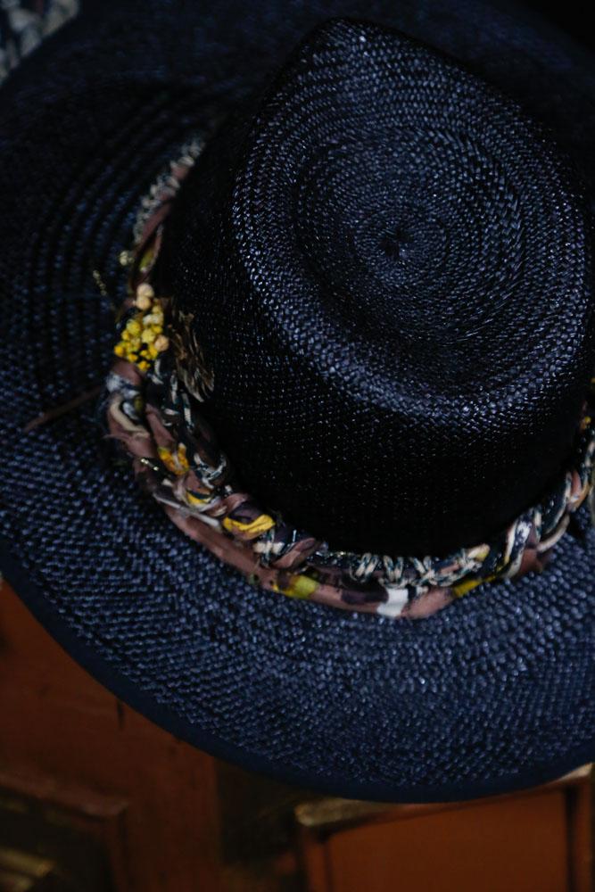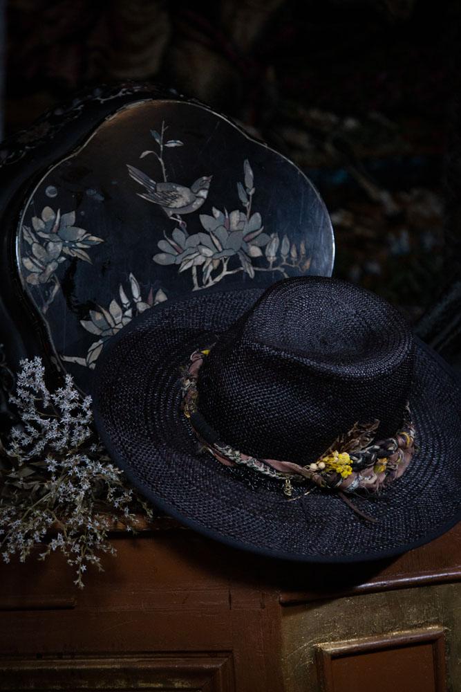 Black Panama Hat: Handcrafted Straw Hat with Twisted Fabric and Yellow Twigs