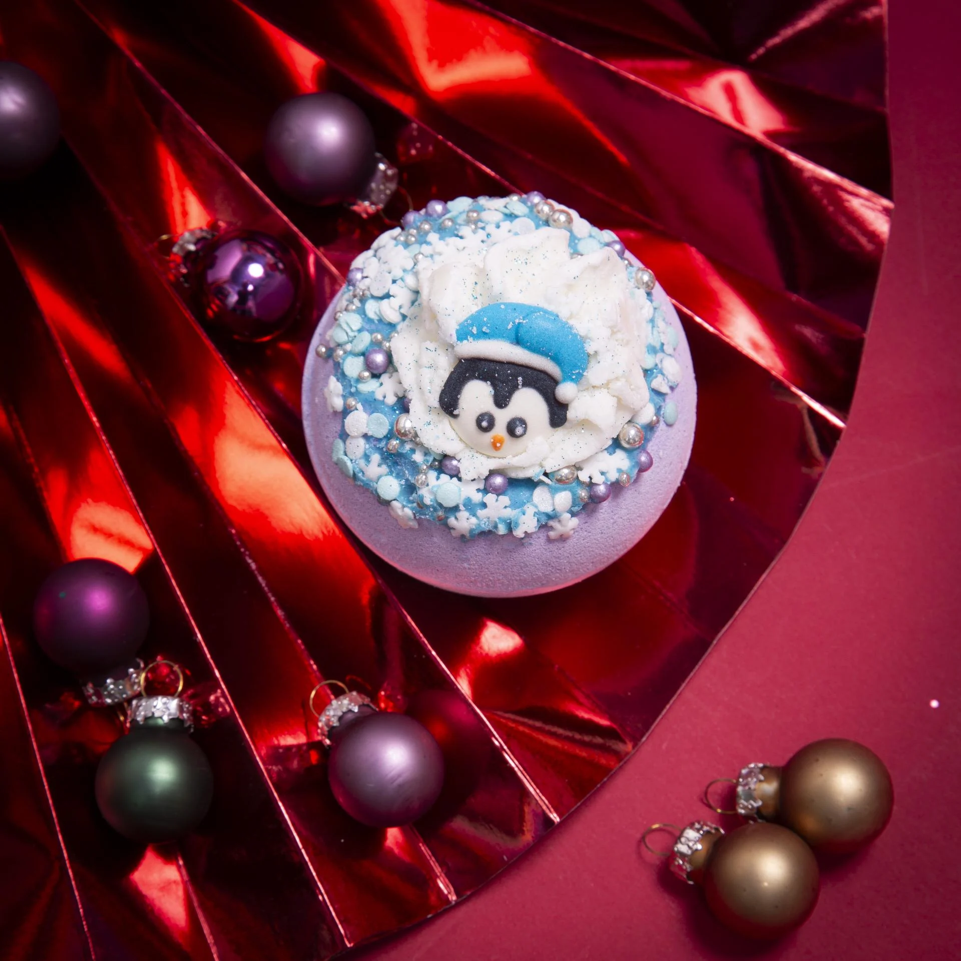 A festive bath bomb topped with a cute winter penguin design and frosty blue decorations.