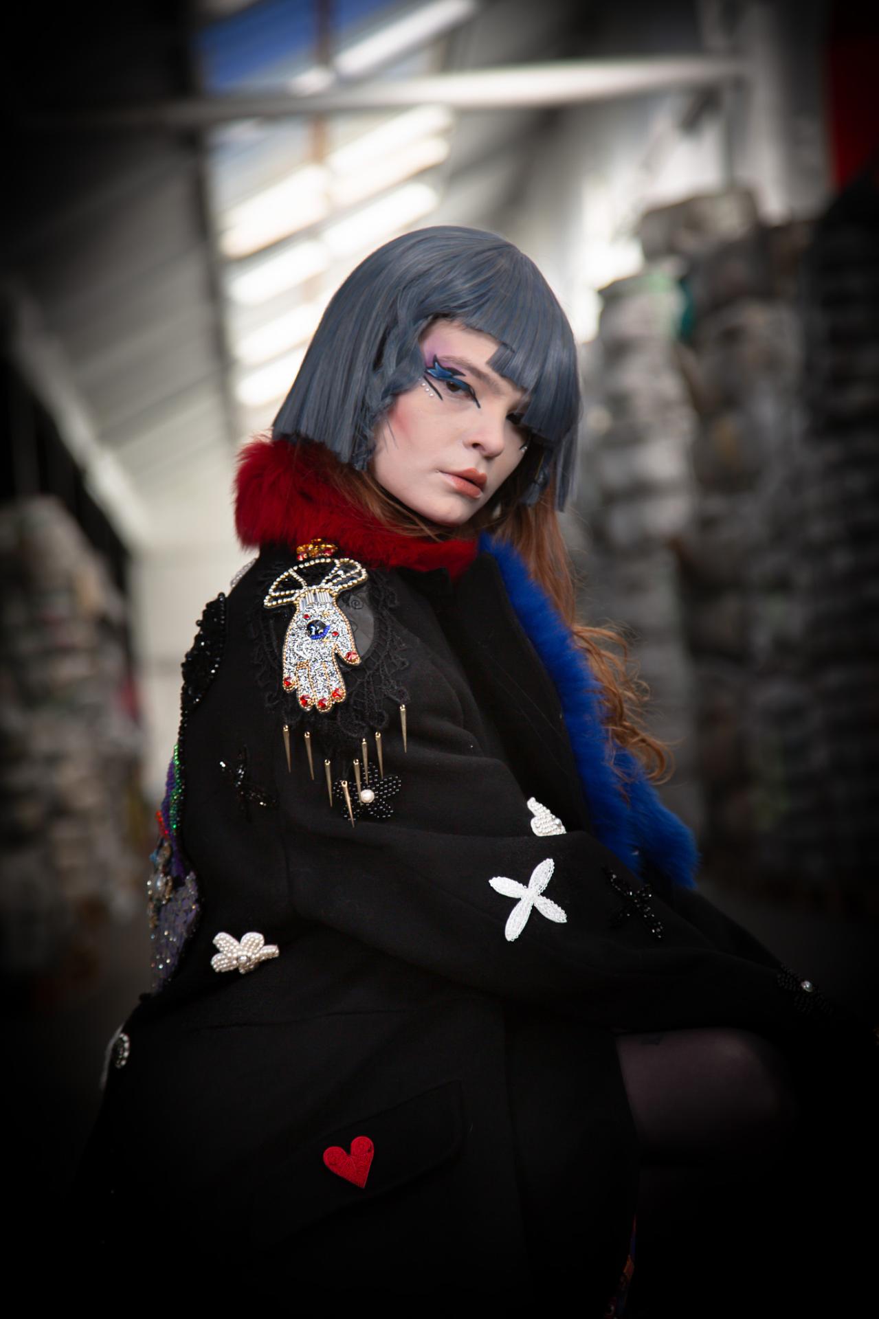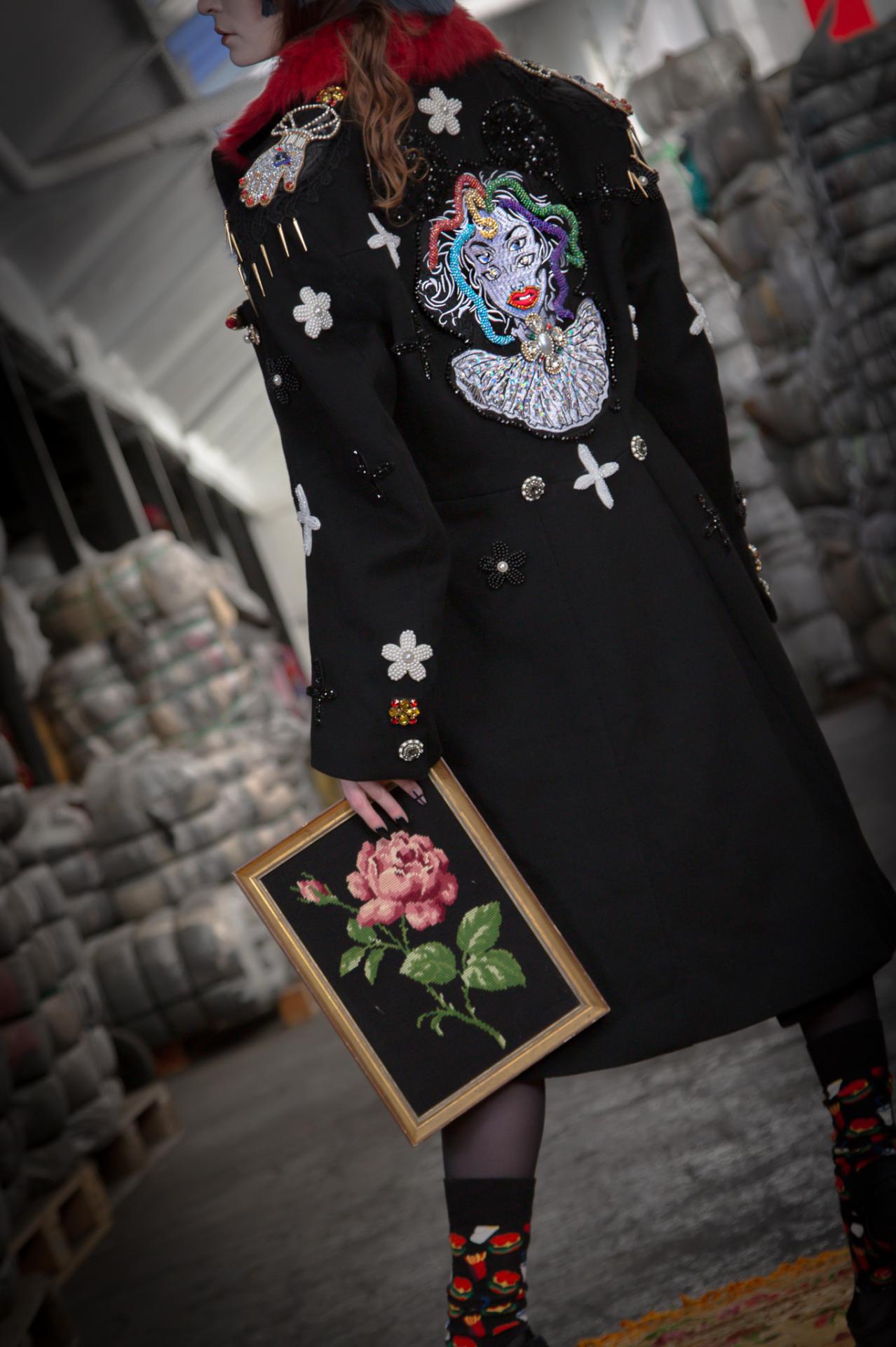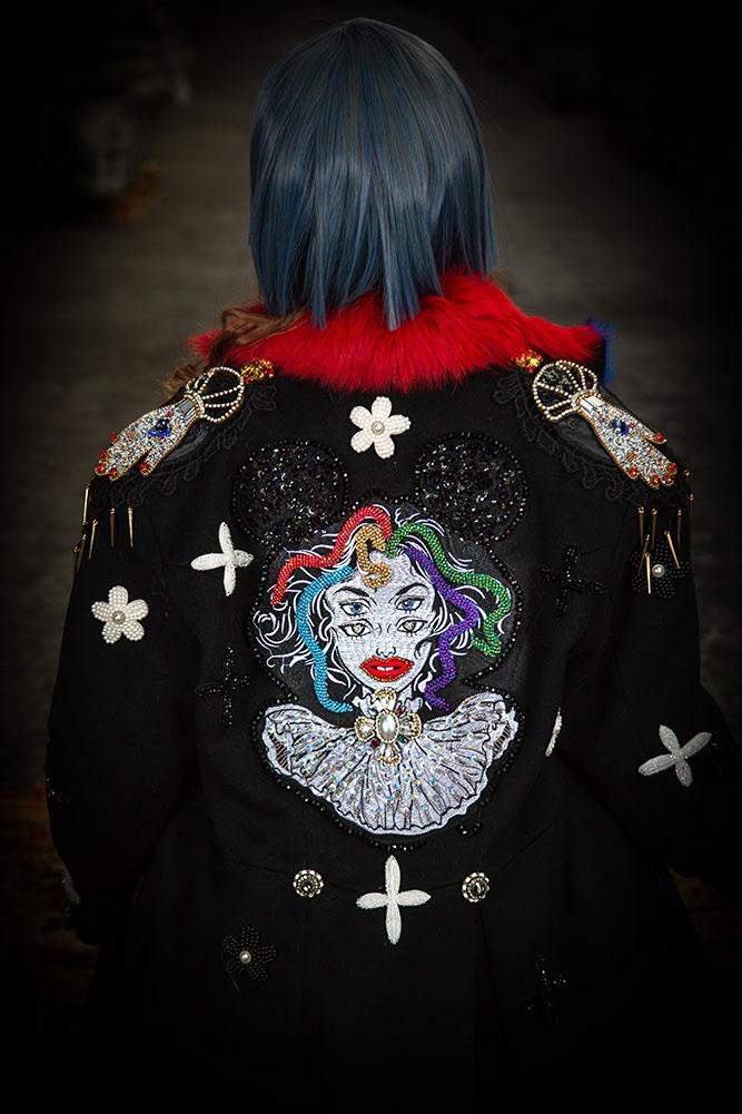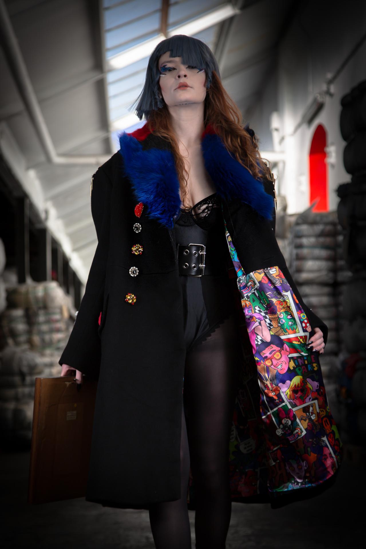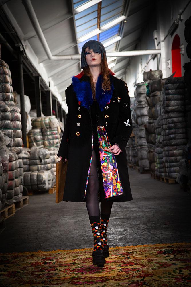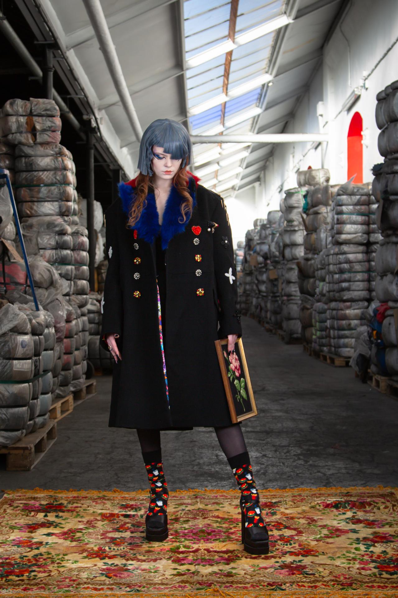 A black coat with a blue and red faux fur collar and a colorful printed lining.