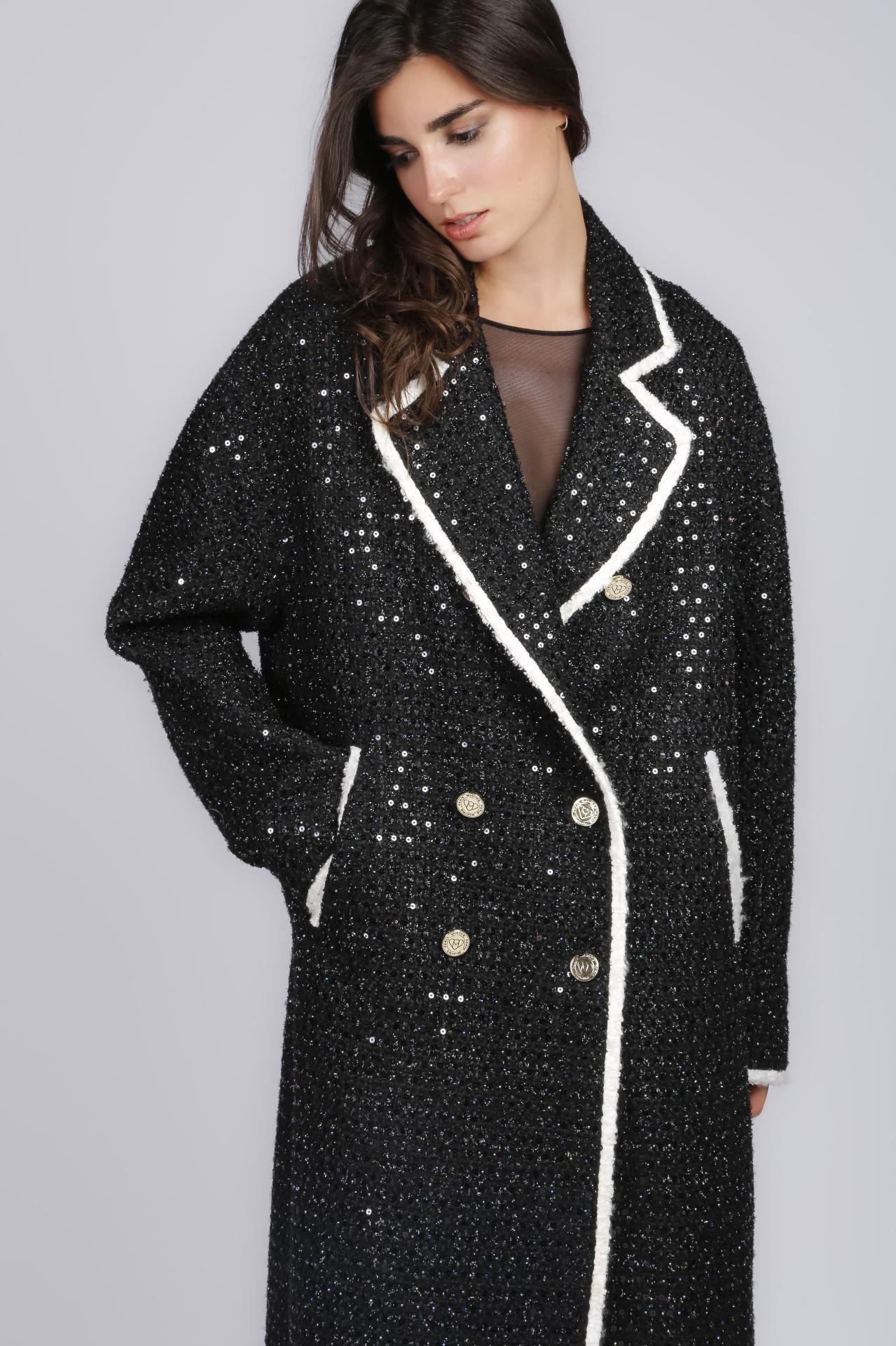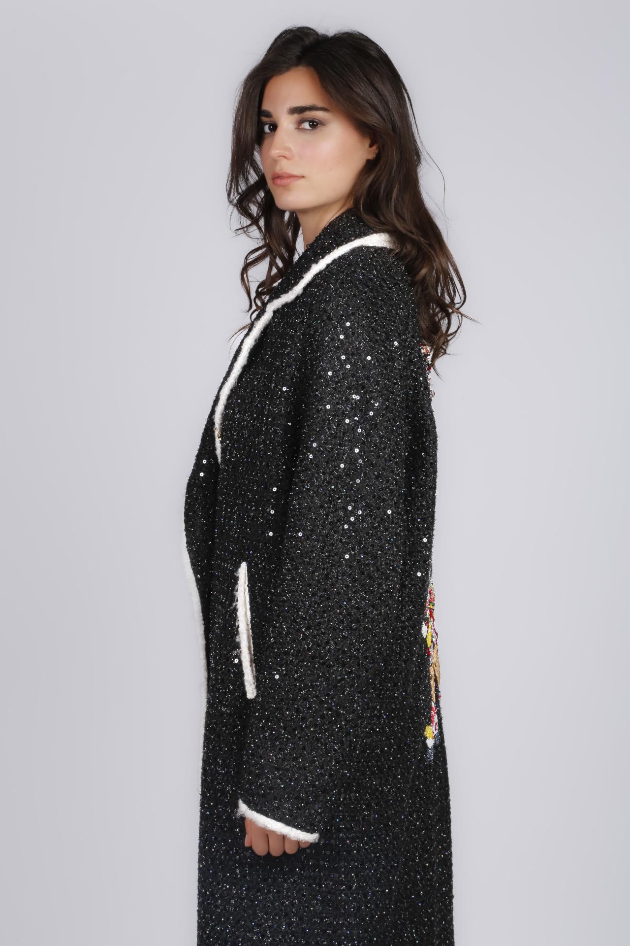 A black coat with sequins and a beaded design on the back.