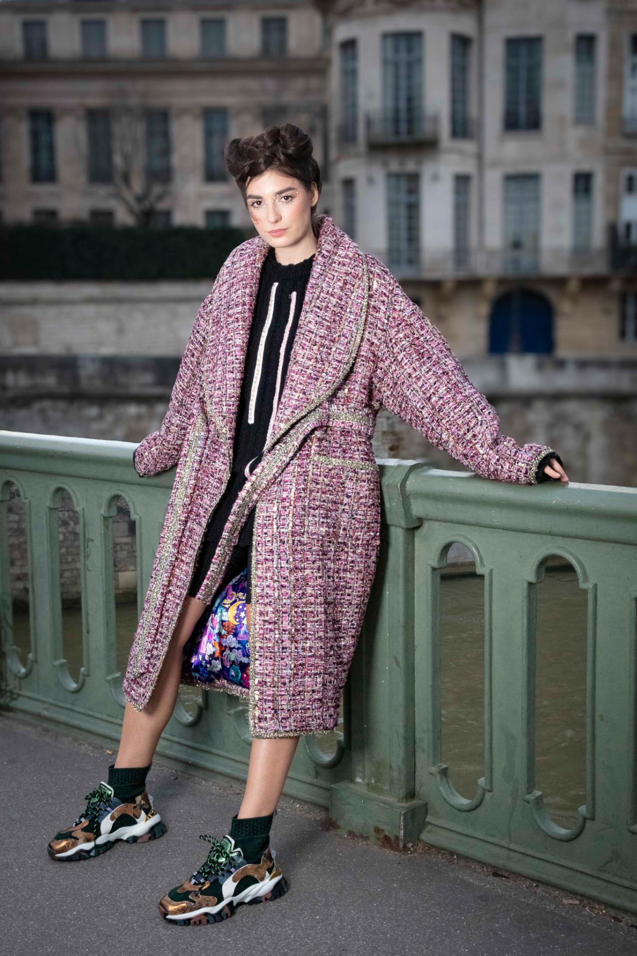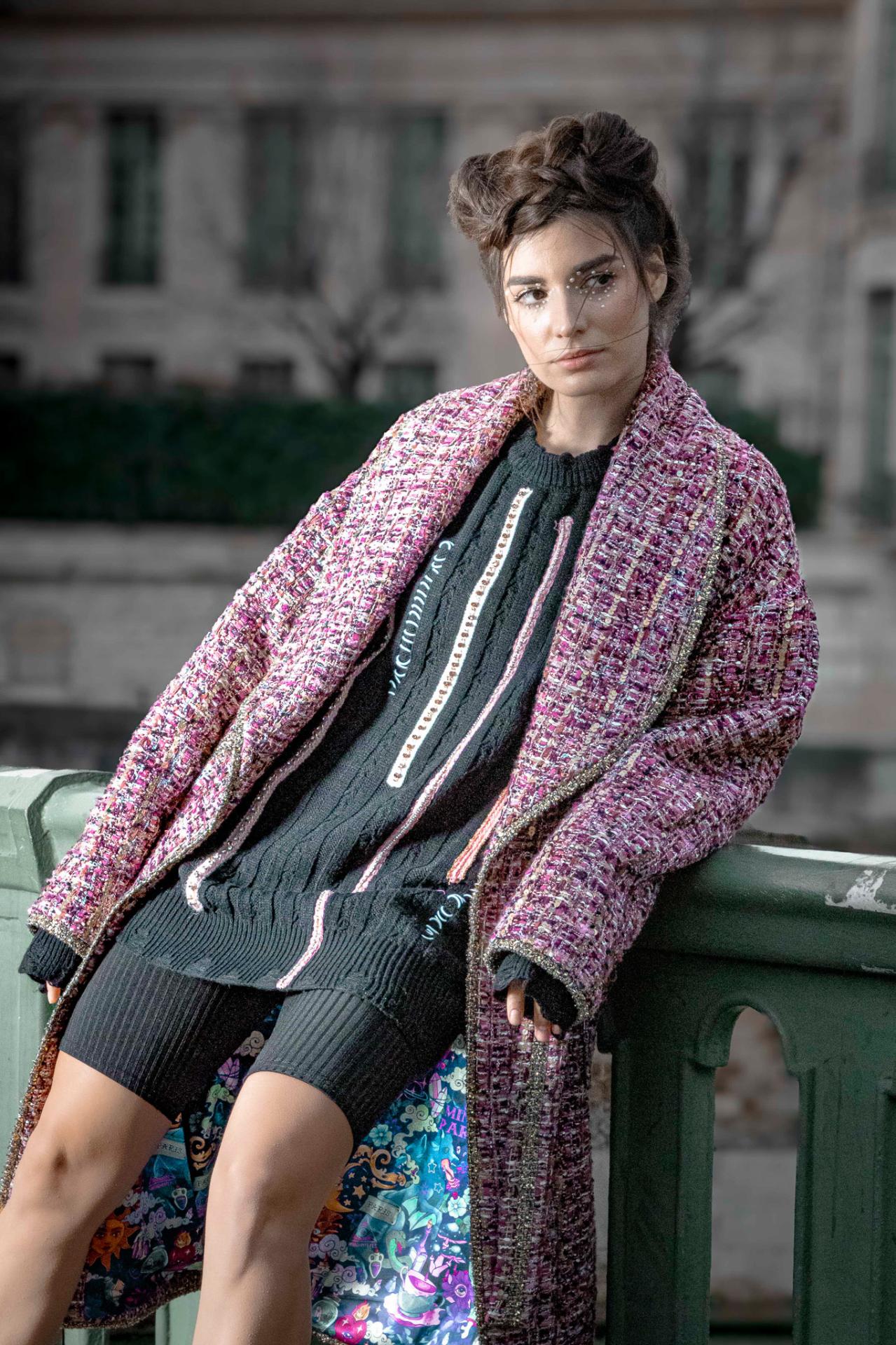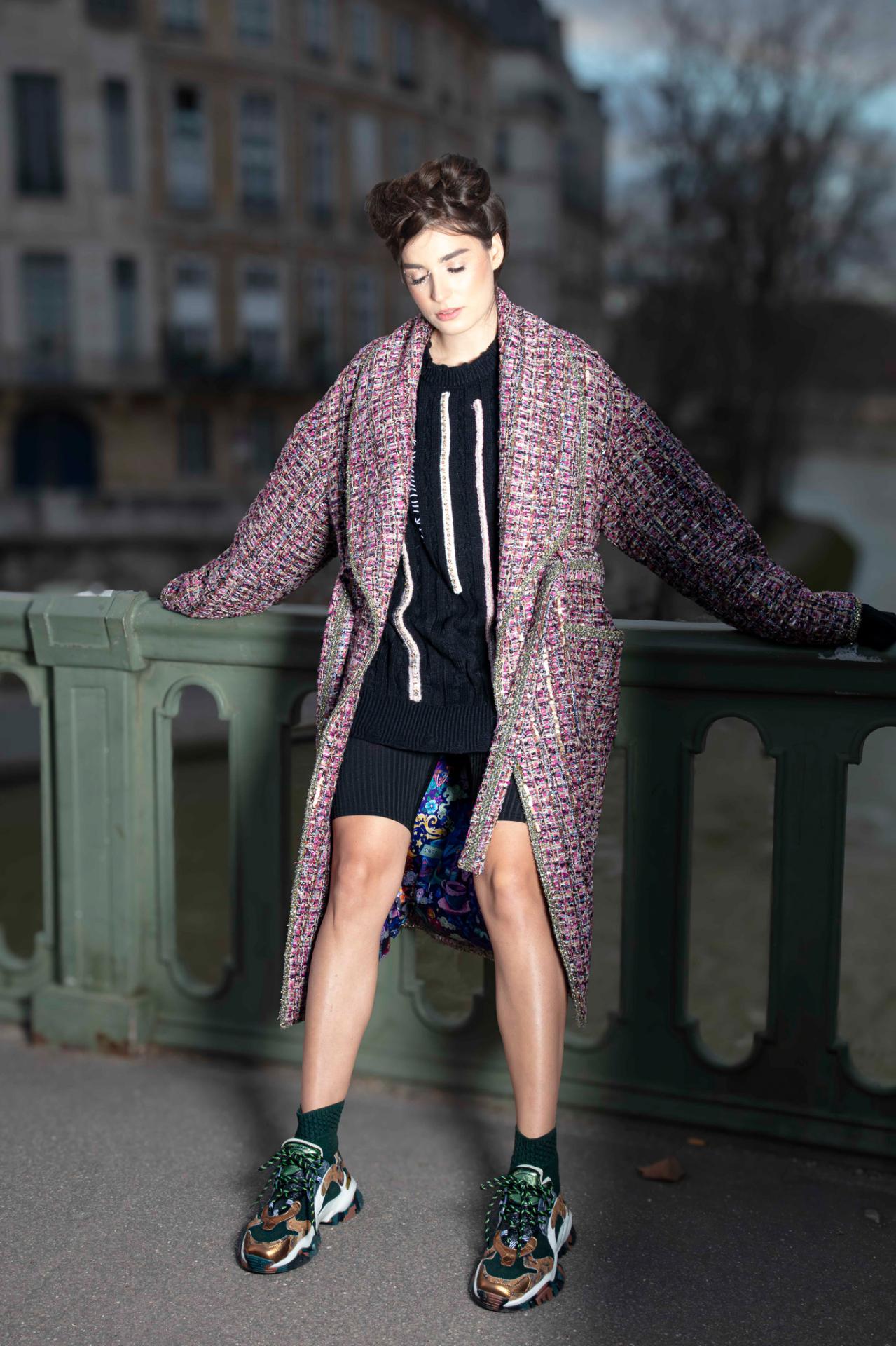 An oversized multicolor tweed coat with wide lapels and a printed lining.
