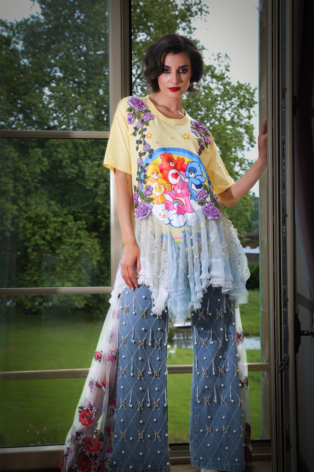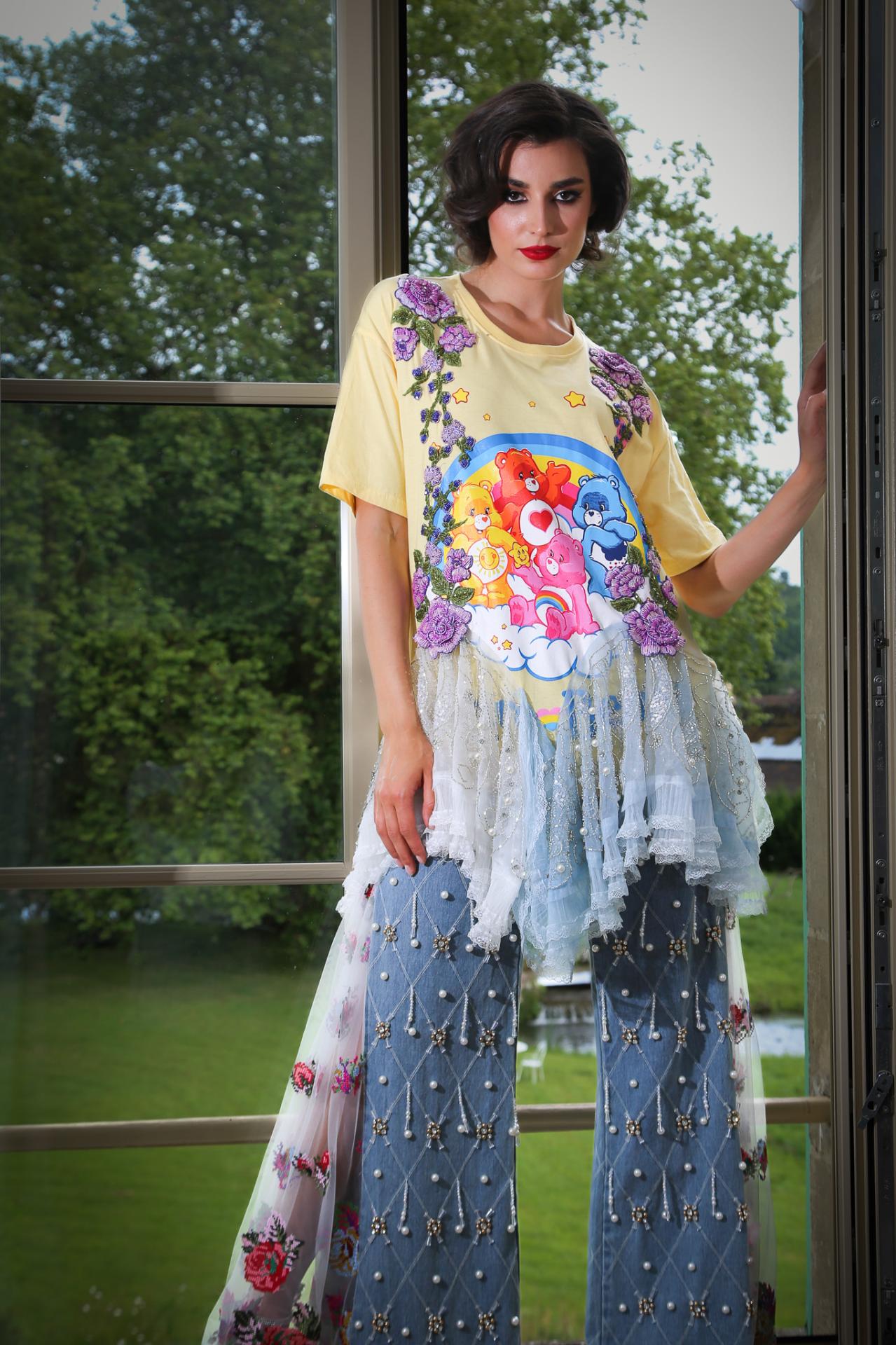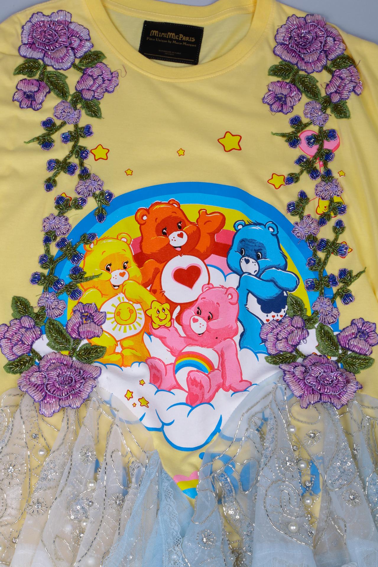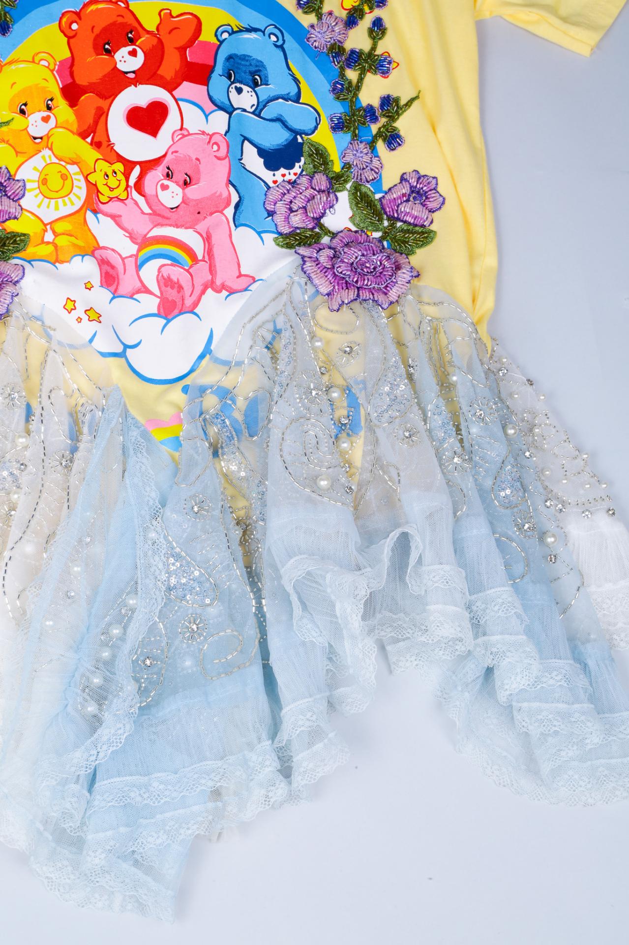 This enchanting Care Bears dress transforms a playful childhood icon into a dreamy, couture-inspired silhouette. The soft pastel-yellow jersey top showcases a vibrant illustration of the beloved Care Bears surrounded by stars, clouds, and blooming violet flowers, a joyful artwork that radiates warmth, nostalgia, and positivity.