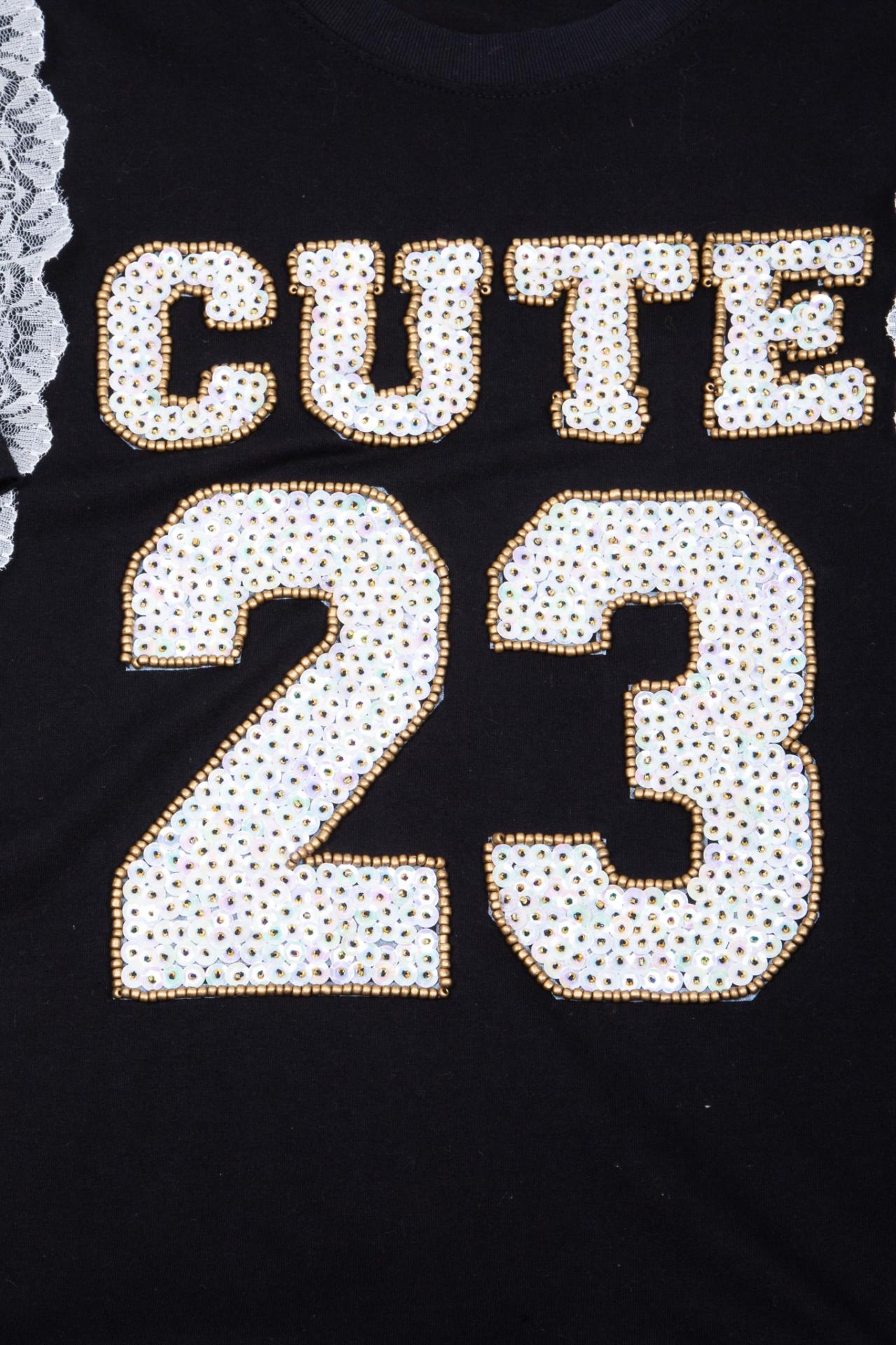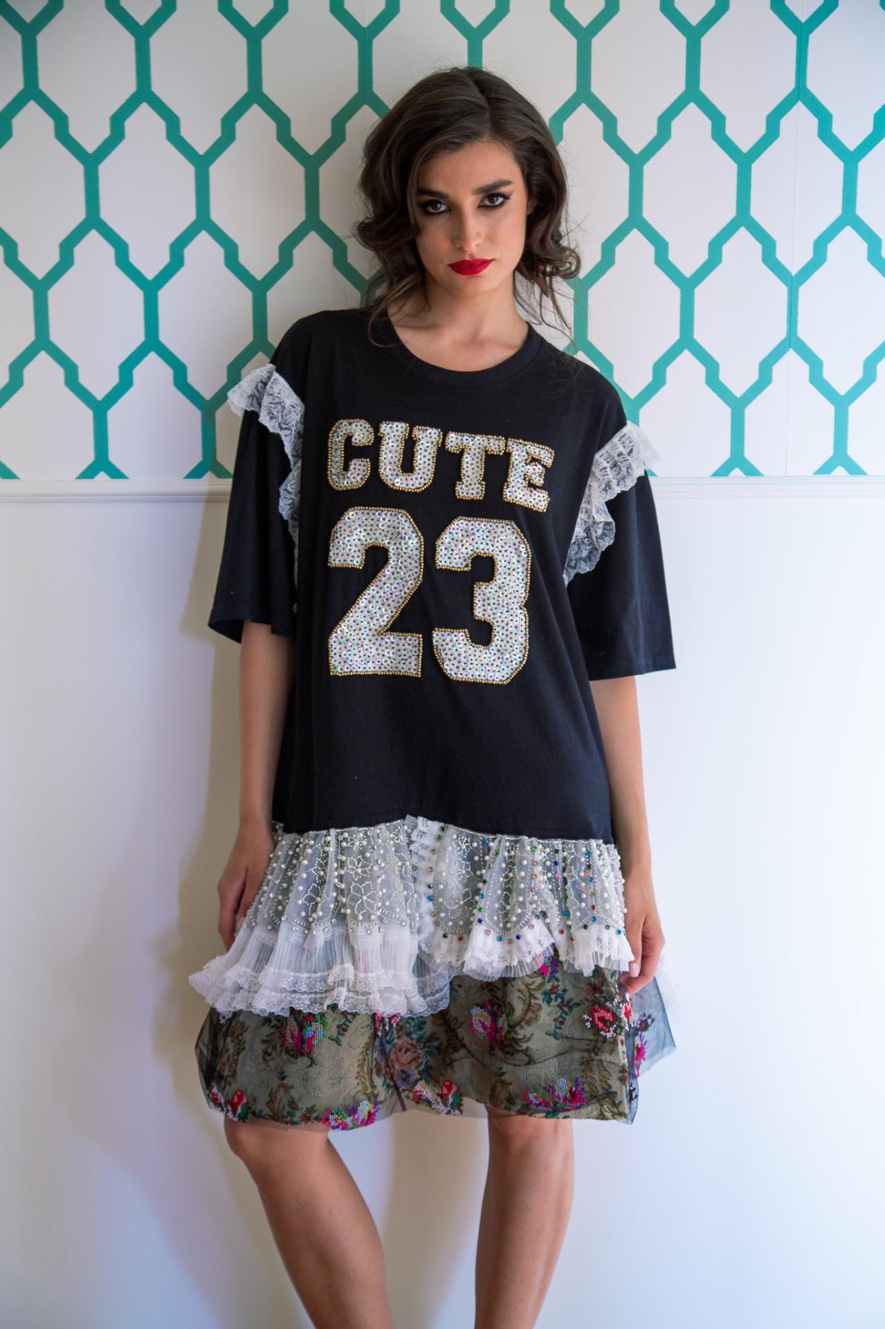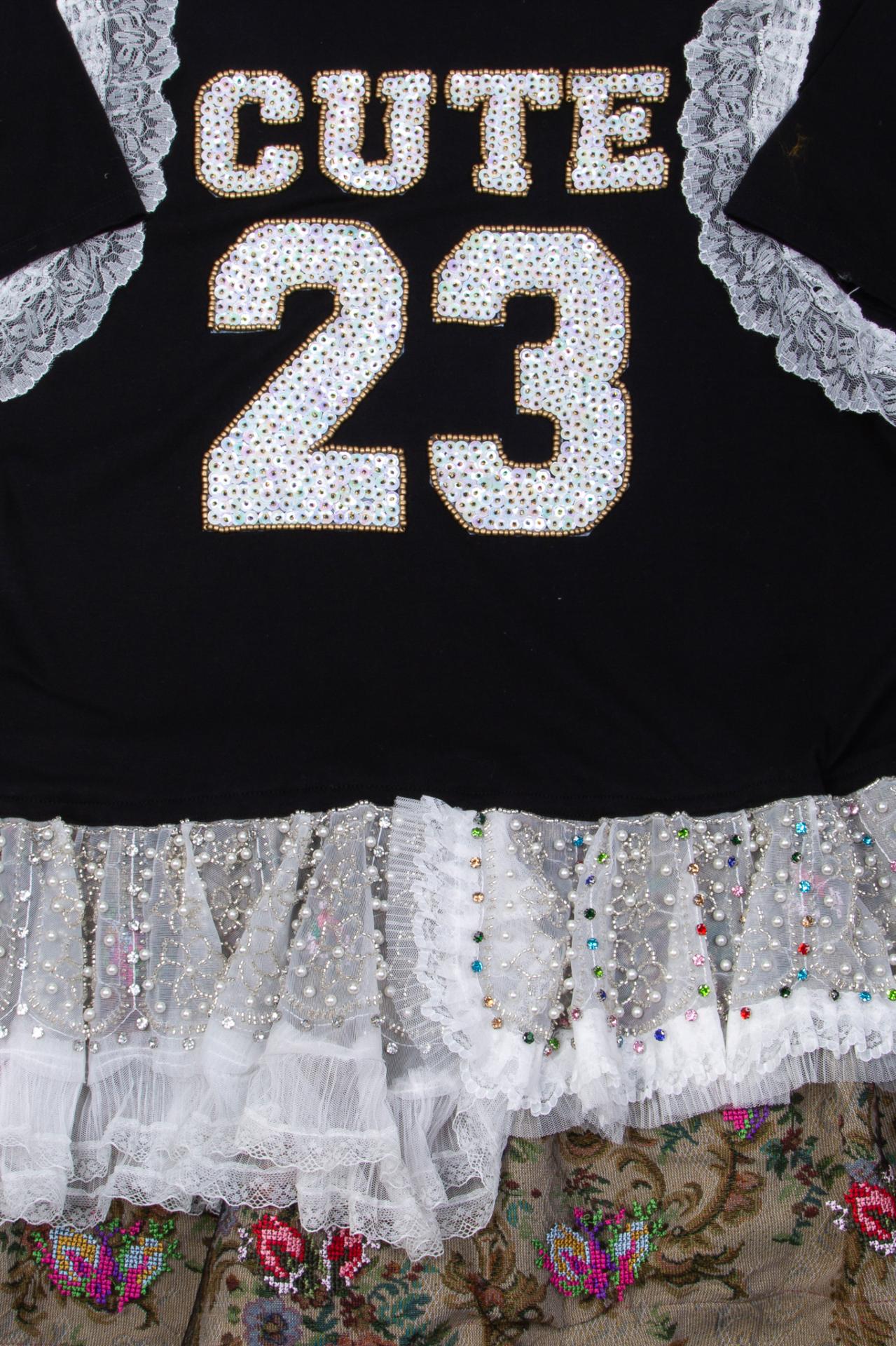A playful statement dress blending sporty charm with romantic lace, featuring bold CUTE 23 lettering, delicate ruffled panels, and a whimsical mix of textures.