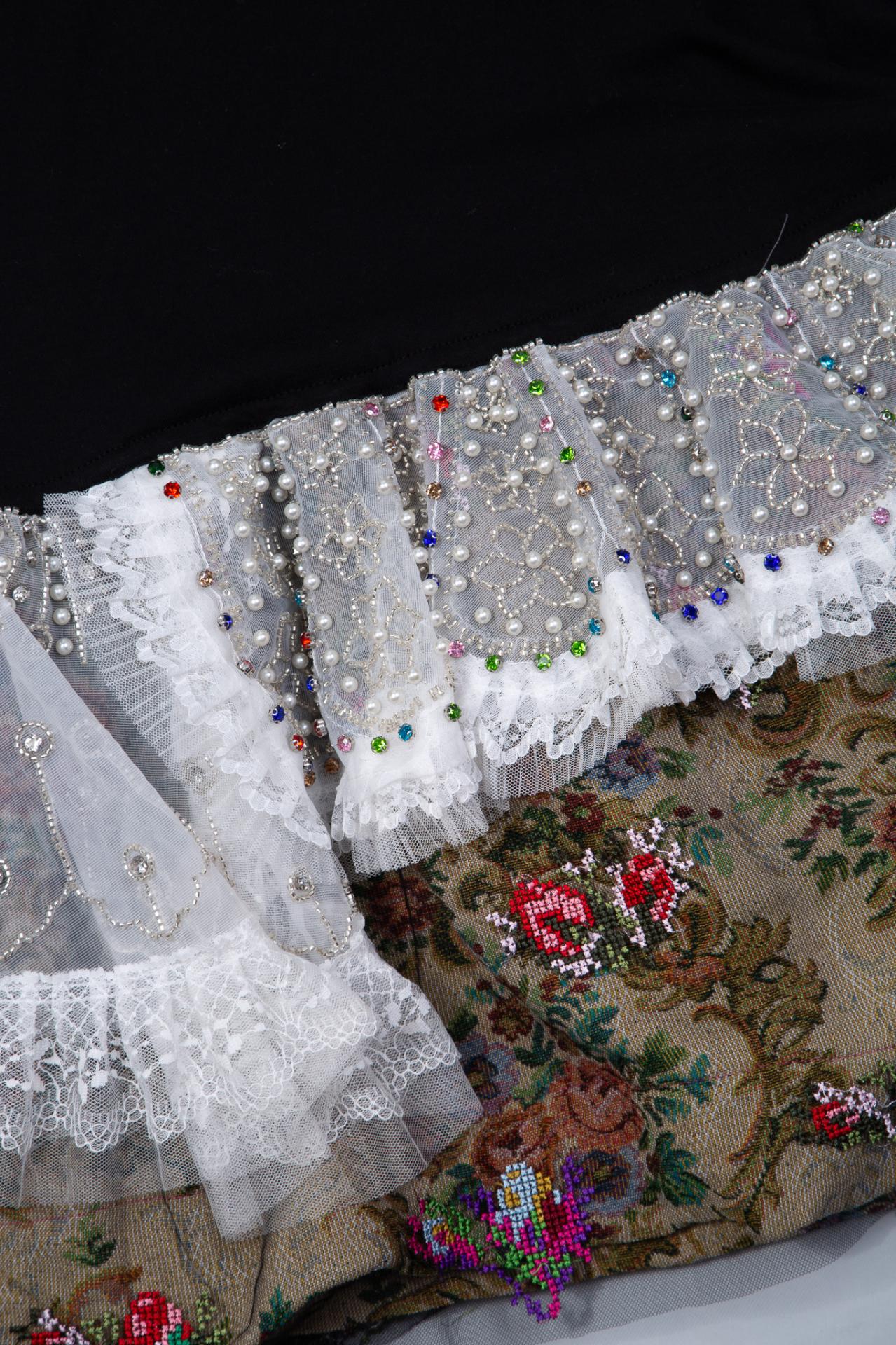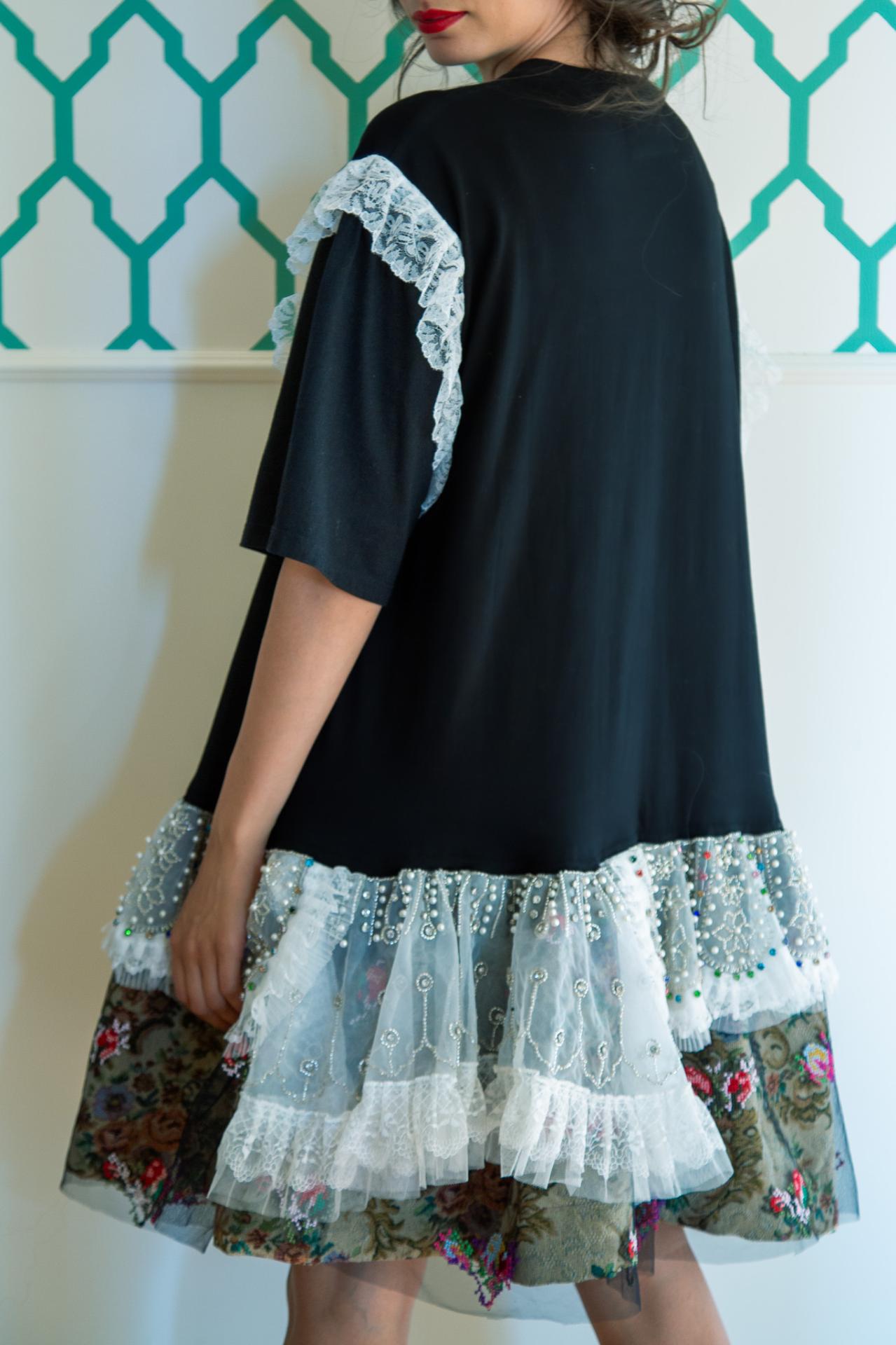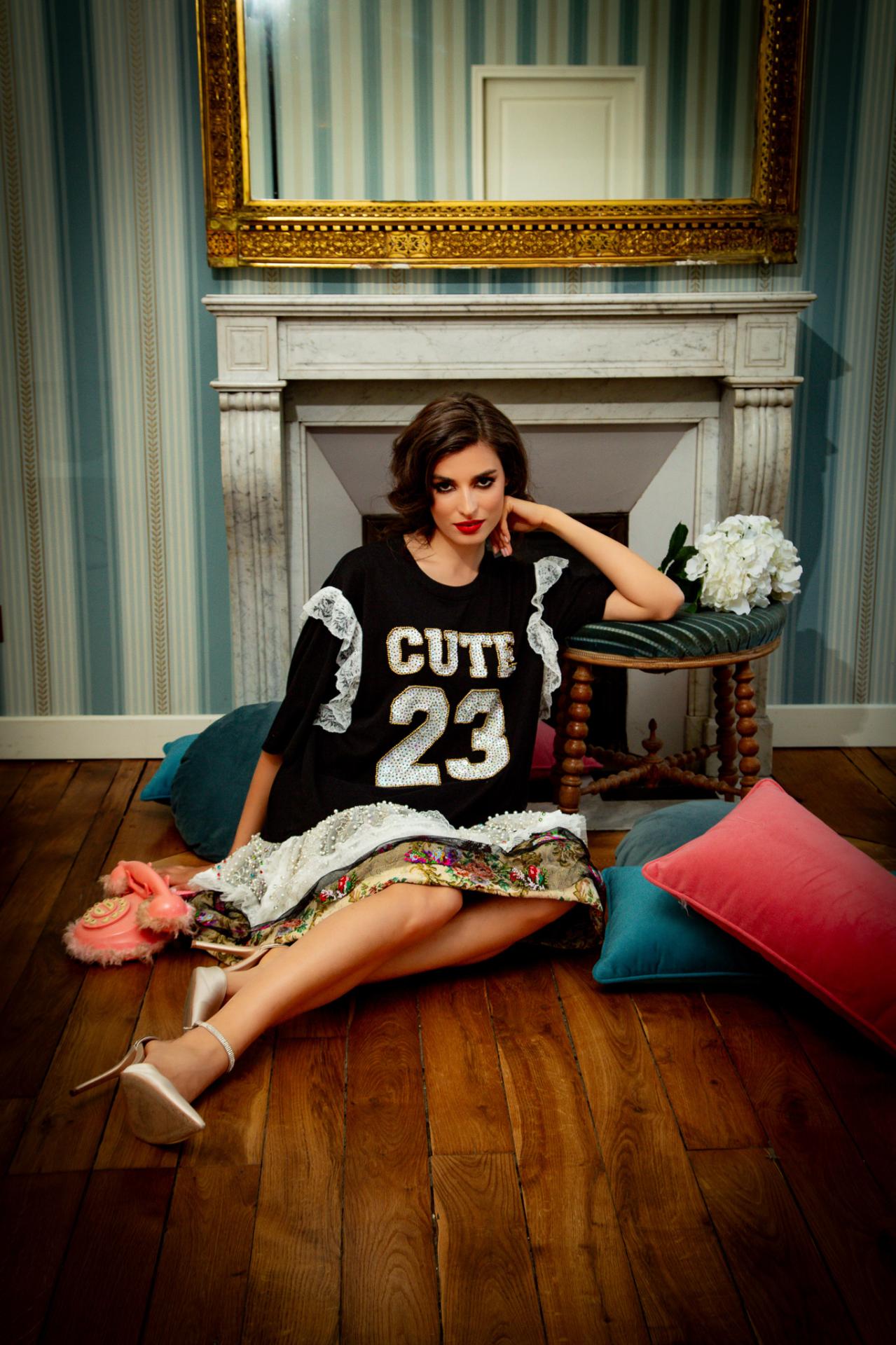A playful statement dress blending sporty charm with romantic lace, featuring bold CUTE 23 lettering, delicate ruffled panels, and a whimsical mix of textures.