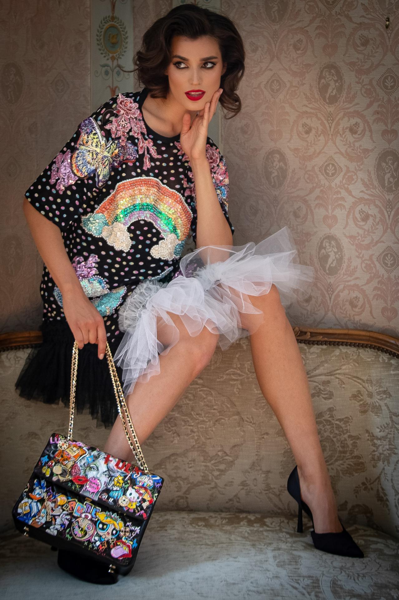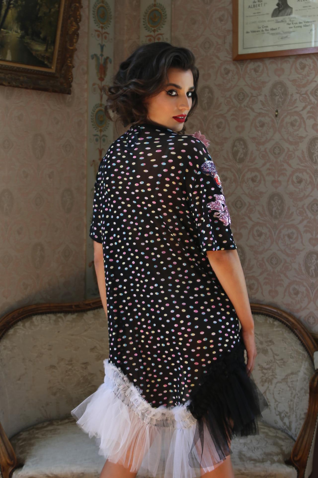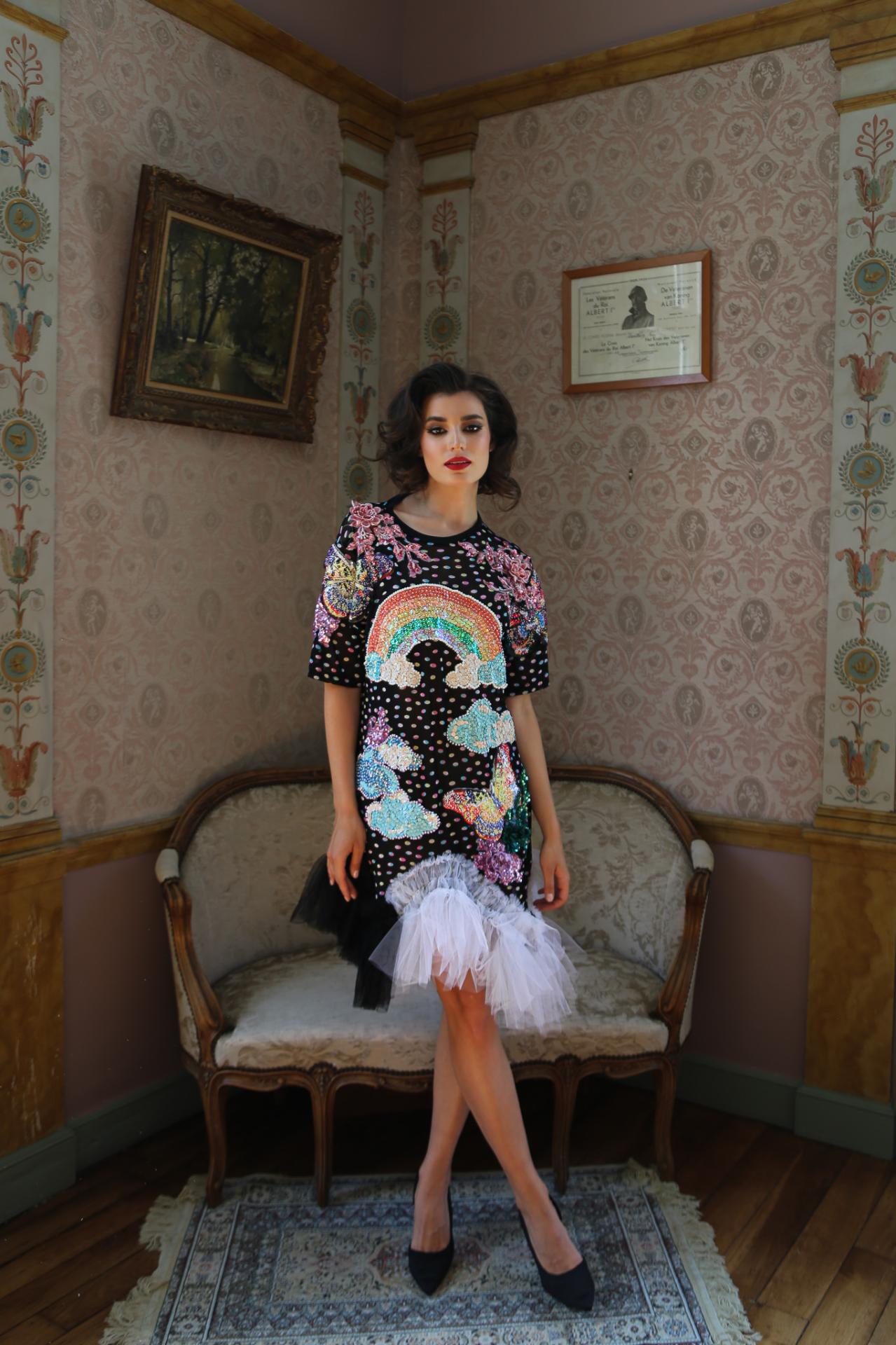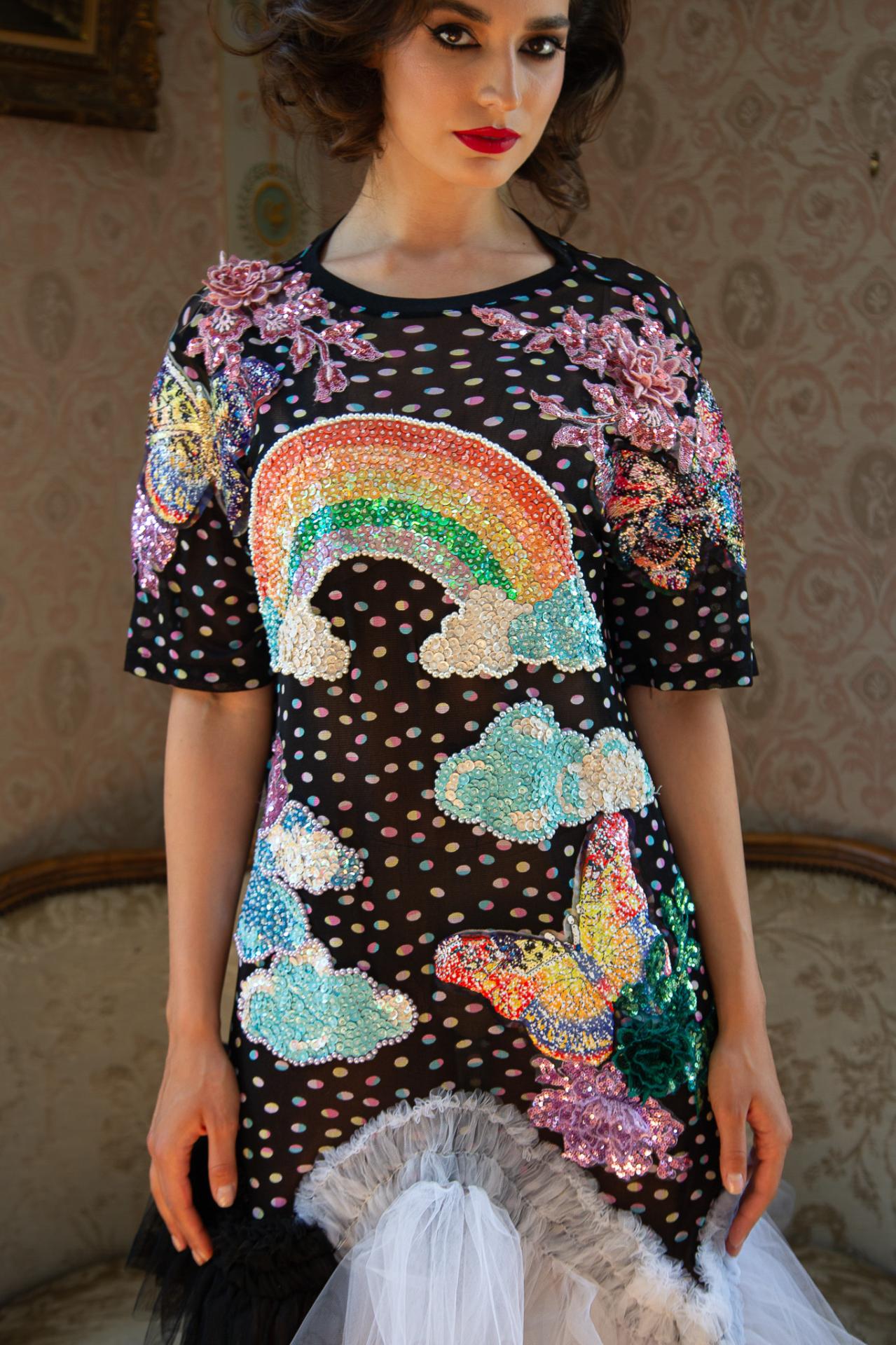 This enchanting dress blends playful fantasy with effortless comfort, turning a simple T-shirt shape into a wearable daydream. The base features a black polka-dot print that adds a touch of vintage charm, while the front is adorned with vibrant embroidered appliqués, a glowing rainbow, pastel clouds, and painterly floral bursts. The artwork creates a magical, storybook-like scene that feels joyful and expressive.