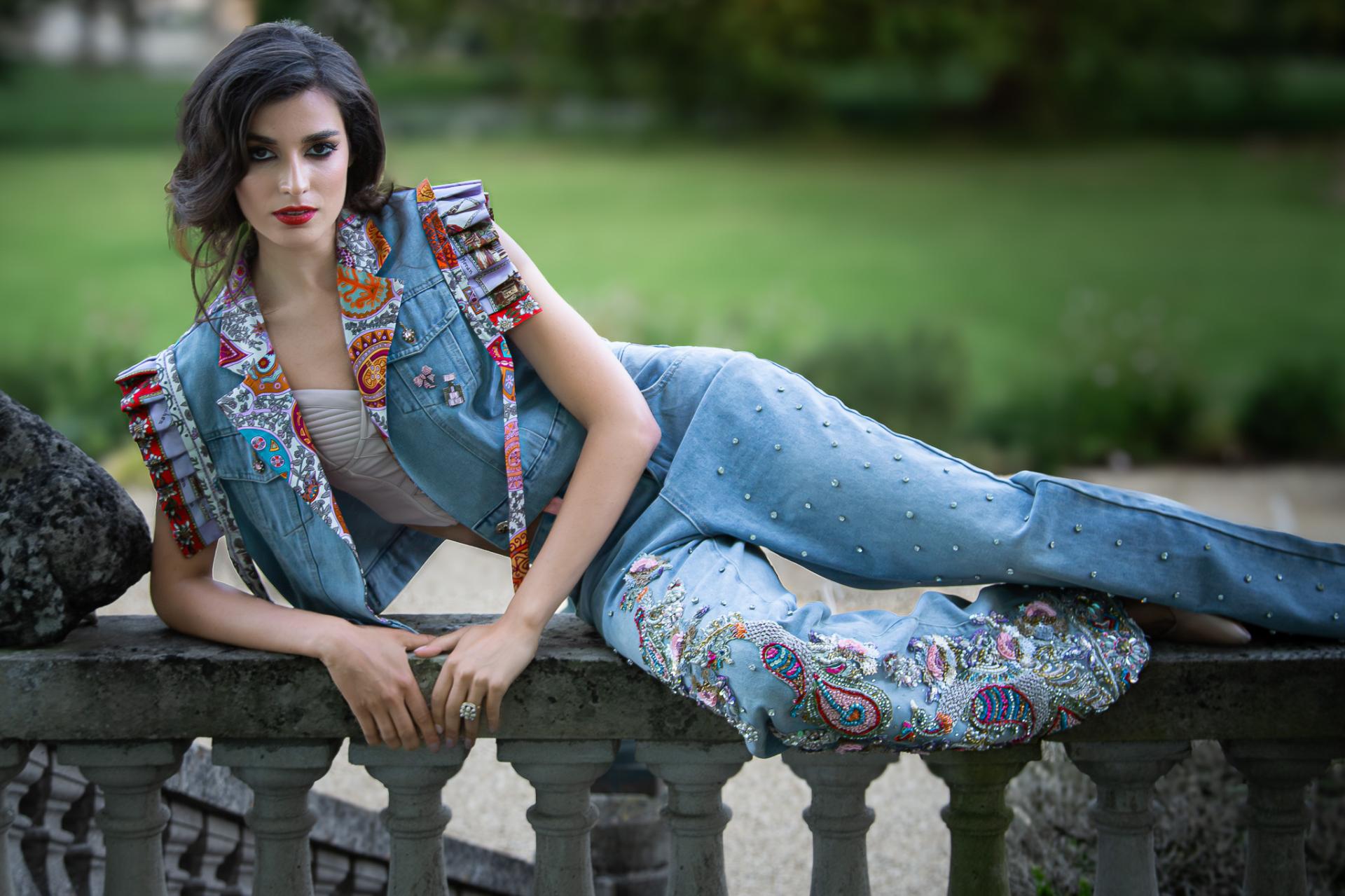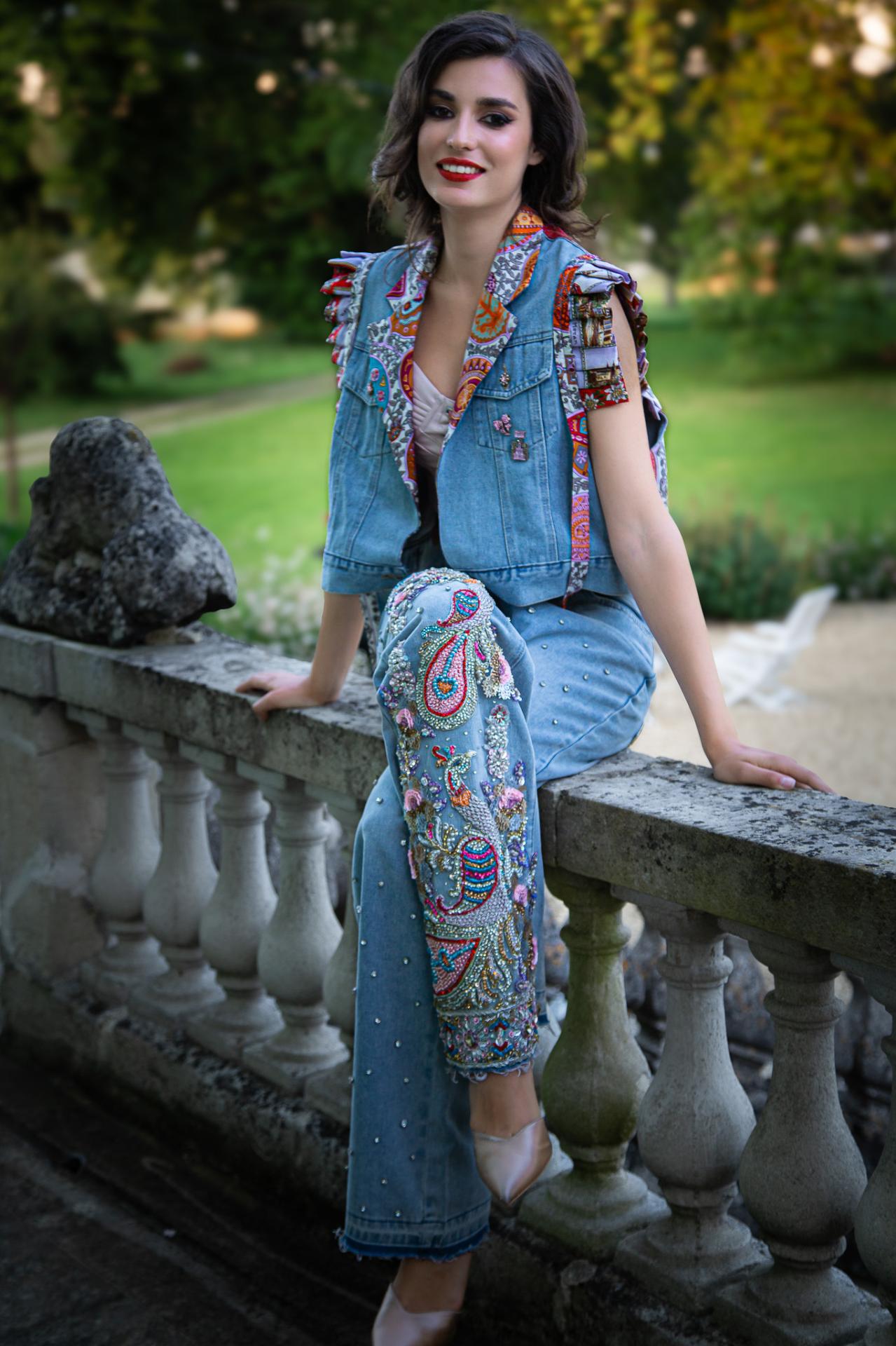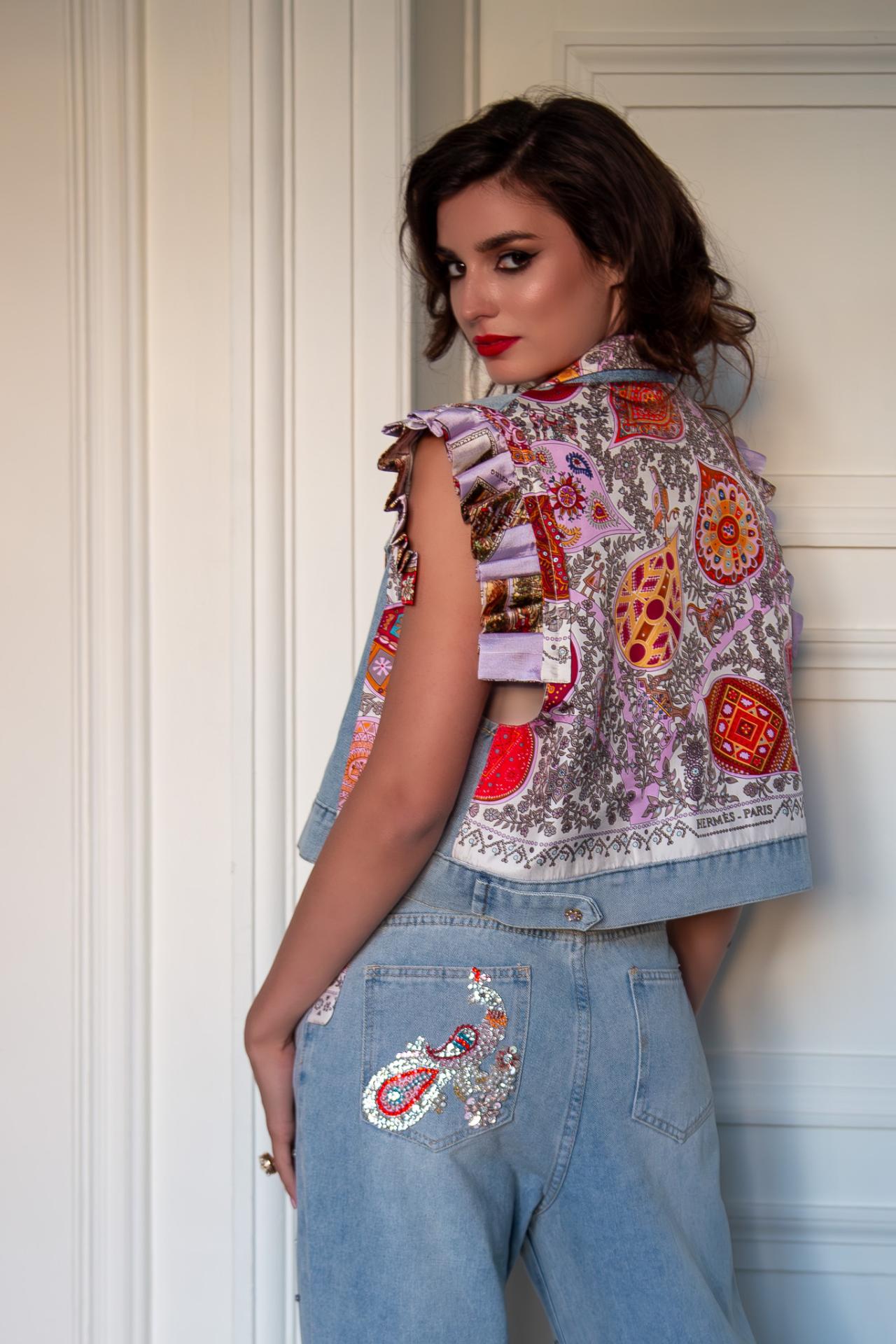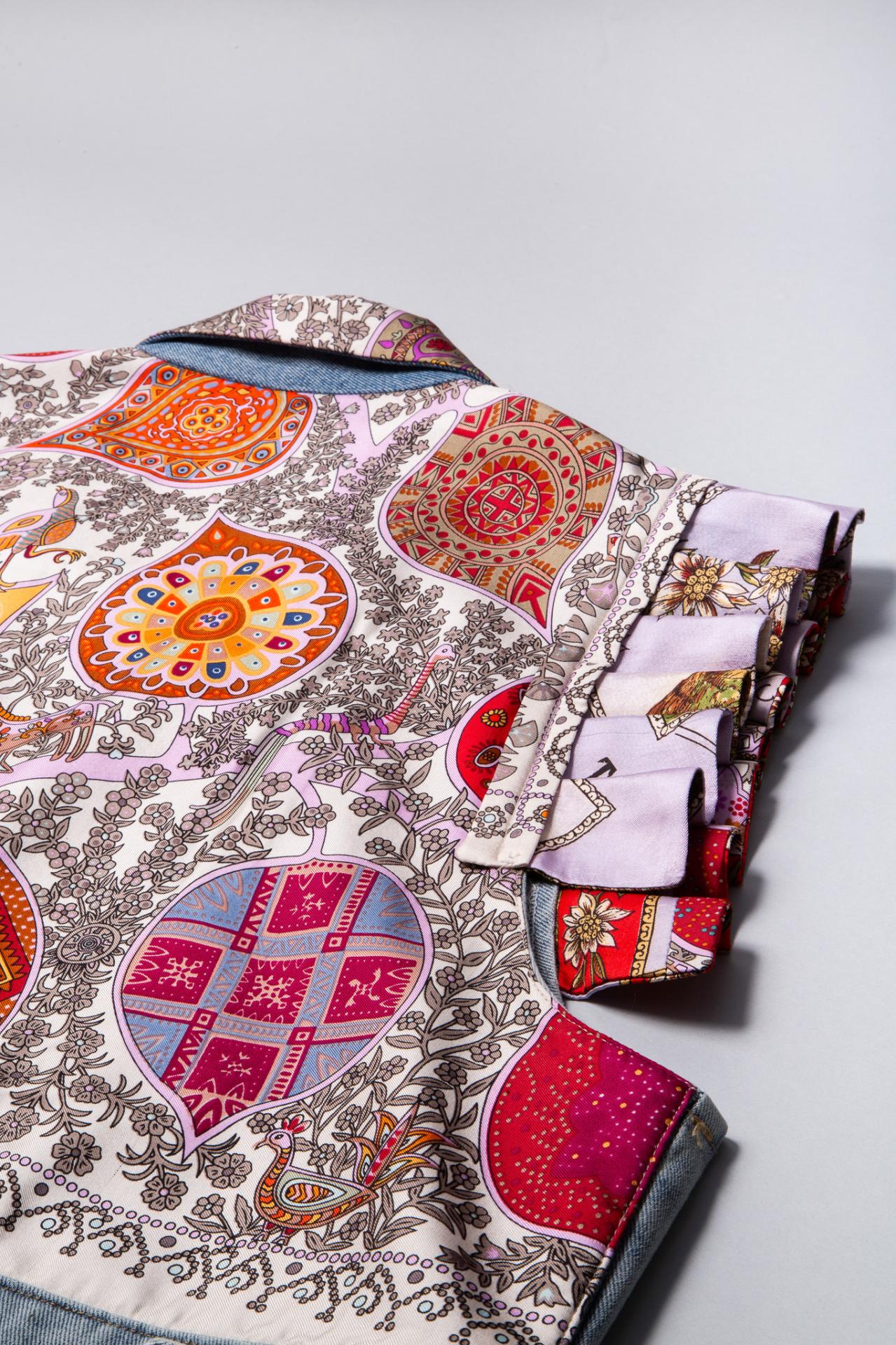 A denim vest with colorful silky print panels and pleated shoulder details.