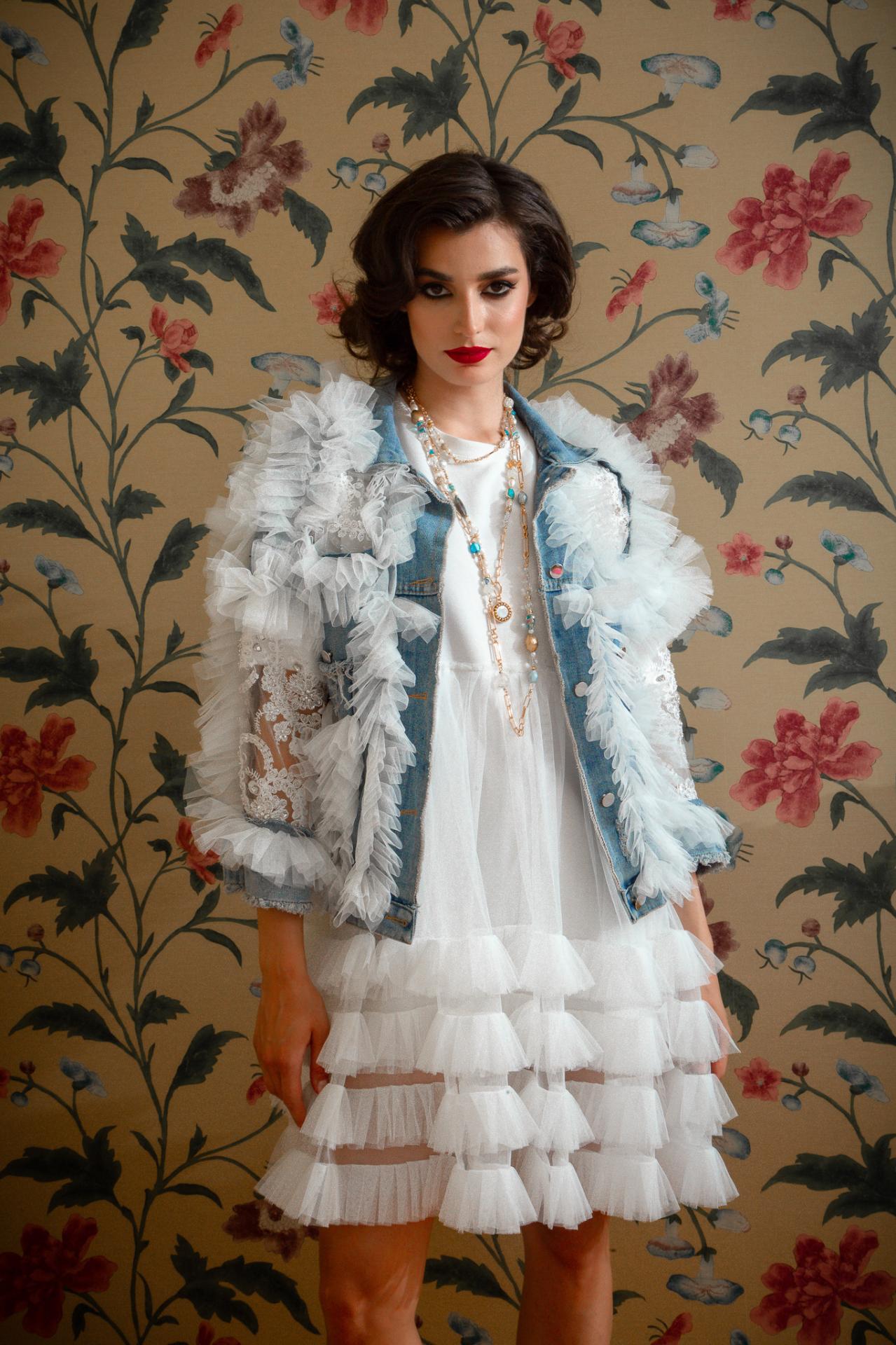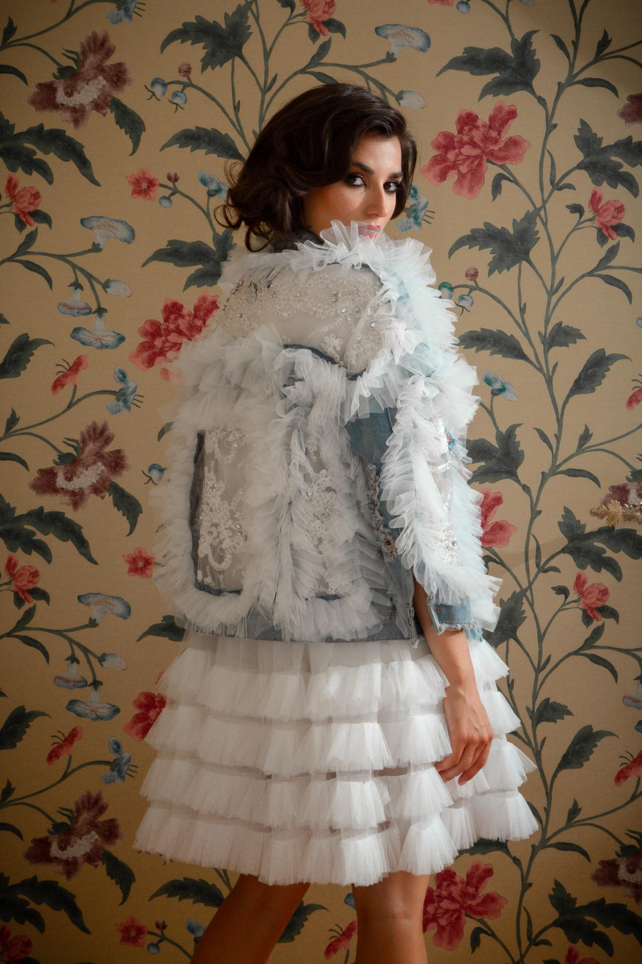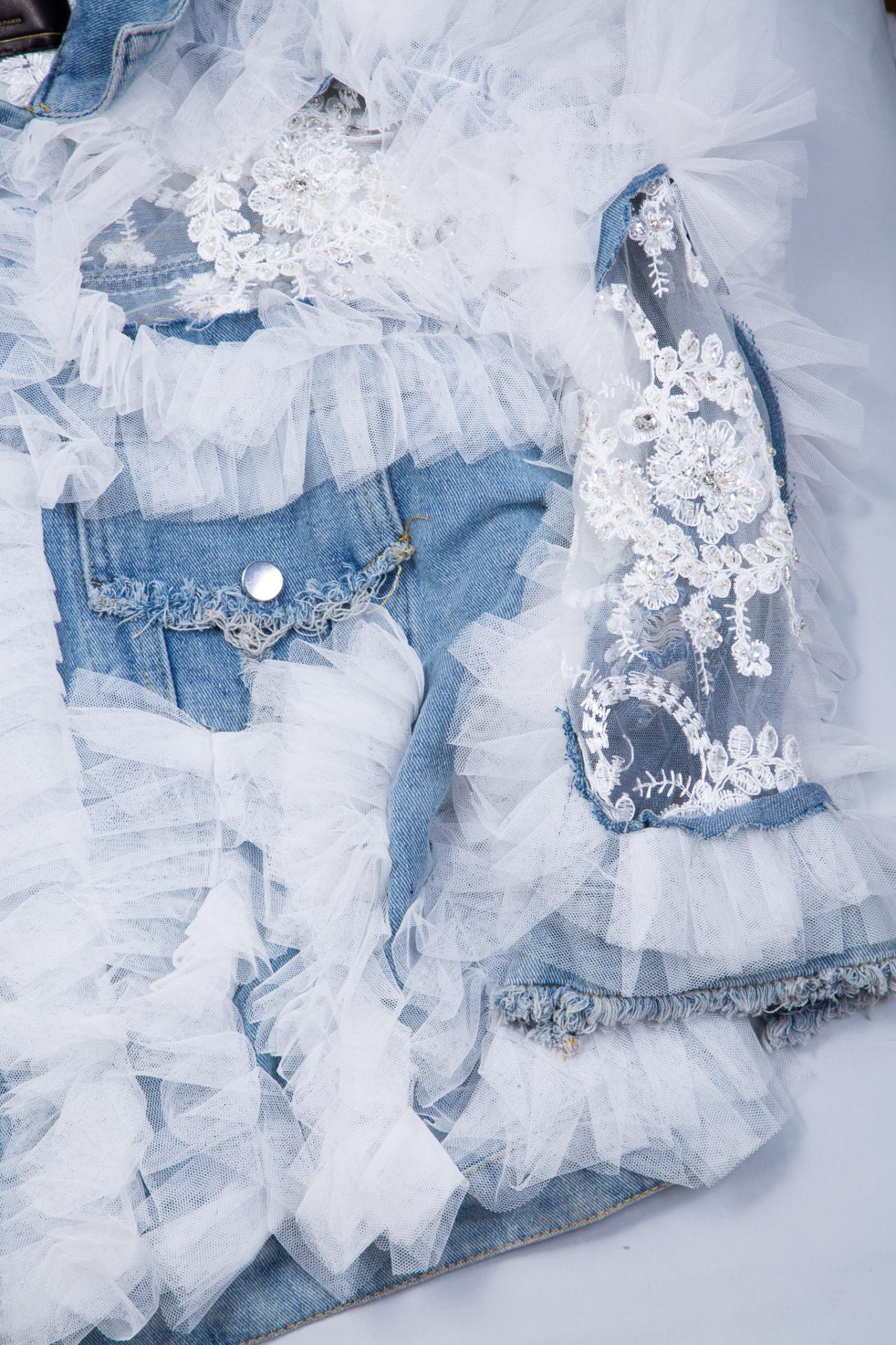 A denim jacket decorated with layered tulle ruffles and lace details.