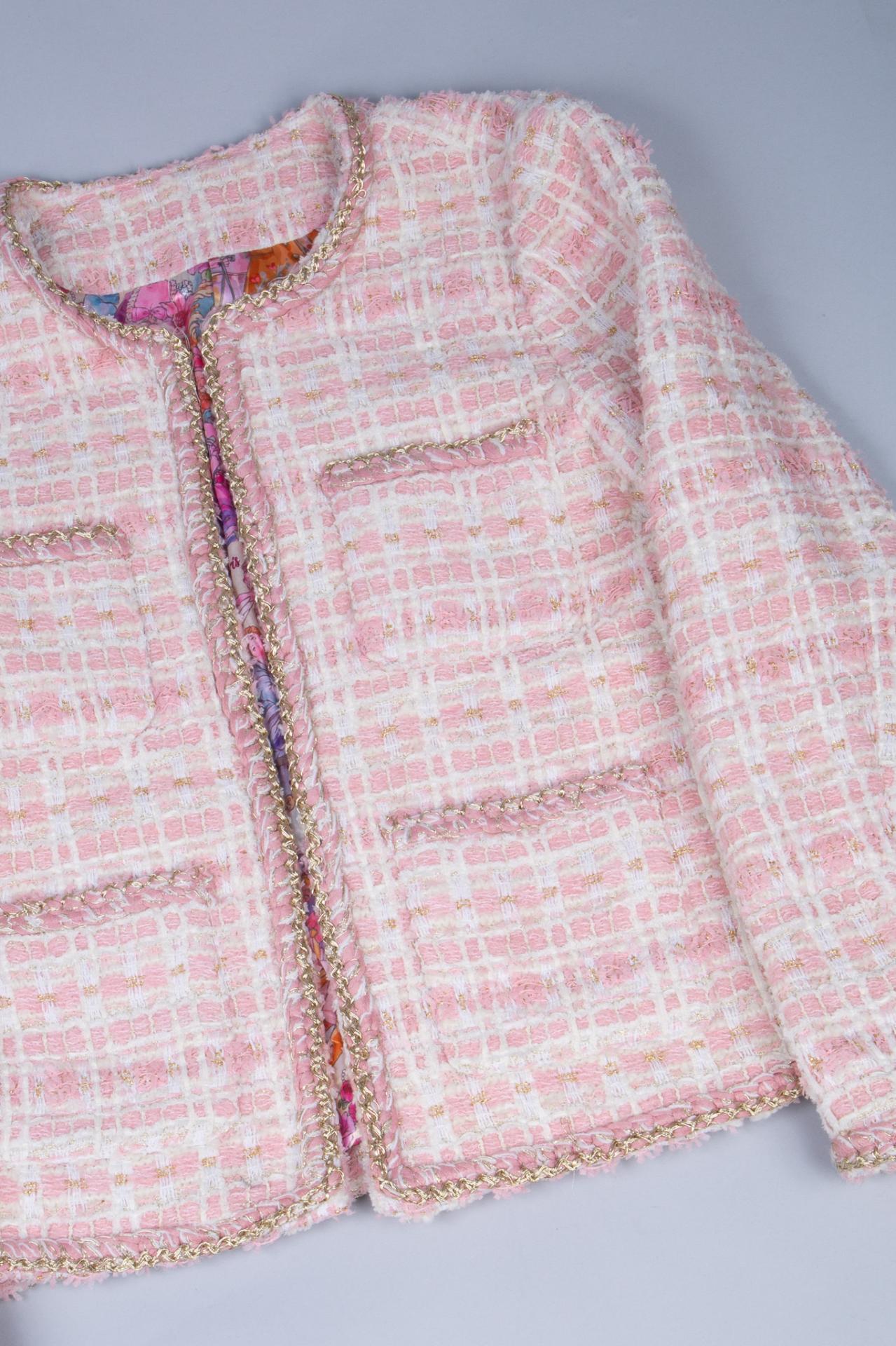 A pink and white tweed jacket with braided trim and front pockets.