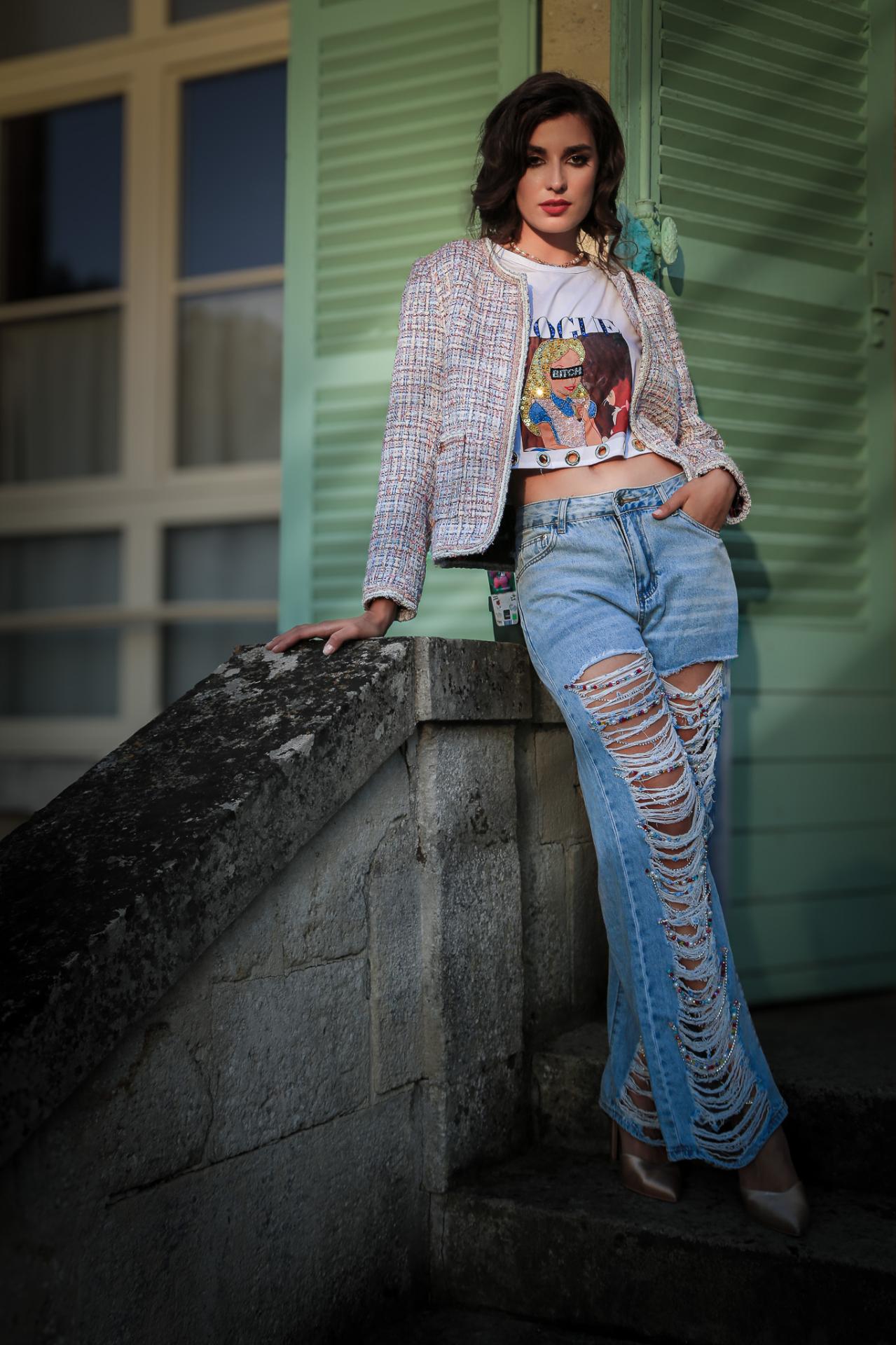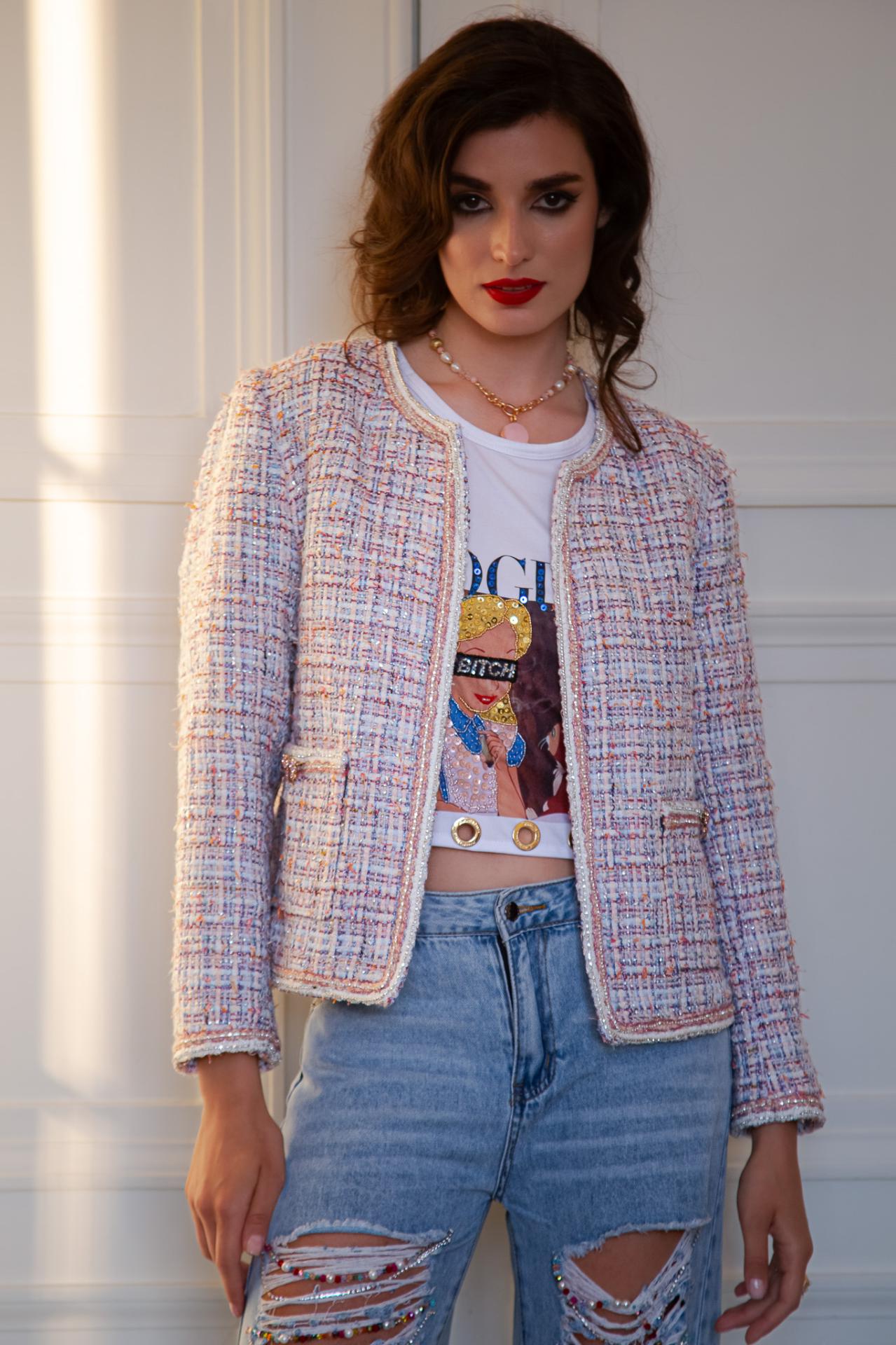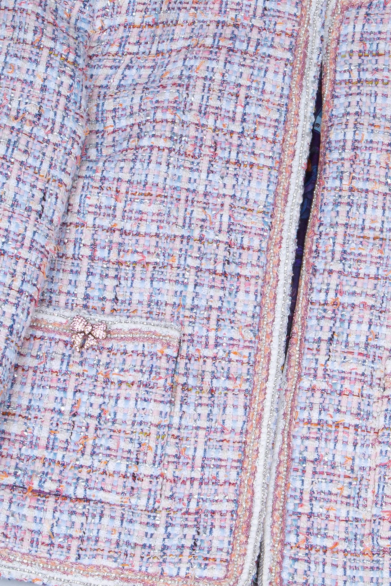 A pastel tweed jacket with soft colors and decorative pocket details.