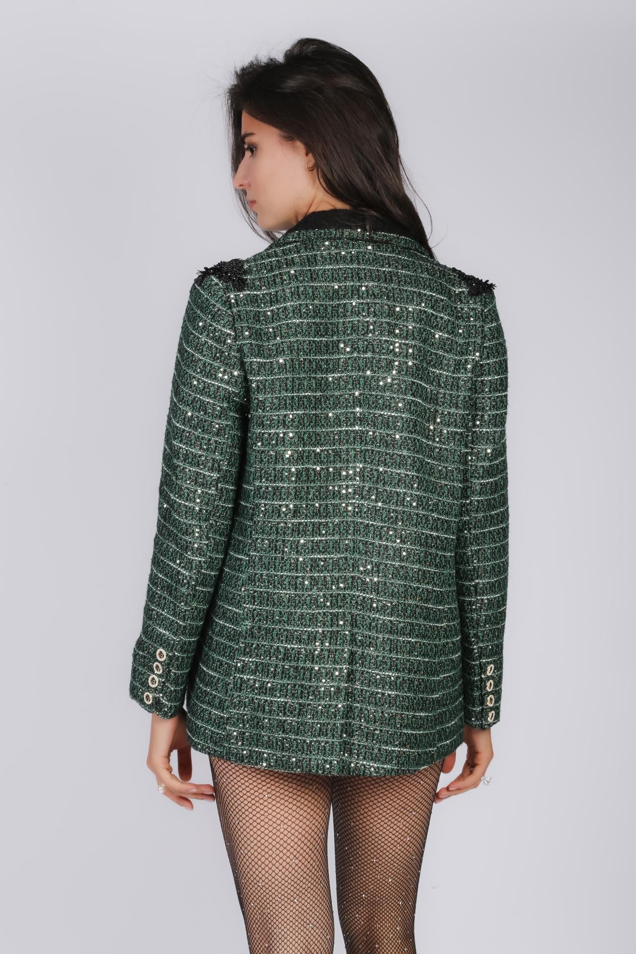 The Emerald Muse Jacket is a structured green tweed blazer enhanced with metallic threads and crystal buttons, combining classic tailoring with a touch of modern radiance.