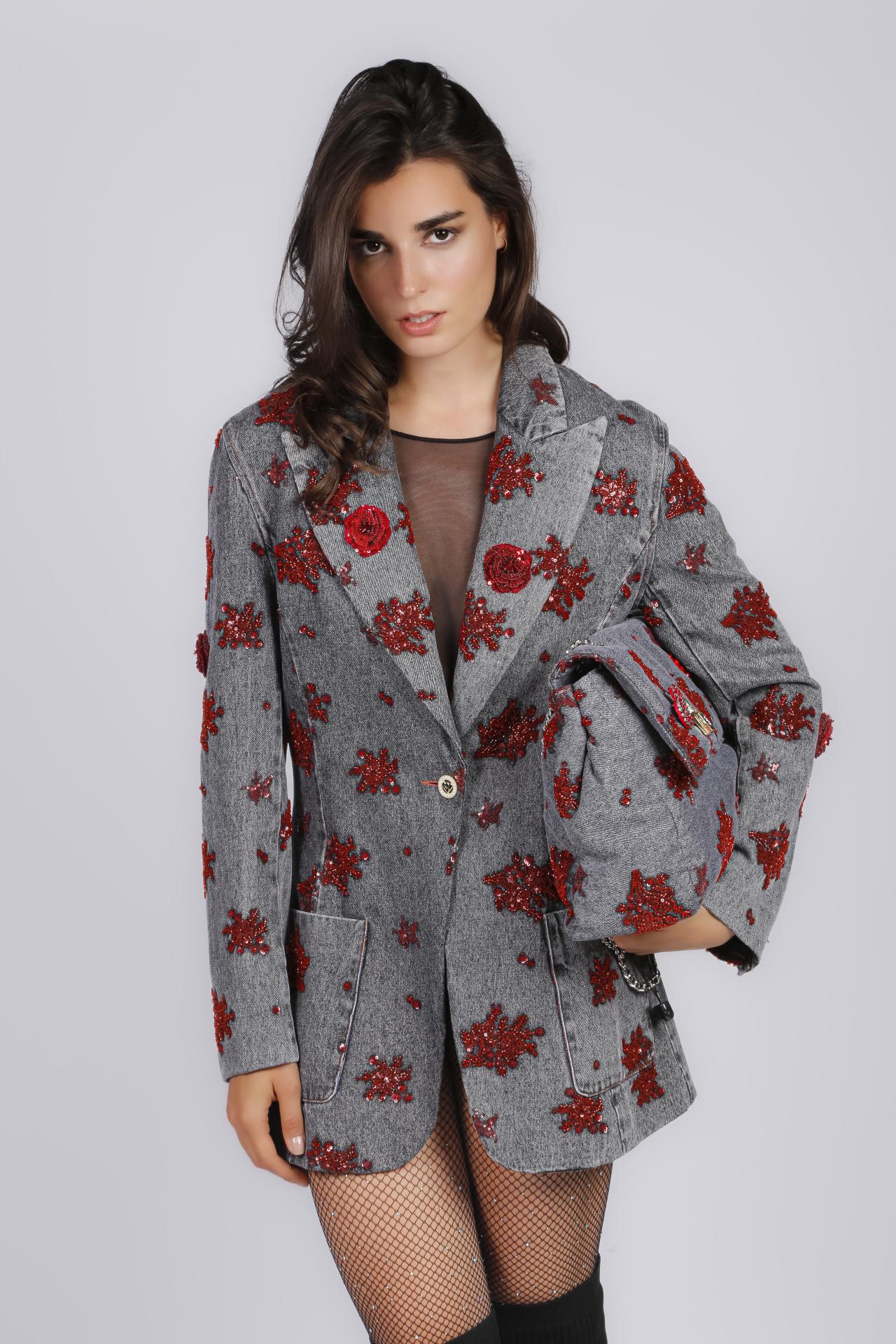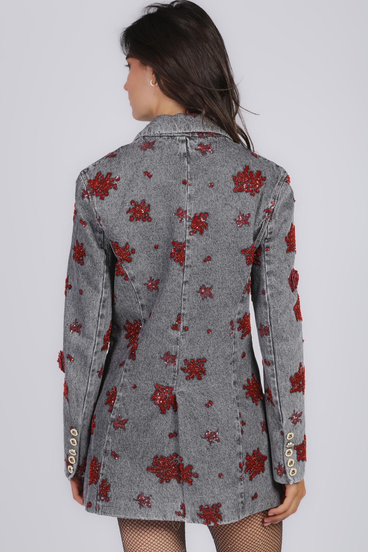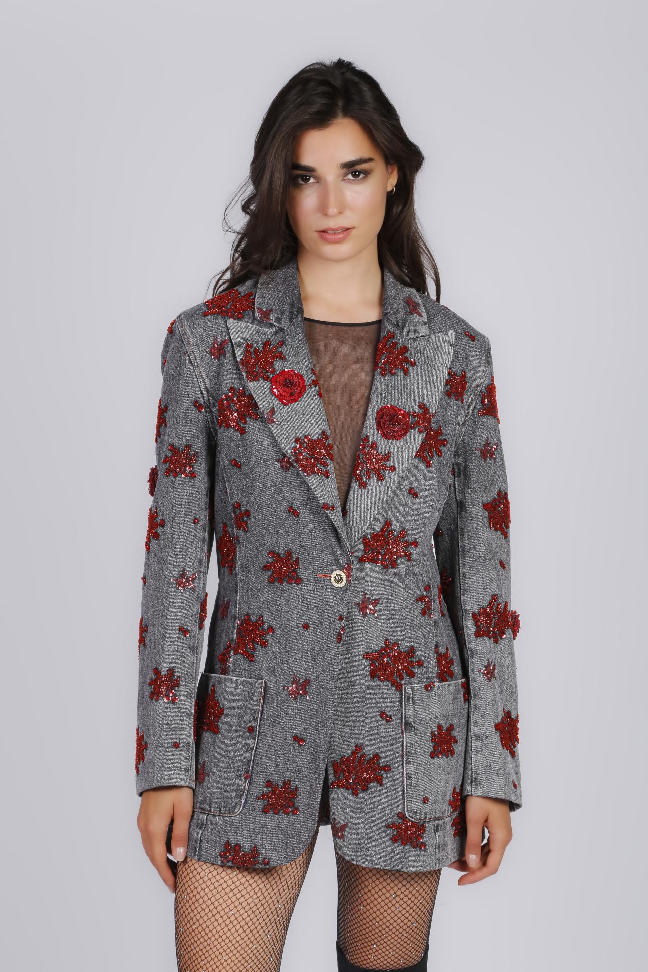 A grey tweed jacket adorned with rich red floral embroidery, tailored structure, and refined detailing. Elegant, romantic, and effortlessly statement-making.