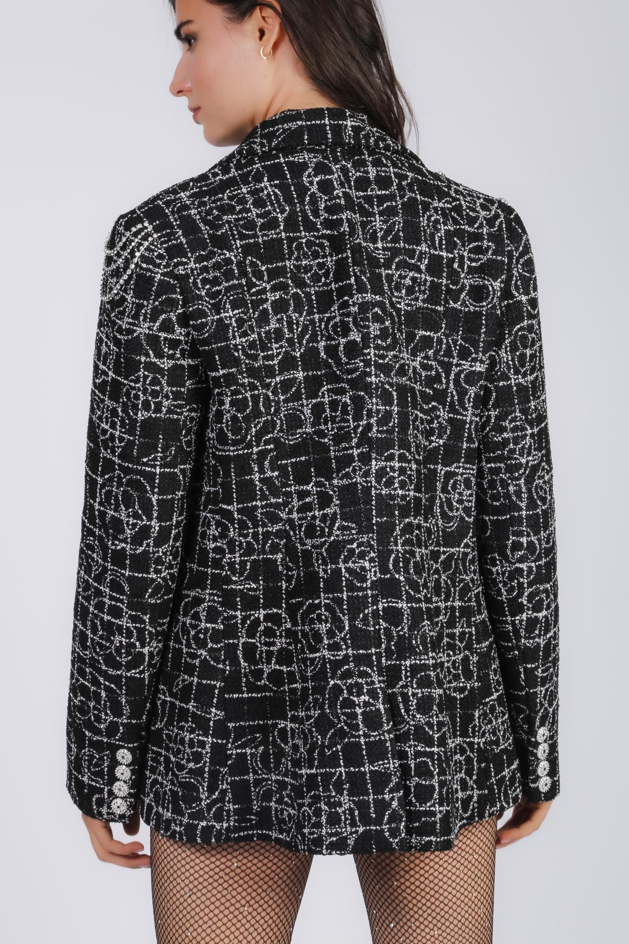 A black and white tweed jacket featuring a modern maze like pattern, structured tailoring, and refined detailing. Textured, contemporary, and effortlessly chic.
