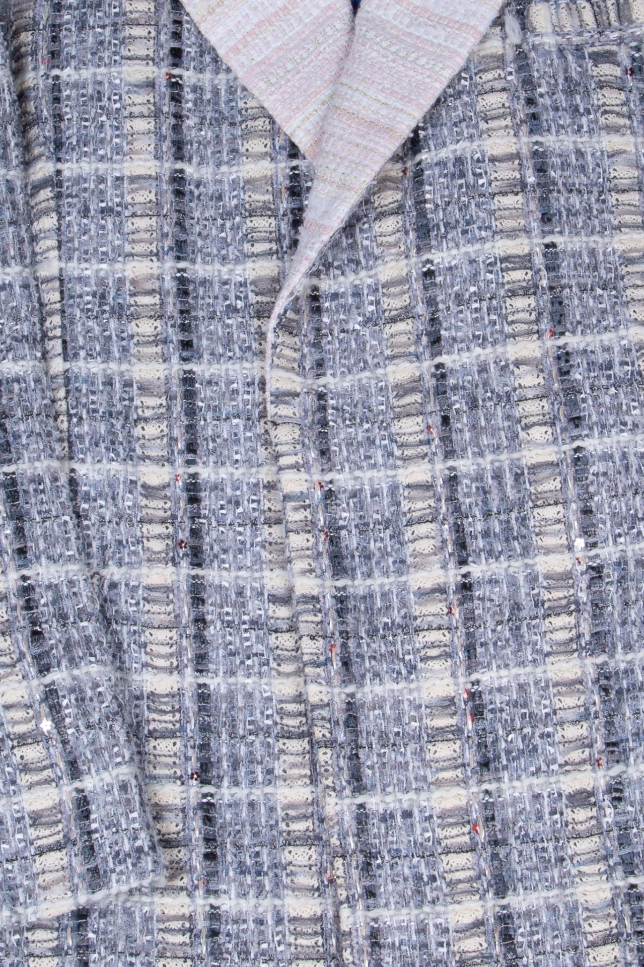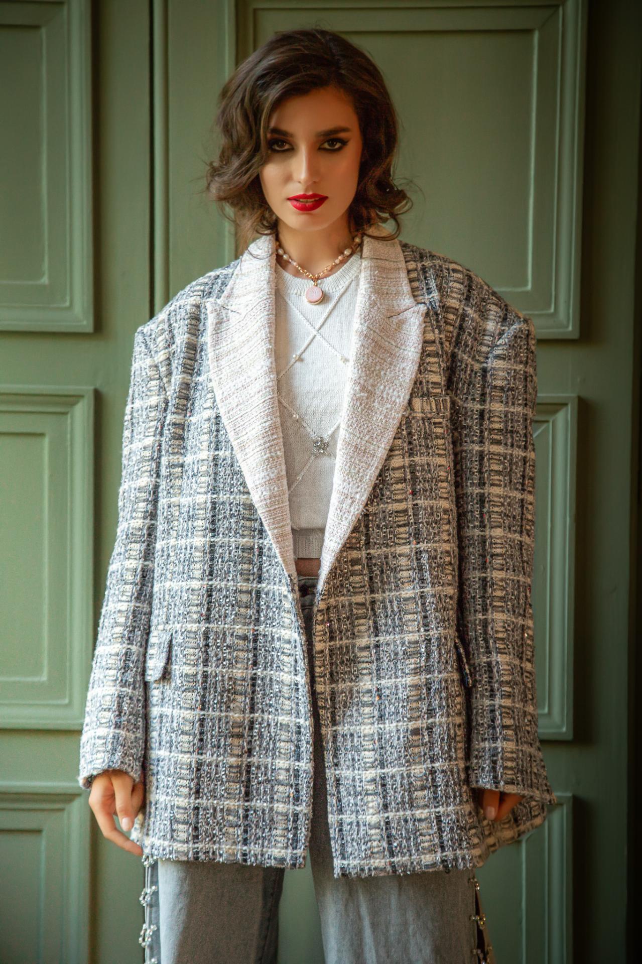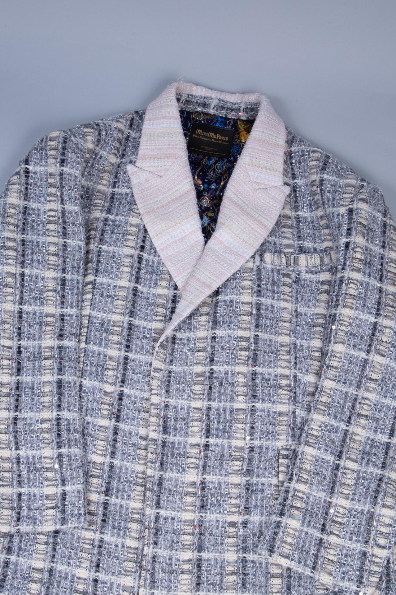 A grey tweed jacket with a soft check pattern and a light contrasting lapel.