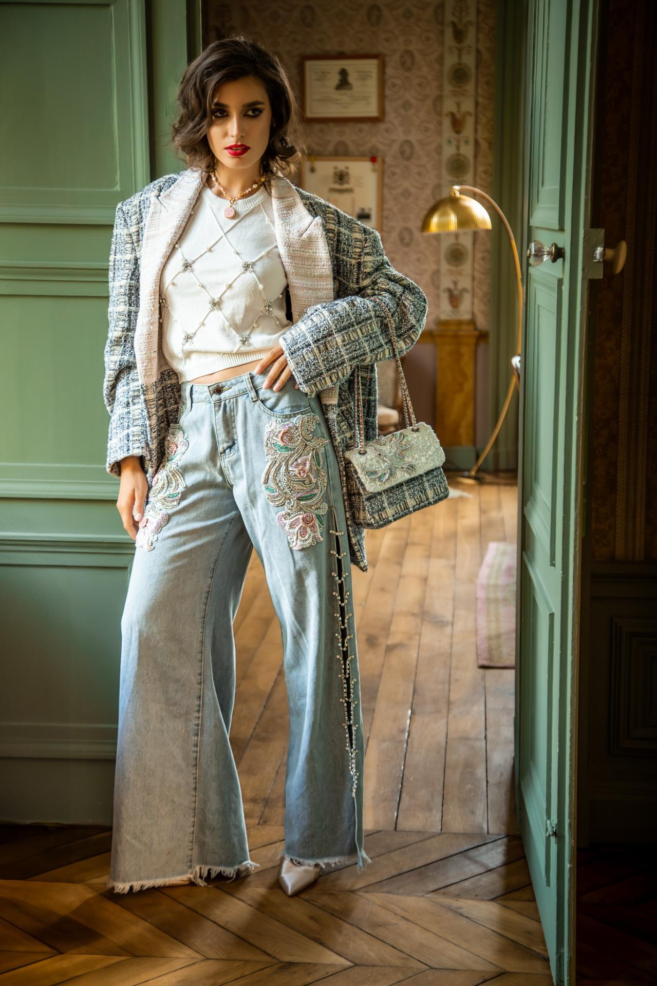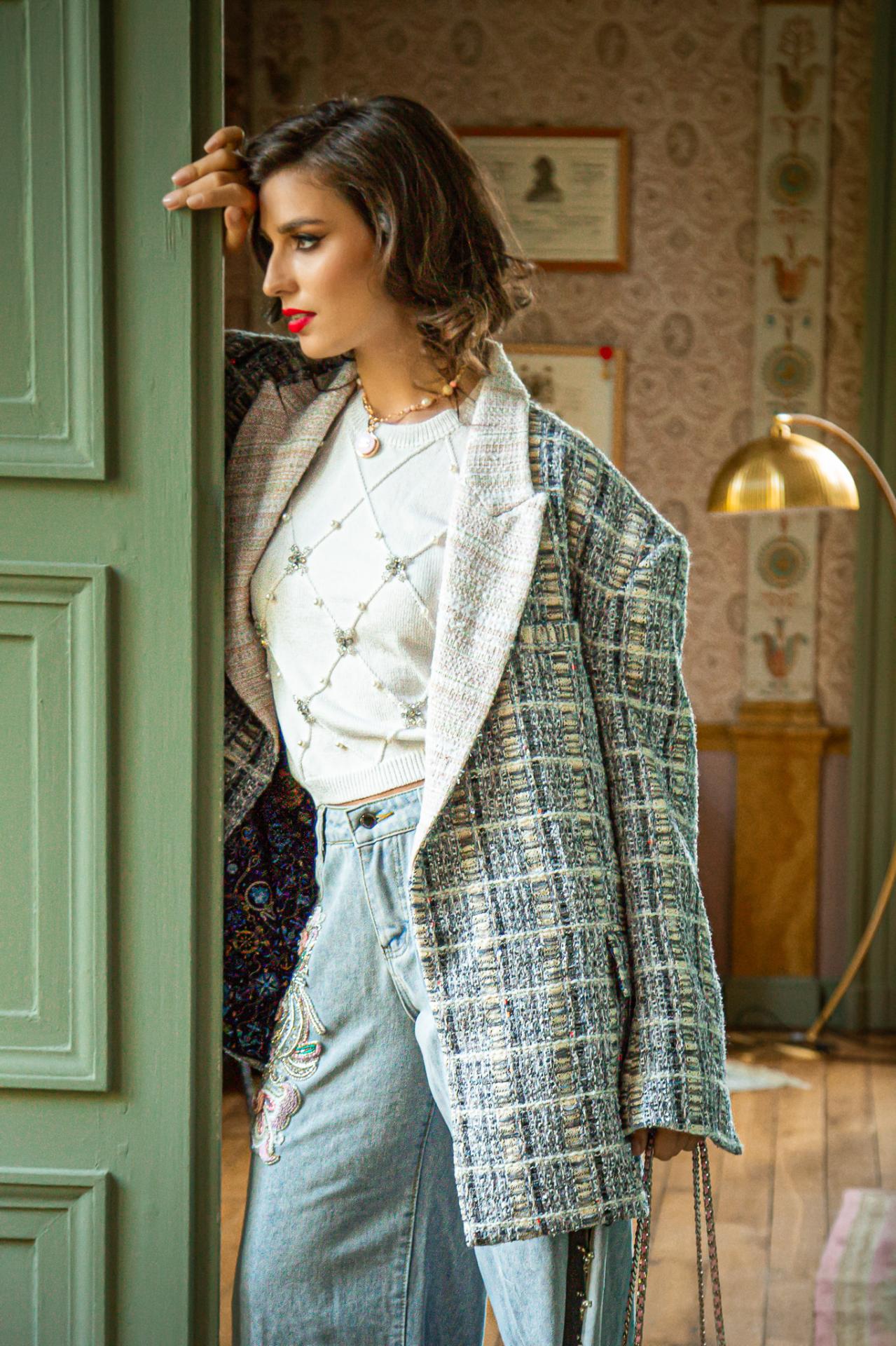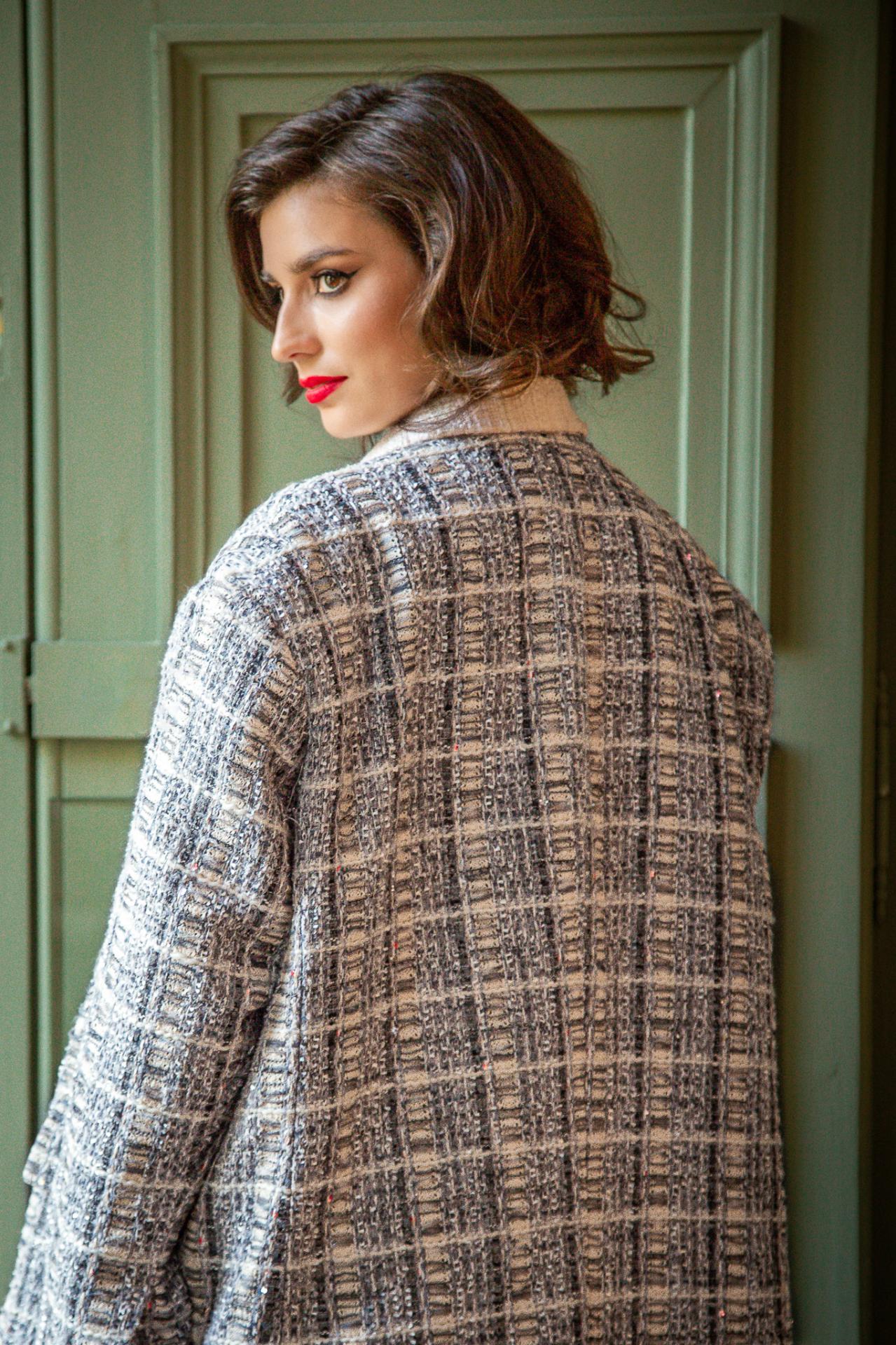 A grey tweed jacket with a soft check pattern and a light contrasting lapel.