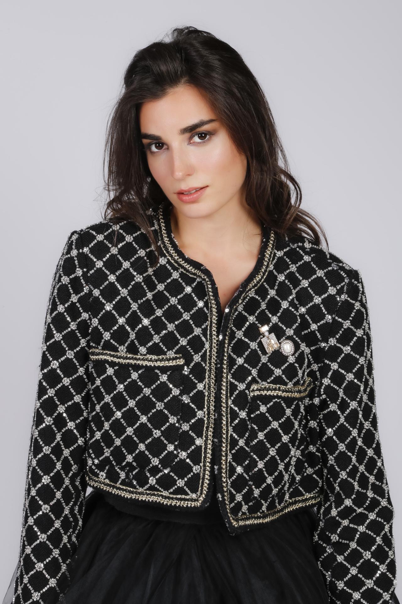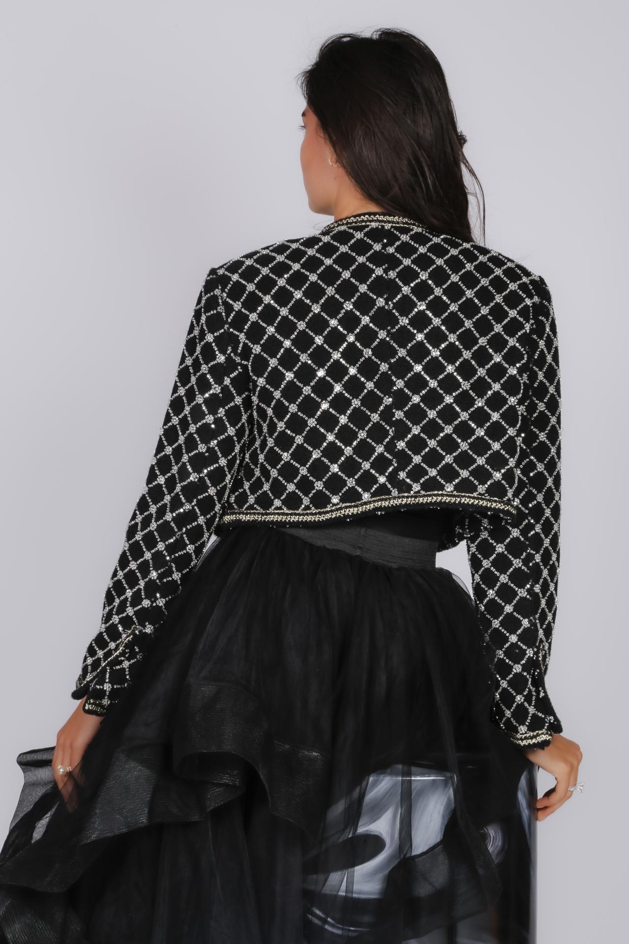 The Diamond Tweed Jacket combines classic Parisian elegance with modern structure, featuring a black and white diamond patterned tweed with metallic trim and signature embellishments.