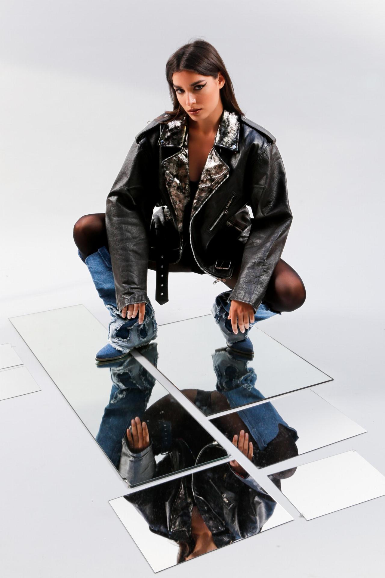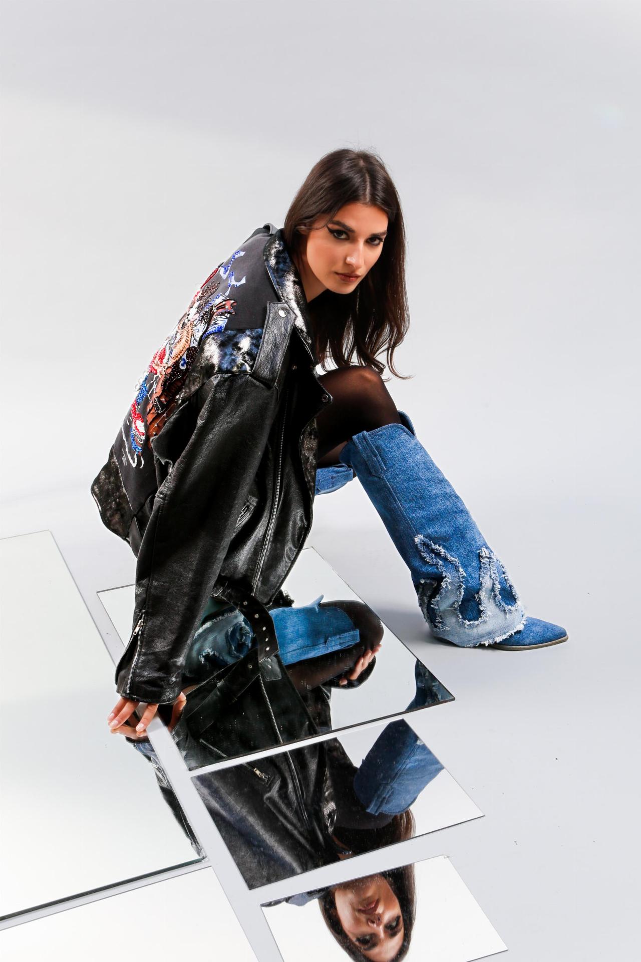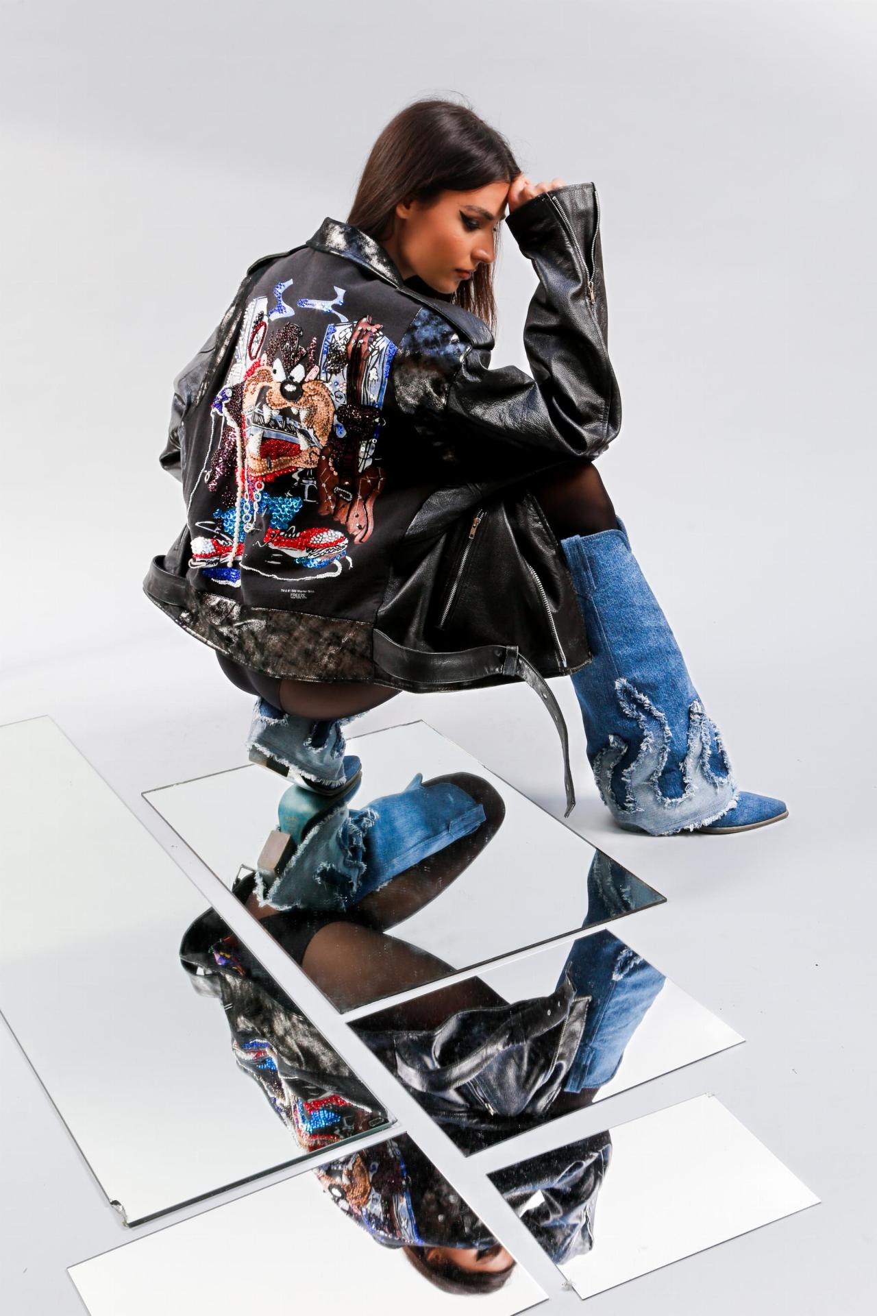 A black leather jacket with a large beaded cartoon-style design on the back.