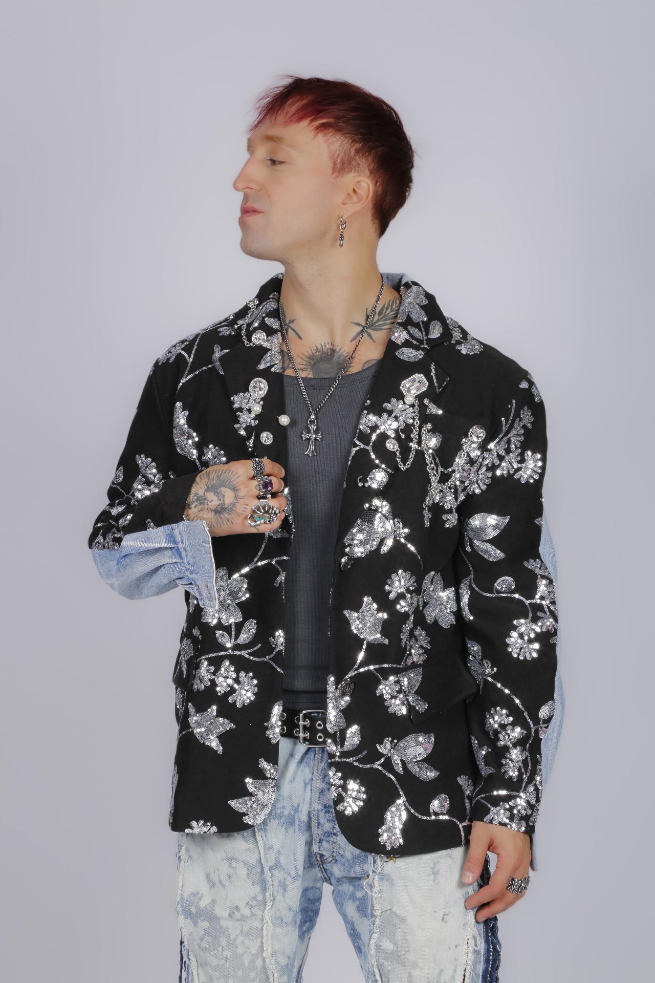 The Shadow Garden Jacket merges streetwear and elegance, featuring a contrasting design with floral black fabric on the front and light denim on the back for a bold and modern look.