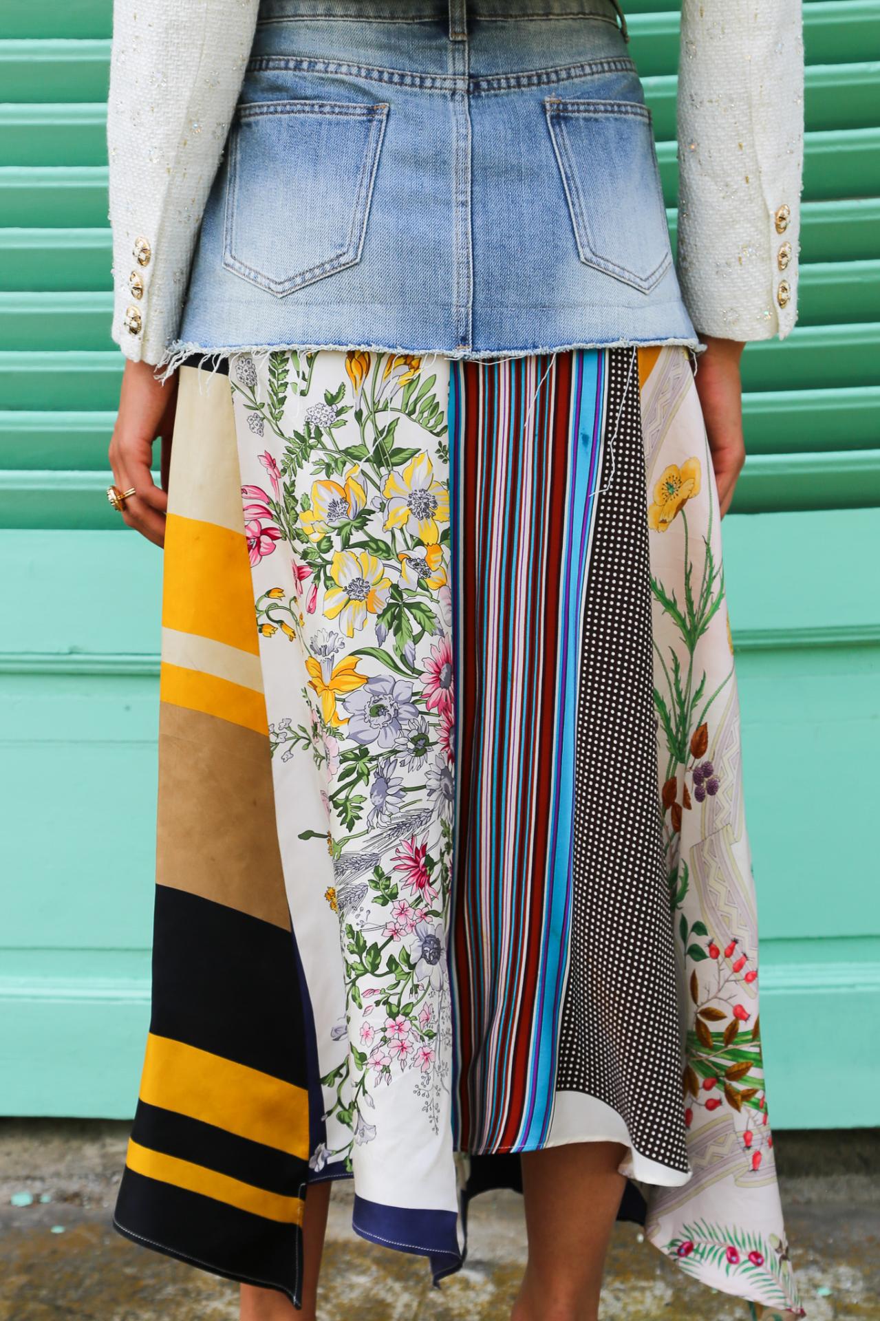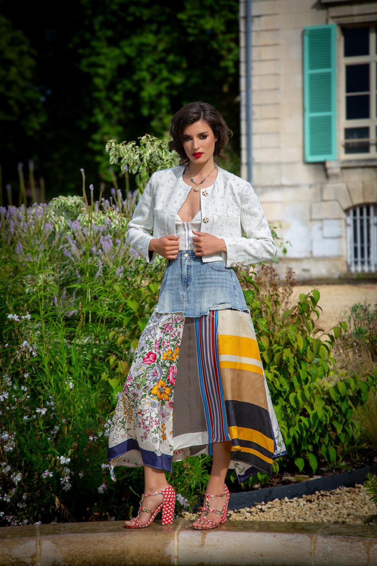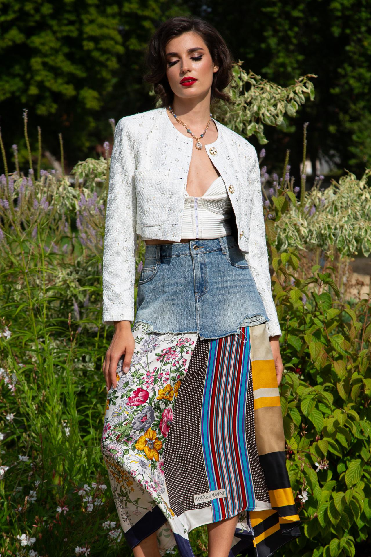The contrast between the structured denim and the light, flowing scarves offers a couture-inspired effect, making the skirt both eye-catching and effortlessly wearable. Each step brings the panels to life, revealing layers of color and texture that feel expressive, romantic, and free-spirited.