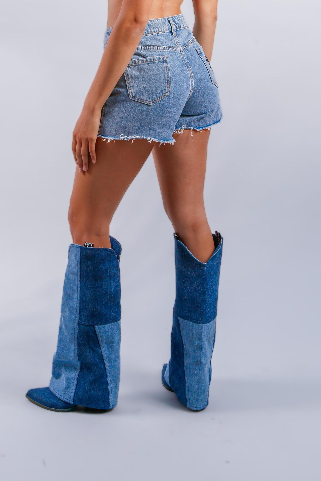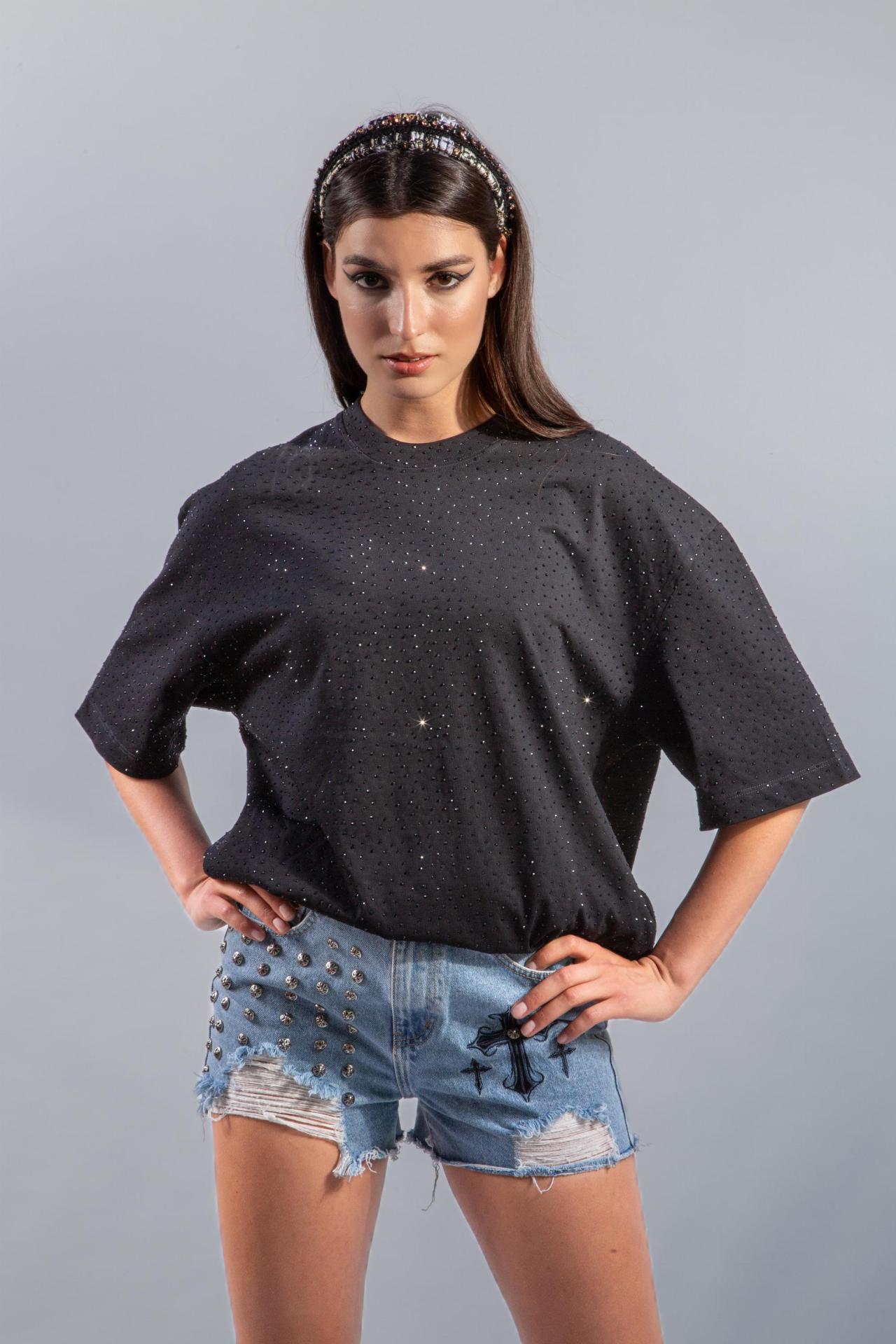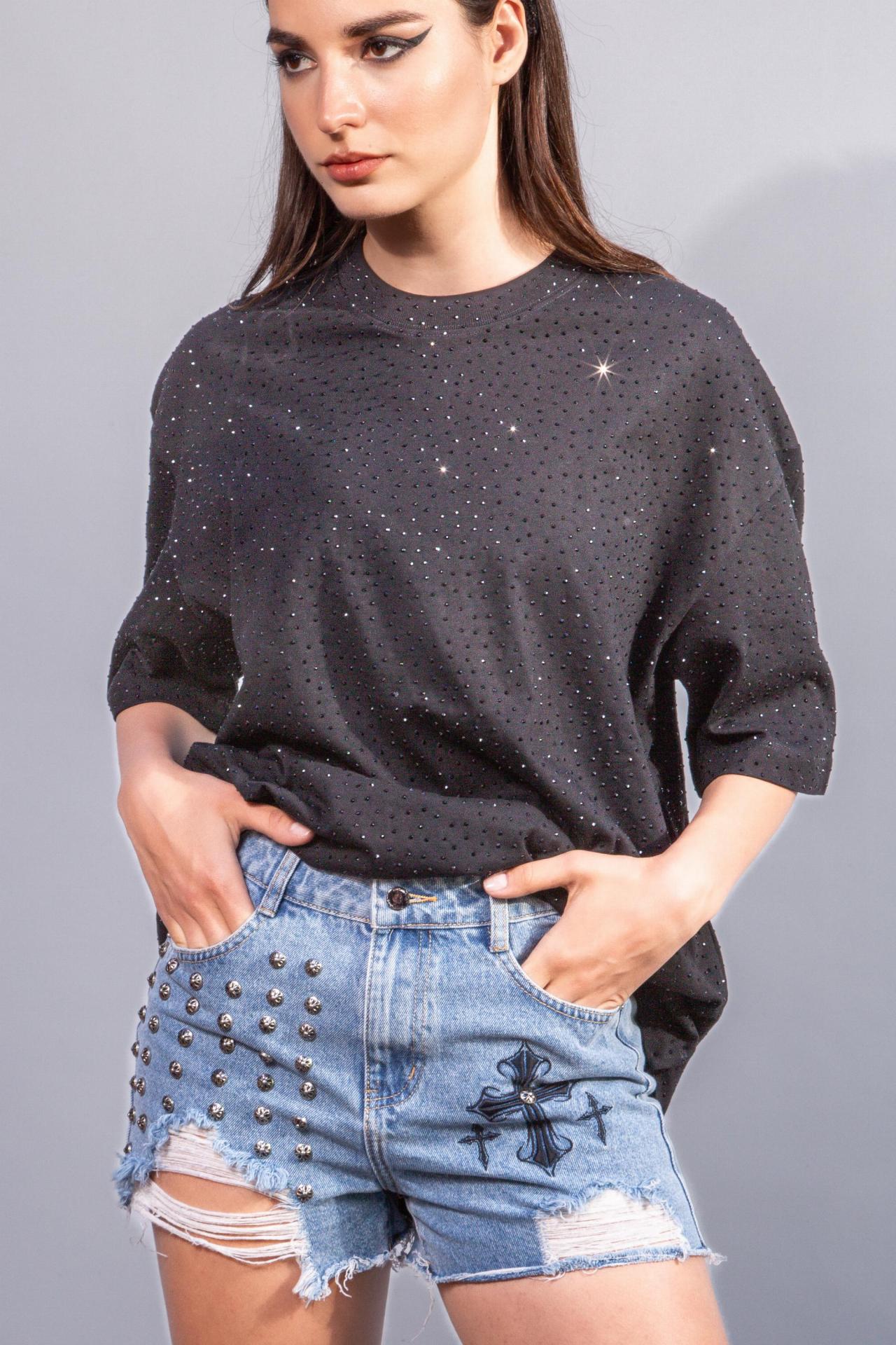 Embellished Denim Shorts adorned with scattered crystal studs and distressed detailing, blending casual attitude with a touch of luminous sparkle.