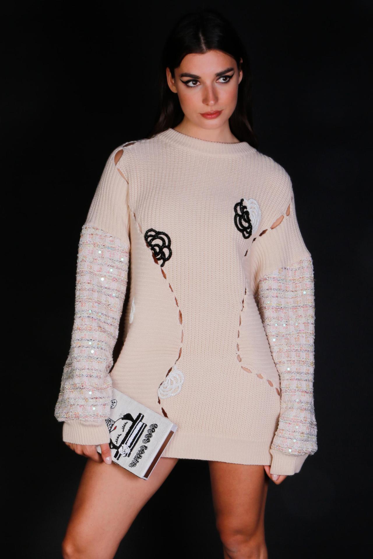 A beige knit sweater with cutouts floral patches and sparkly tweed sleeves.