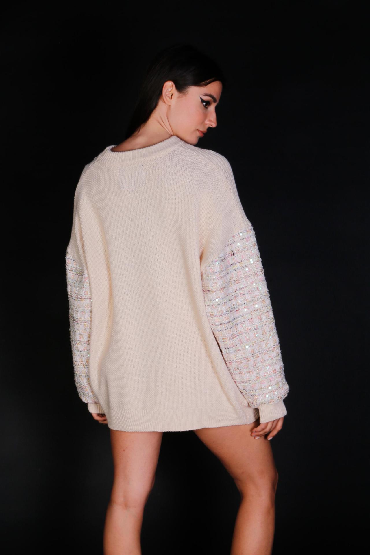 Beige Sweater with Cutouts and Sparkly Tweed Sleeves