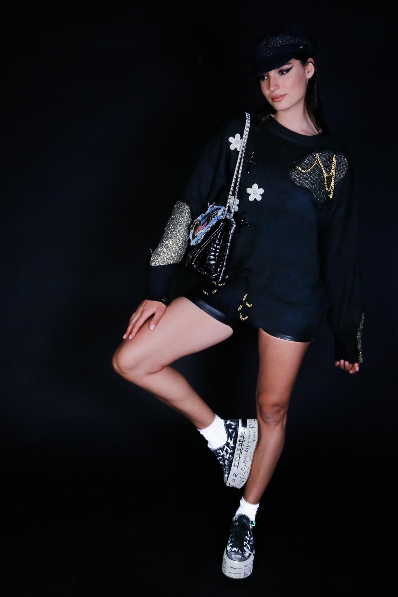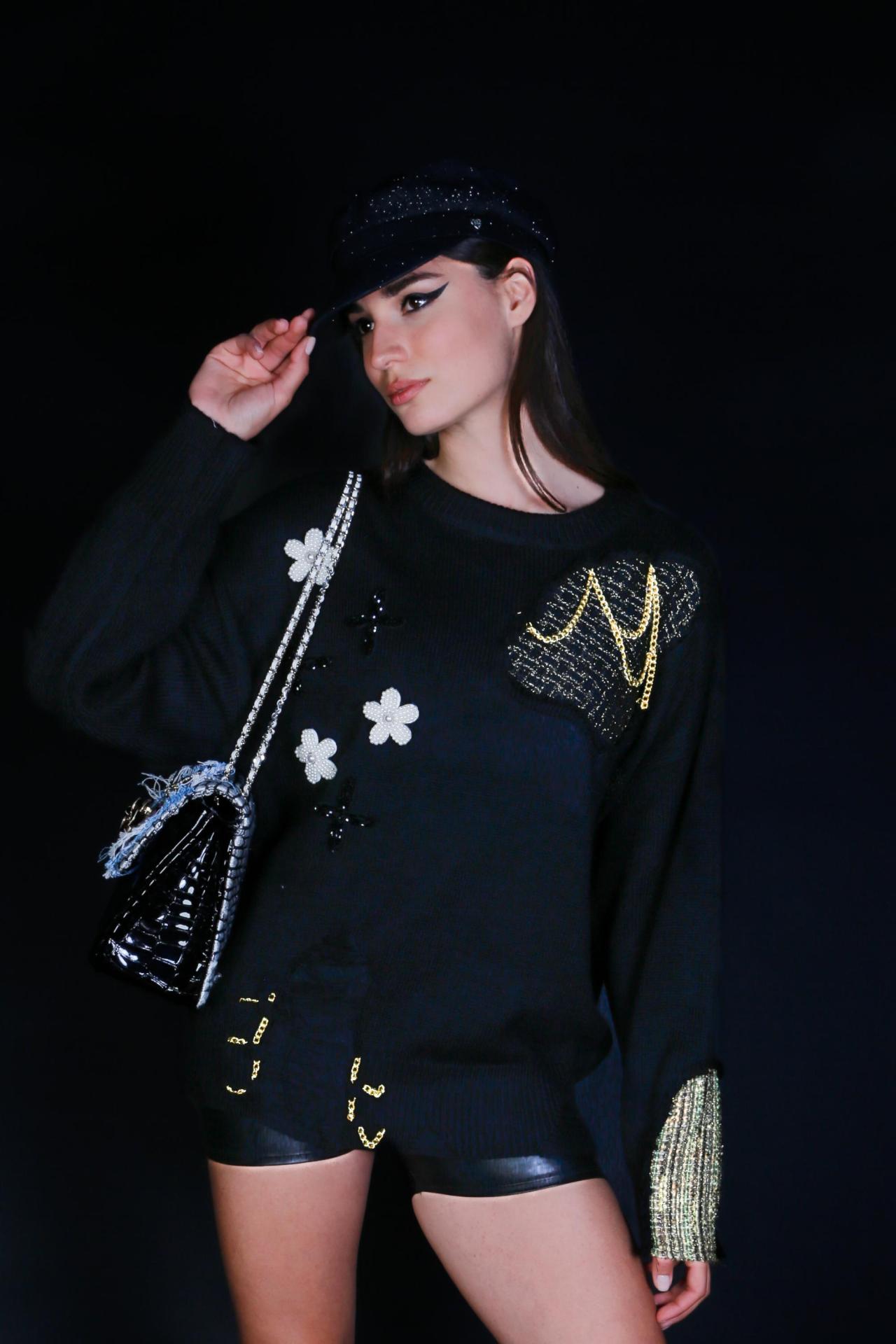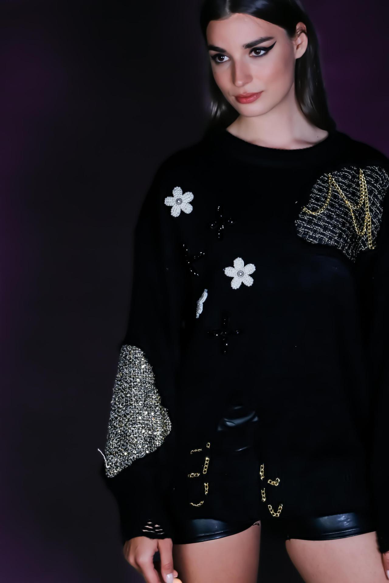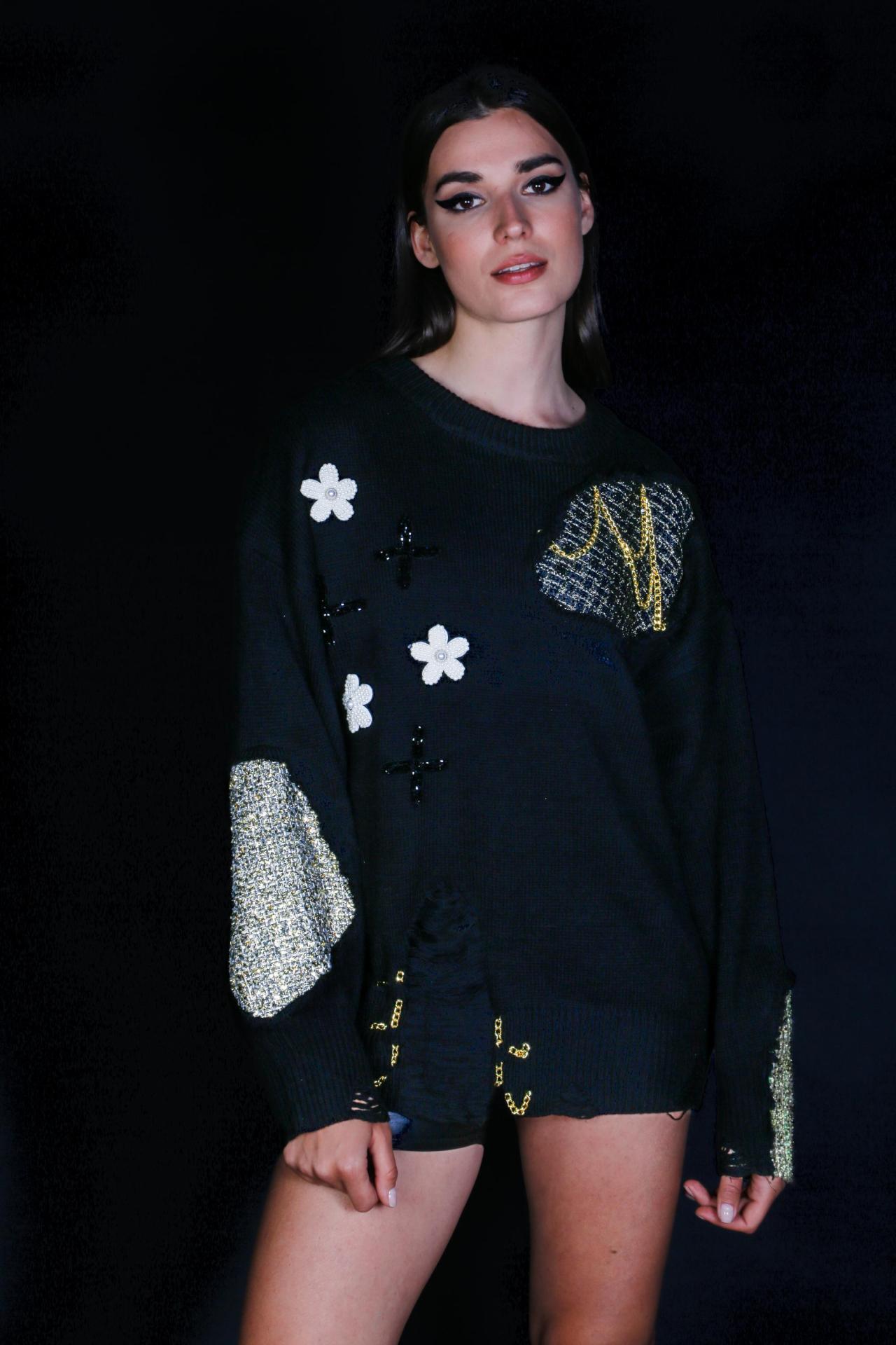 A black knit sweater with tweed patches floral accents and embroidered crosses.