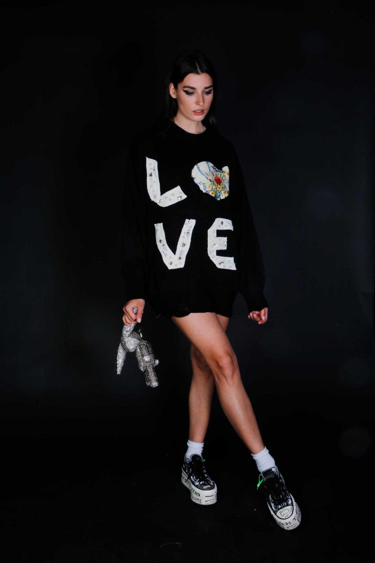 A black sweater with “LOVE” fabric patches and a floral heart applique.