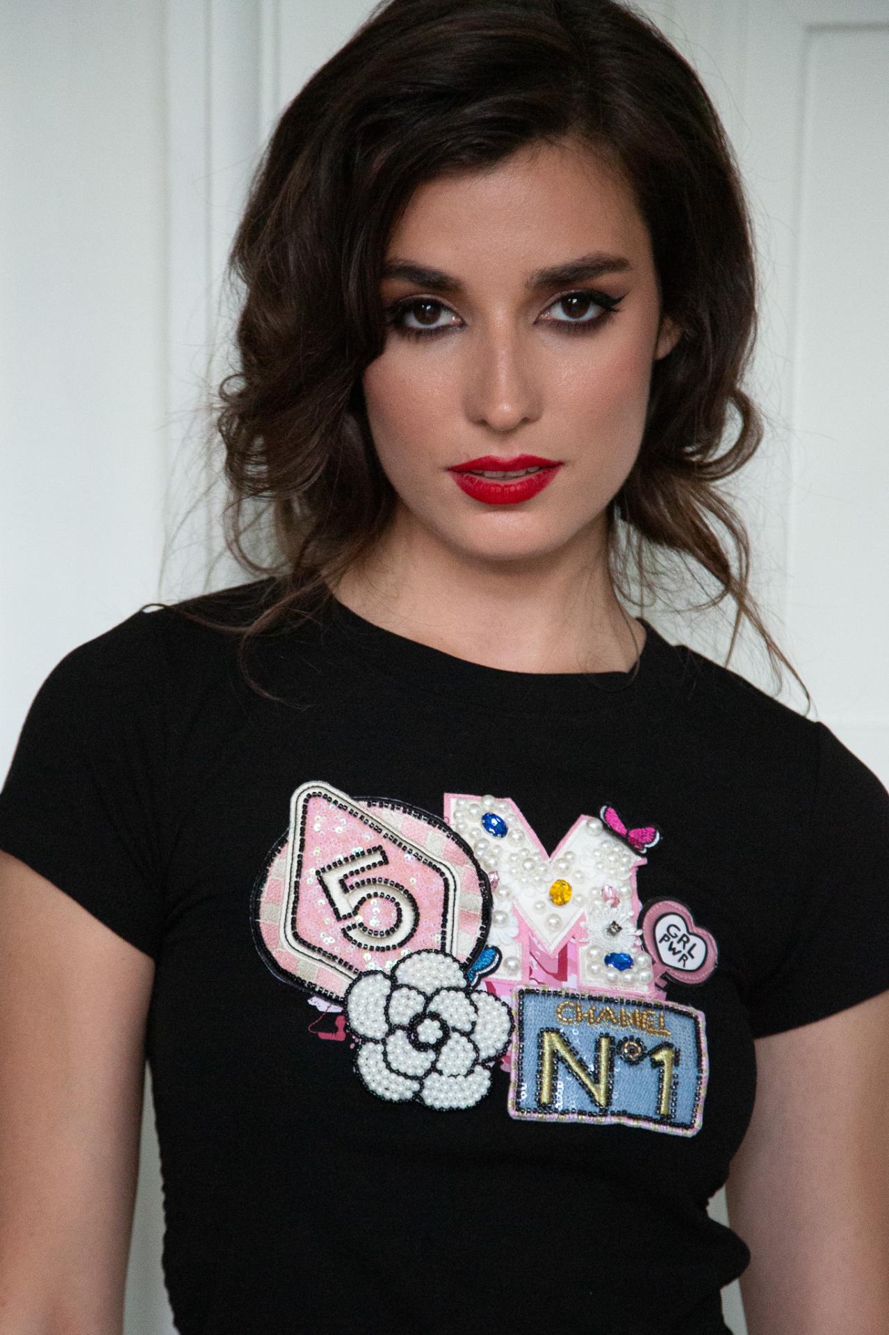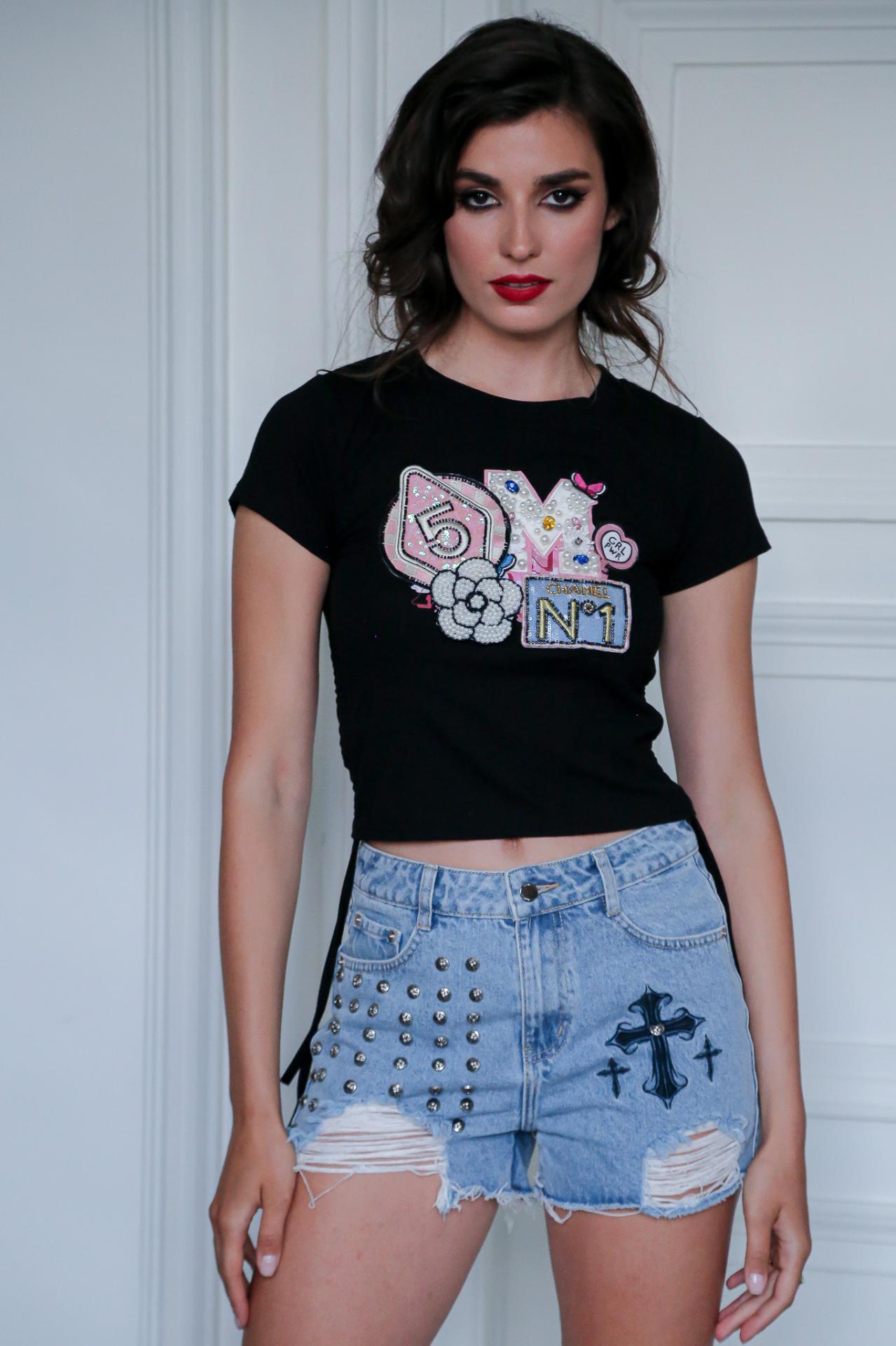 A black crop top with colorful embellished patches.
