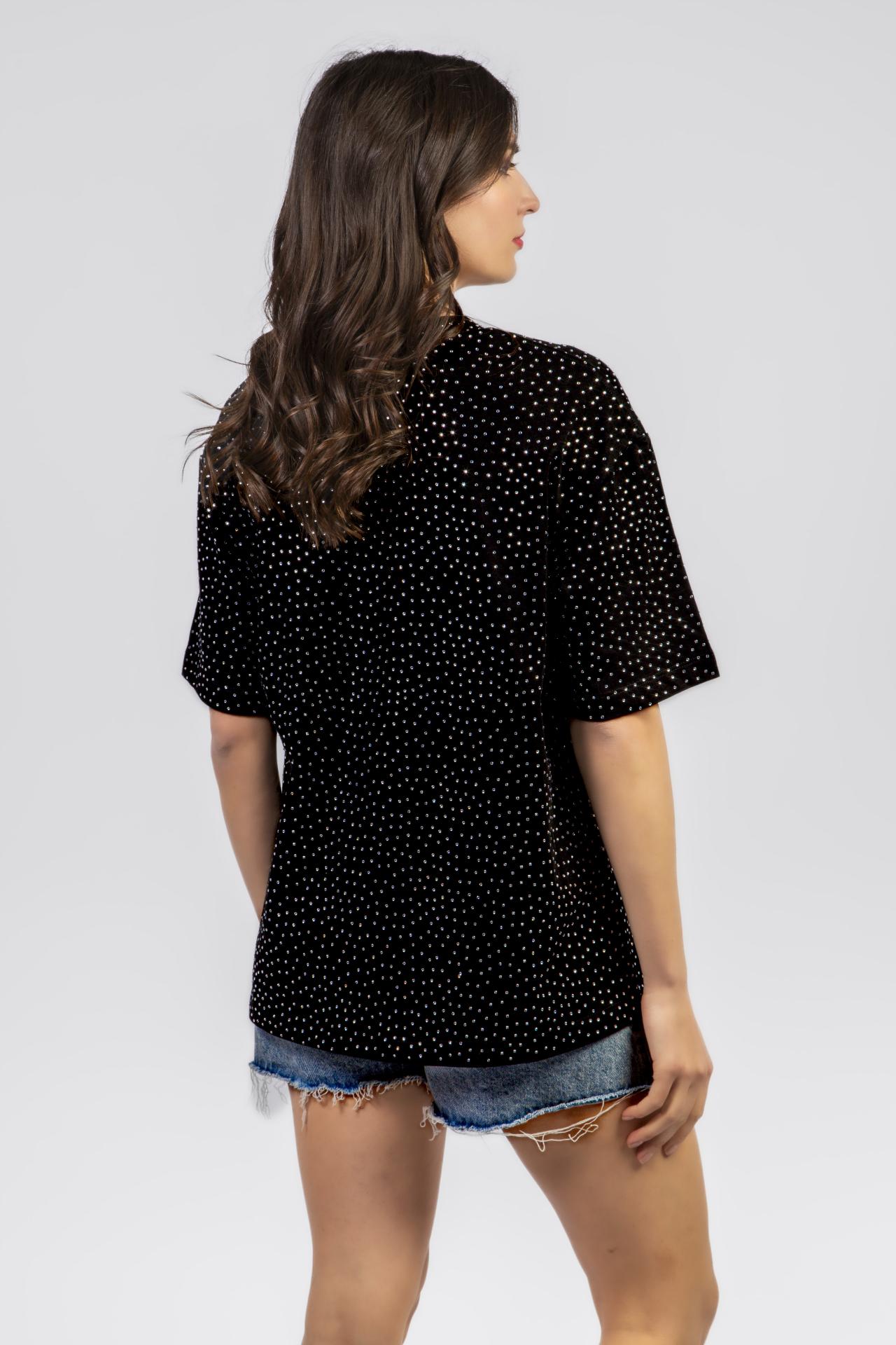 A black oversized tee adorned with micro-crystals and a bold Pink Panther-inspired graphic for a playful yet edgy night-ready look.